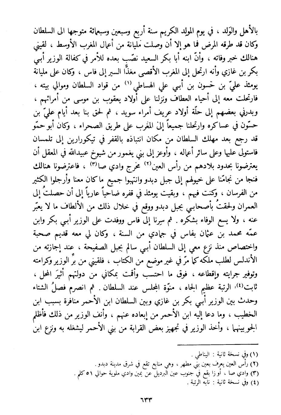 بالأهل والولد، في يوم المولد الكريم سنة أربع وسبعين وسبعمائة متوجها الى السلطان وكان قد طرقه المرض فما هو إلا أن وصلت مليانة من أعمال المغرب الأوسط، لقيني هنالك خبر وفاته، وأنّ ابنه أبا بكر السعيد نصّب بعده للأمر في كفالة الوزير أبي بكر بن غازي وأنه ارتحل إلى المغرب الأقصى مغذّا السير إلى فاس، وكان على مليانة يومئذ عليّ بن حسون بن أبي علي الهساطي [1] من قواد السلطان وموالي بيته، فارتحلت معه إلى أحياء العطاف ونزلنا على أولاد يعقوب بن موسى من أمرائهم، وبدرني بعضهم إلى حلّة أولاد عريف أمراء سويد، ثم لحق بنا بعد أيام عليّ بن حسّون في عساكره وارتحلنا جميعا إلى المغرب على طريق الصحراء، وكان أبو حمّو قد رجع بعد مهلك السلطان من مكان انتباذه بالقفر في تيكورارين إلى تلمسان فاستولى عليها وعلى سائر أعماله، وأوعز إلى بني يغمور من شيوخ عبيد الله في المعقل أن يعترضونا بحدود بلادهم من رأس العين [2] مخرج وادي صا [3] ، فاعترضونا هنالك فنجا من نجامّنا على خيولهم إلى جبل دبدو وانتهبوا جميع ما كان معنا وأرجلوا الكثير من الفرسان، وكنت فيهم، وبقيت يومئذ في قفره ضاحيا عاريا إلى أن حصلت إلى العمران ولحقت بأصحابي بجبل دبدو ووقع في خلال ذلك من الألطاف ما لا يعبّر عنه، ولا يسع الوفاء بشكره. ثم سرنا إلى فاس ووفدت على الوزير أبي بكر وابن عمّه محمد بن عثمان بفاس في جمادى من السنة، وكان لي معه قديم صحبة واختصاص منذ نزع معي إلى السلطان أبي سالم بجبل الصفيحة، عند إجازته من الأندلس لطلب ملكه كما مرّ في غير موضع من الكتاب، فلقيني من برّ الوزير وكرامته وتوفير جرايته وإقطاعه، فوق ما احتسب وأقمت بمكاني من دولتهم أثير المحل، ثابت [4] الرتبة عظيم الجاه، منوّة المجلس عند السلطان. ثم انصرم فصل الشتاء وحدث بين الوزير أبي بكر بن غازي وبين السلطان ابن الأحمر منافرة بسبب ابن الخطيب، وما دعا إليه ابن الأحمر من إبعاده عنهم، وأنف الوزير من ذلك فأظلم الجو بينهما، وأخذ الوزير في تجهيز بعض القرابة من بني الأحمر ليشغله به ونزع ابن