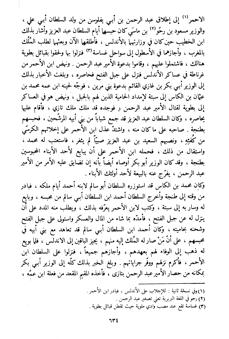 الأحمر [1] إلى إطلاق عبد الرحمن بن أبي يفلوسن من ولد السلطان أبي علي، والوزير مسعود بن رحّو [2] بن ماسي كان حبسهما أيام السلطان عبد العزيز وأشار بذلك ابن الخطيب حين كان في وزارتهما بالأندلس، فأطلقهما الآن وبعثهما لطلب الملك بالمغرب، وأجازهما في الأسطول إلى سواحل غساسة [3] فنزلوا بها ولحقوا بقبائل بطوية هنالك، فاشتملوا عليهم، وقاموا بدعوة الأمير عبد الرحمن. ونهض ابن الأحمر من غرناطة في عساكر الأندلس فنزل على جبل الفتح فحاصره، وبلغت الأخبار بذلك إلى الوزير أبي بكر بن غازي القائم بدعوة بني مرين، فوجّه لحينه ابن عمه محمد بن عثمان بن الكاس إلى سبتة لإمداد الحامية الذين لهم بالجبل، ونهض هو في العساكر إلى بطوية لقتال الأمير عبد الرحمن، فوجده قد ملك ملك تازي، فأقام عليها يحاصره، وكان السلطان عبد العزيز قد جمع شبابا من بني أبيه المرشّحين، فحبسهم بطنجة. صاحبه على ما كان منه، واشتدّ عذل ابن الأحمر على إخلائهم الكرسيّ من كفئه، ونصبهم السعيد بن عبد العزيز صبيّا لم يثغر، فاستعتب له محمد، واستقال من ذلك، فحمله ابن الأحمر على أن يبايع لأحد الأبناء المحبوسين بطنجة، وقد كان الوزير أبو بكر أوصاه أيضا بأنه إن تضايق عليه الأمر من الأمير عبد الرحمن، يفرّج عنه بالبيعة لأحد أولئك الأبناء.