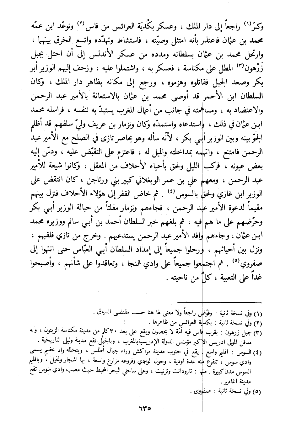 وكرّ [1] راجعا إلى دار الملك، وعسكر بكدية العرائس من فاس [2] وتوعّد ابن عمّه محمد بن عثمان فاعتذر بأنه امتثل وصيّته، فاستشاط وتهدّده واتسع الخرق بينهما، وارتحل محمد بن عثمان بسلطانه ومدده من عسكر الأندلس إلى أن احتل بجبل زرهون [3] المطل على مكناسة، فعسكر به، واشتملوا عليه، وزحف إليهم الوزير أبو بكر وصعد الجبل فقاتلوه وهزموه، ورجع إلى مكانه بظاهر دار الملك، وكان السلطان ابن الأحمر قد أوصى محمد بن عثمان بالاستعانة بالأمير عبد الرحمن والاعتضاد به، ومساهمته في جانب من أعمال المغرب يستبدّ به لنفسه، فراسله محمد ابن عثمان في ذلك، واستدعاه واستمدّه وكان ونزمار بن عريف وليّ سلفهم قد أظلم الجوّ بينه وبين الوزير أبي بكر، لأنّه سأله وهو يحاصر تازى في الصلح مع الأمير عبد الرحمن فامتنع، واتهمه بمداخلته والميل له، فاعتزم على التقبّض عليه، ودسّ إليه بعض عيونه، فركب الليل ولحق بأحياء الأحلاف من المعقل، وكانوا شيعة للأمير عبد الرحمن، ومعهم علي بن عمر الويغلاني كبير بني ورتاجن، كان انتقض على الوزير ابن غازي ولحق بالسوس [4] . ثم خاض القفر إلى هؤلاء الأحلاف فنزل بينهم مقيما لدعوة الأمير عبد الرحمن، فجاءهم ونزمار مفلتا من حبالة الوزير أبي بكر وحرّضهم على ما هم فيه، ثم بلغهم خبر السلطان أحمد بن أبي سالم ووزيره محمد ابن عثمان، وجاءهم وافد الأمير عبد الرحمن يستدعيهم. وخرج من تازي فلقيهم، ونزل بين أحيائهم، ورحلوا جميعا إلى إمداد السلطان أبي العبّاس حتى انتهوا إلى صفروي [5] . ثم اجتمعوا جميعا على وادي النجا، وتعاقدوا على شأنهم، وأصبحوا غدا على التعبية، كل من ناحيته.