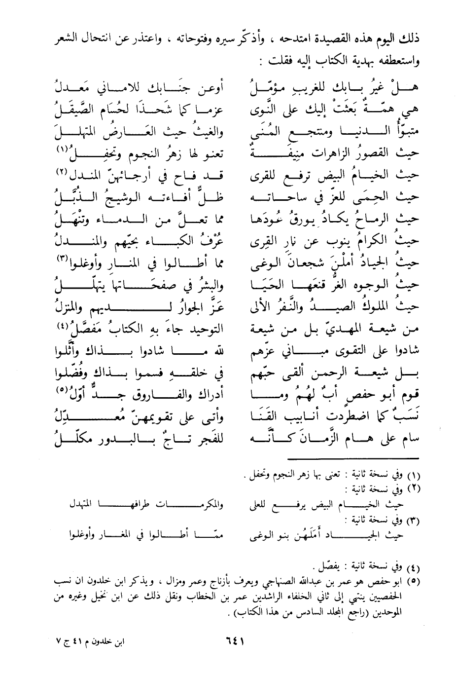 [5] ابو حفص هو عمر بن عبد الله الصنهاجي ويعرف بأزناج وعمر ومزال، ويذكر ابن خلدون ان نسب الحفصيين ينتهي إلى ثاني الخلفاء الراشدين عمر بن الخطاب ونقل ذلك عن ابن نخيل وغيره من الموحدين (راجع المجلد السادس من هذا الكتاب) . ابن خلدون م 41 ج 7