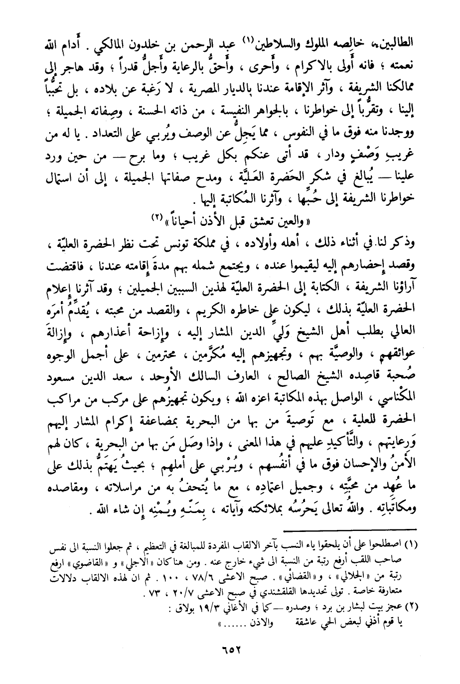 الطالبين، خالصة الملوك والسلاطين [1] عبد الرحمن بن خلدون المالكي. أدام الله نعمته، فإنه أولى بالإكرام، وأحرى، وأحقّ بالرعاية وأجلّ قدرا، وقد هاجر إلى ممالكنا الشريفة، وآثر الإقامة عندنا بالديار المصرية، لا رغبة عن بلاده، بل تحبّبا إلينا، وتقرّبا إلى خواطرنا، بالجواهر النفيسة، من ذاته الحسنة، وصفاته الجميلة، ووجدنا منه فوق ما في النفوس، مما يجلّ عن الوصف ويربي على التعداد. يا له من غريب وصف ودار، قد أتى عنكم بكل غريب، وما برح- من حين ورد علينا- يبالغ في شكر الحضرة العليّة، ومدح صفاتها الجميلة، إلى أن استمال خواطرنا الشريفة إلى حبّها، وآثرنا المكاتبة إليها.