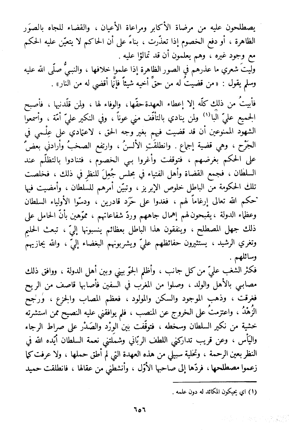 فأبيت من ذلك كلّه إلا إعطاء العهدة حقّها، والوفاء لها، ولمن قلّدنيها، فأصبح الجميع عليّ البا [1] ولمن ينادي بالتأفّف مني عونا، وفي النكير عليّ أمّة، وأسمعوا الشهود الممنوعين أن قد قضيت فيهم بغير وجه الحق، لاعتمادي على علمي في الجرح، وهي قضية إجماع. وانطلقت الألسن، وارتفع الصخب وأرادني بعض على الحكم بغرضهم، فتوقفت وأغروا بي الخصوم، فتنادوا بالتظلّم عند السلطان، فجمع القضاة وأهل الفتياء في مجلس جعل للنظر في ذلك، فخلصت تلك الحكومة من الباطل خلوص الإبريز، وتبيّن أمرهم للسلطان، وأمضيت فيها حكم الله تعالى إرغاما لهم، فغدوا على حرد قادرين، ودسّوا الأولياء السلطان وعظماء الدولة، يقبحون لهم إهمال جاههم وردّ شفاعاتهم، مموّهين بأنّ الحامل على ذلك جهل المصطلح، وينفقون هذا الباطل بعظائم ينسبونها إليّ، تبعث الحليم وتغري الرشيد، يستثيرون حفائظهم عليّ ويشربونهم البغضاء إليّ، والله يجازيهم وسائلهم.