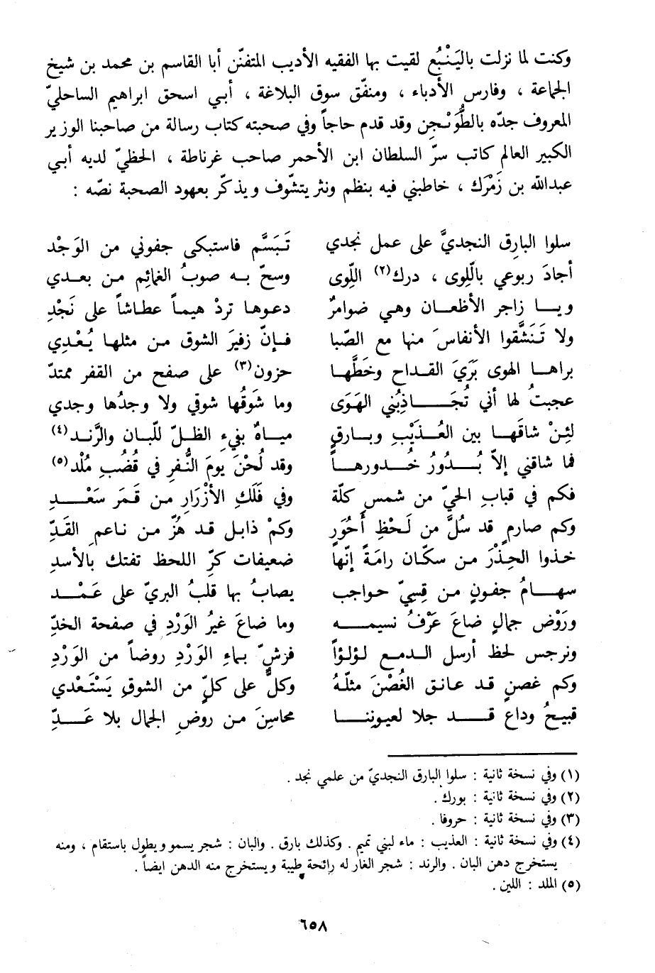 وكنت لما نزلت بالينبع لقيت بها الفقيه الأديب المتفنّن أبا القاسم بن محمد بن شيخ الجماعة، وفارس الأدباء، ومنفّق سوق البلاغة، أبي إسحاق إبراهيم الساحليّ المعروف جدّه بالطّويجن وقد قدم حاجا وفي صحبته كتاب رسالة من صاحبنا الوزير الكبير العالم كاتب سرّ السلطان ابن الأحمر صاحب غرناطة، الحظيّ لديه أبي عبد الله بن زمرك، خاطبني فيه بنظم ونثر يتشوّف ويذكّر بعهود الصحبة نصّه: