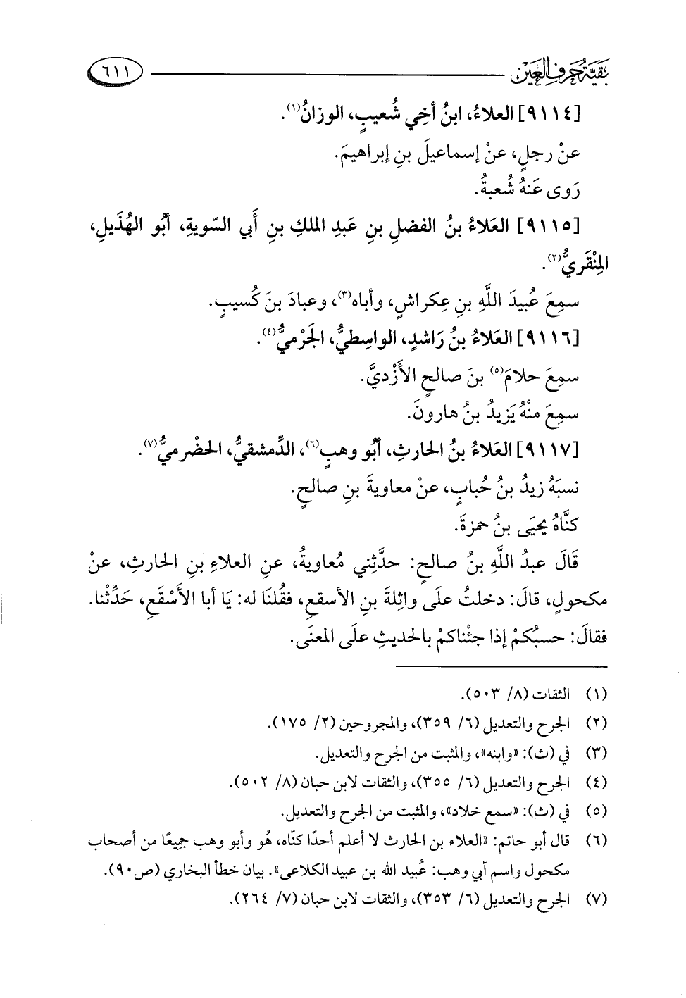 (¬٦) قال أبو حاتم: "العلاء بن الحارث لا أعلم أحدًا كنّاه، هُو وأبو وهب جمِيعًا من أصحاب مكحول واسم أبي وهب: عُبيد اللَّه بن عبيد الكلاعي". بيان خطأ البخاري (ص ٩٠).