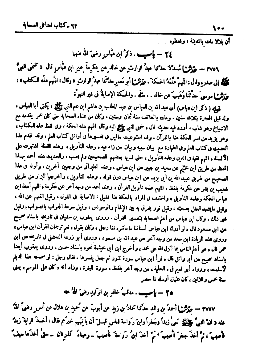 أَيْ عَبْدُ اللَّهِ بْنُ الْعَبَّاسِ بْنِ عبد الْمطلب بن هَاشم بن عَمِّ النَّبِيِّ صَلَّى اللَّهُ عَلَيْهِ وَسَلَّمَ يُكَنَّى أَبَا الْعَبَّاسِ وُلِدَ قَبْلَ الْهِجْرَةِ بِثَلَاثِ سِنِينَ وَمَاتَ بِالطَّائِفِ سَنَةَ ثَمَانٍ وَسِتِّينَ وَكَانَ مِنْ عُلَمَاءِ الصَّحَابَةِ حَتَّى كَانَ عُمَرُ يُقَدِّمُهُ مَعَ الْأَشْيَاخِ وَهُوَ شَابٌّ أَوْرَدَ فِيهِ حَدِيثَهُ قَالَ ضَمَّنِي النَّبِيُّ صَلَّى اللَّهُ عَلَيْهِ وَسَلَّمَ إِلَيْهِ وَقَالَ اللَّهُمَّ عَلِّمْهُ الْحِكْمَةَ وَفِي لَفْظٍ عَلِّمْهُ الْكِتَابَ وَهُوَ يُؤَيِّدُ مَنْ فَسَّرَ الْحِكْمَةَ هُنَا بِالْقُرْآنِ وَقَدِ اسْتَوْعَبْتُ مَا قِيلَ فِي تَفْسِيرِهَا فِي أَوَائِلِ كِتَابِ الْعِلْمِ وَقَدْ تَقَدَّمَ هَذَا الْحَدِيثُ فِي كِتَابِ الْعِلْمِ وَفِي الطَّهَارَةِ مَعَ بَيَانِ سَبَبِهِ وَبَيَانِ مَنْ زَادَ فِيهِ وَعَلِّمْهُ التَّأْوِيلَ وَهَذِهِ اللَّفْظَةُ اشْتُهِرَتْ عَلَى الْأَلْسِنَةِ اللَّهُمَّ فَقِّهْهُ فِي الدِّينِ وَعَلِّمْهُ التَّأْوِيلَ حَتَّى نَسَبَهَا بَعْضُهُمْ لِلصَّحِيحَيْنِ وَلَمْ يُصِبْ وَالْحَدِيثُ عِنْدَ أَحْمَدَ بِهَذَا اللَّفْظ من طَرِيق بن خَيْثَم عَن سعيد بن جُبَير عَن بن عَبَّاسٍ وَعِنْدَ الطَّبَرَانِيِّ مِنْ وَجْهَيْنِ آخَرَيْنِ وَأَوَّلُهُ فِي هَذَا الصَّحِيحِ مِنْ طَرِيقِ عُبَيْدِ اللَّهِ بْنِ أَبِي يَزِيدَ عَن بن عَبَّاسٍ دُونَ