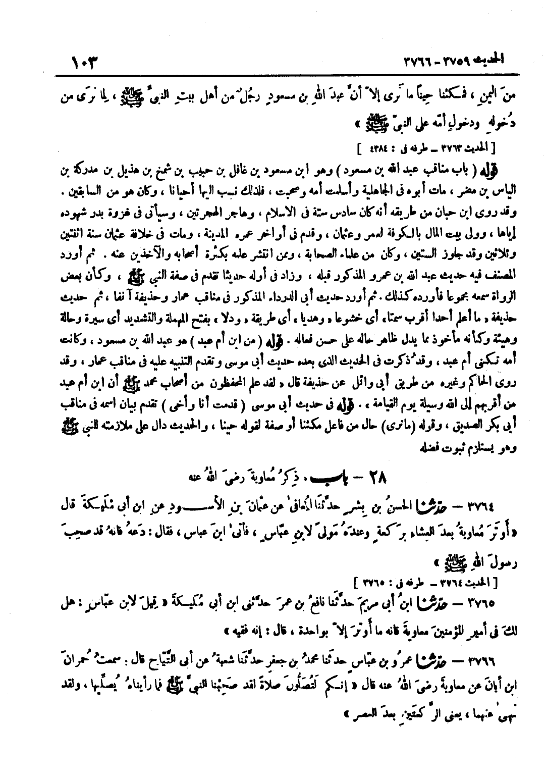 وَهُوَ بن مَسْعُودِ بْنِ غَافِلِ بْنِ حَبِيبِ بْنِ شَمْخِ بْنِ هُذَيْلِ بْنِ مُدْرِكَةَ بْنِ إِلْيَاسَ بْنِ مُضَرَ مَاتَ أَبُوهُ فِي الْجَاهِلِيَّةِ وَأَسْلَمَتْ أُمُّهُ وَصَحِبَتْ فَلِذَلِكَ نُسِبَ إِلَيْهَا أَحْيَانًا وَكَانَ هُوَ من السَّابِقين وَقد روى بن حِبَّانَ مِنْ طَرِيقِهِ أَنَّهُ كَانَ سَادِسَ سِتَّةٍ فِي الْإِسْلَامِ وَهَاجَرَ الْهِجْرَتَيْنِ وَسَيَأْتِي فِي غَزْوَةِ بَدْرٍ شُهُودُهُ إِيَّاهَا وَوَلِيَ بَيْتَ الْمَالِ بِالْكُوفَةِ لِعُمَرَ وَعُثْمَانَ وَقَدِمَ فِي أَوَاخِرِ عُمْرِهِ الْمَدِينَةَ وَمَاتَ فِي خِلَافَةِ عُثْمَانَ سَنَةَ اثْنَتَيْنِ وَثَلَاثِينَ وَقَدْ جَاوَزَ السِّتِّينَ وَكَانَ مِنْ عُلَمَاءِ الصَّحَابَةِ وَمِمَّنِ انْتَشَرَ عِلْمُهُ بِكَثْرَةِ أَصْحَابِهِ وَالْآخِذِينَ عَنْهُ ثُمَّ أَوْرَدَ الْمُصَنِّفُ فِيهِ حَدِيثَ عَبْدِ اللَّهِ بْنِ عَمْرِو الْمَذْكُورَ قَبْلَهُ وَزَادَ فِي أَوَّلِهِ حَدِيثًا تَقَدَّمَ فِي صِفَةِ النَّبِيِّ صَلَّى اللَّهُ عَلَيْهِ وَسَلَّمَ وَكَأَنَّ بَعْضَ الرُّوَاةِ سَمِعَهُ مَجْمُوعًا فَأَوْرَدَهُ كَذَلِكَ ثُمَّ أَوْرَدَ حَدِيثَ أَبِي الدَّرْدَاءِ الْمَذْكُورَ فِي مَنَاقِبِ عَمَّارٍ وَحُذَيْفَةَ آنِفًا ثُمَّ حَدِيث حُذَيْفَة مَا اعْلَم أحدا أقرب سَمْتًا أَيْ خُشُوعًا وَهَدْيًا أَيْ طَرِيقَةً وَدَلًّا بِفَتْحِ الْمُهْمَلَةِ وَالتَّشْدِيدِ أَيْ سِيرَةً وَحَالَةً وَهَيْئَةً وَكَأَنَّهُ مَأْخُوذٌ مِمَّا يَدُلُّ ظَاهِرُ حَالِهِ عَلَى حسن فعاله