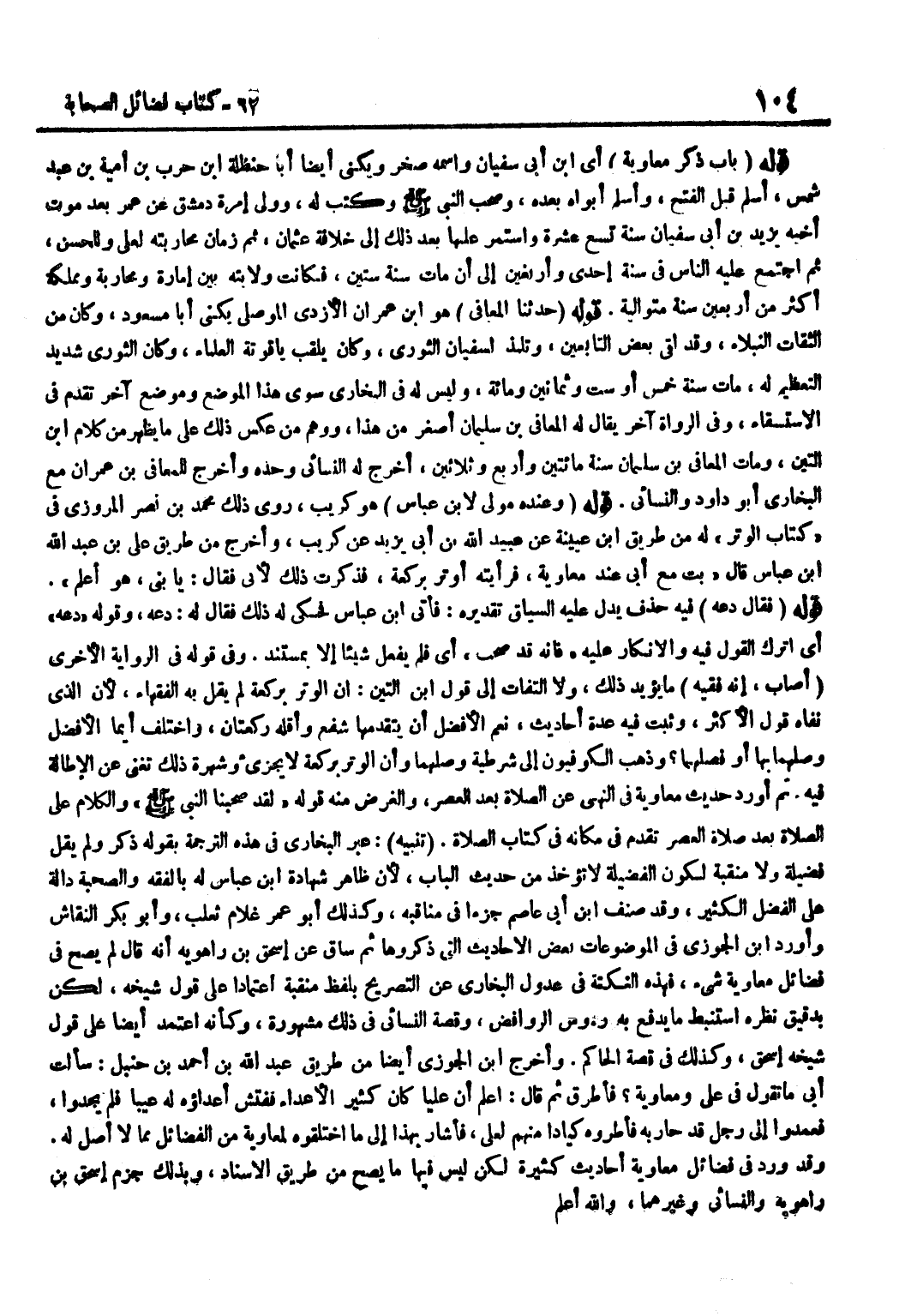 [3766] قَوْلُهُ لَقَدْ صَحِبْنَا النَّبِيَّ صَلَّى اللَّهُ عَلَيْهِ وَسَلَّمَ وَالْكَلَامُ عَلَى الصَّلَاةِ بَعْدَ صَلَاةِ الْعَصْرِ تَقَدَّمَ فِي مَكَانِهِ فِي كِتَابِ الصَّلَاةِ تَنْبِيهٌ عَبَّرَ الْبُخَارِيُّ فِي هَذِهِ التَّرْجَمَةِ بِقَوْلِهِ ذِكْرُ وَلَمْ يَقُلْ فَضِيلَة وَلَا منقبة لكَون الْفَضِيلَة لاتؤخذ من حَدِيث الْبَاب لَان ظَاهر شَهَادَة بن عَبَّاسٍ لَهُ بِالْفِقْهِ وَالصُّحْبَةِ دَالَّةٌ عَلَى الْفَضْلِ الْكثير وَقد صنف بن أَبِي عَاصِمٍ جُزْءًا فِي مَنَاقِبِهِ وَكَذَلِكَ أَبُو عُمَرَ غُلَامُ ثَعْلَبٍ وَأَبُو بَكْرٍ النَّقَّاشُ وَأَوْرَدَ بن الْجَوْزِيِّ فِي الْمَوْضُوعَاتِ بَعْضَ الْأَحَادِيثِ الَّتِي ذَكَرُوهَا ثُمَّ سَاقَ عَنْ إِسْحَاقَ بْنِ رَاهْوَيْهِ أَنَّهُ قَالَ لَمْ يَصِحَّ فِي فَضَائِلِ مُعَاوِيَةَ شَيْءٌ فَهَذِهِ النُّكْتَةُ فِي عُدُولِ الْبُخَارِيِّ عَنِ التَّصْرِيحِ بِلَفْظِ مَنْقَبَةٍ اعْتِمَادًا عَلَى قَوْلِ شَيْخِهِ لَكِنْ بدقيق نظره استنبط مَا يدْفع بِهِ رُؤُوس الرَّوَافِضِ وَقِصَّةُ النَّسَائِيِّ فِي ذَلِكَ مَشْهُورَةٌ وَكَأَنَّهُ اعْتَمَدَ أَيْضًا عَلَى قَوْلِ شَيْخِهِ إِسْحَاقَ وَكَذَلِكَ فِي قصَّة الْحَاكِم واخرج بن الْجَوْزِيِّ أَيْضًا مِنْ طَرِيقِ عَبْدِ اللَّهِ بْنِ أَحْمَدَ بْنِ حَنْبَلٍ سَأَلْتُ أَبِي مَا تَقُولُ فِي عَلِيٍّ وَمُعَاوِيَةَ فَأَطْرَقَ ثُمَّ قَالَ اعْلَمْ أَنَّ عَلِيًّا كَانَ كَثِيرَ الْأَعْدَاءِ فَفَتَّشَ أَعْدَاؤُهُ لَهُ عَيْبًا فَلَمْ يَجِدُوا فَعَمَدُوا إِلَى رَجُلٍ قَدْ حَارَبَهُ فَأَطْرَوْهُ كِيَادًا مِنْهُمْ لِعَلِيٍّ فَأَشَارَ بِهَذَا إِلَى مَا اخْتَلَقُوهُ لِمُعَاوِيَةَ مِنَ الْفَضَائِلِ مِمَّا لَا أَصْلَ لَهُ وَقَدْ وَرَدَ فِي فَضَائِلِ مُعَاوِيَةَ أَحَادِيثُ كَثِيرَةٌ لَكِنْ لَيْسَ فِيهَا مَا يَصِحُّ مِنْ طَرِيقِ الْإِسْنَادِ وَبِذَلِكَ جَزَمَ إِسْحَاق بن رَاهَوَيْه وَالنَّسَائِيّ وَغَيرهمَا وَالله اعْلَم