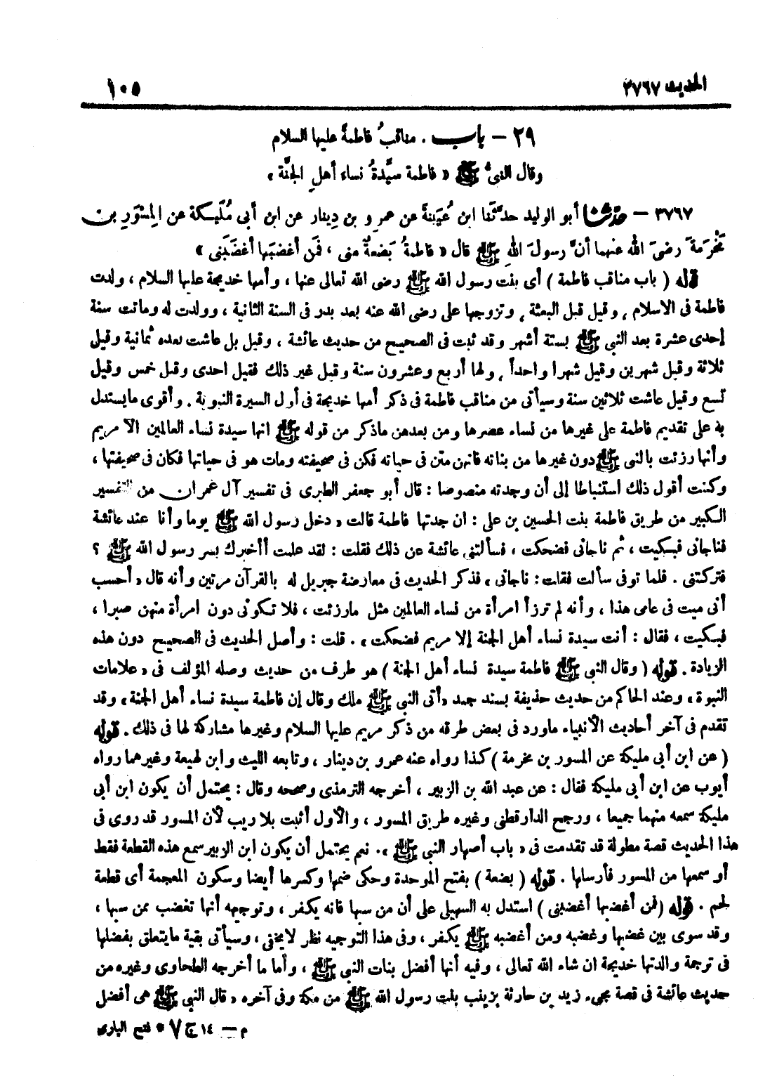 أَيْ بِنْتُ رَسُولِ اللَّهِ صَلَّى اللَّهُ عَلَيْهِ وَسَلَّمَ رَضِي الله تَعَالَى عَنْهَا وَأُمُّهَا خَدِيجَةُ عَلَيْهَا السَّلَامُ وُلِدَتْ فَاطِمَةُ فِي الْإِسْلَامِ وَقِيلَ قَبْلَ الْبَعْثَةِ وَتَزَوَّجَهَا عَلِيٌّ رَضِيَ اللَّهُ عَنْهُ بَعْدَ بَدْرٍ فِي السَّنَةِ الثَّانِيَةِ وَوَلَدَتْ لَهُ وَمَاتَتْ سَنَةَ إِحْدَى عَشْرَةَ بَعْدَ النَّبِيِّ صَلَّى اللَّهُ عَلَيْهِ وَسَلَّمَ بِسِتَّةِ أَشْهُرٍ وَقَدْ ثَبَتَ فِي الصَّحِيحِ مِنْ حَدِيثِ عَائِشَةَ وَقِيلَ بَلْ عَاشَتْ بَعْدَهُ ثَمَانِيَةً وَقِيلَ ثَلَاثَةً وَقِيلَ شَهْرَيْنِ وَقِيلَ شَهْرًا وَاحِدًا وَلَهَا أَرْبَعٌ وَعِشْرُونَ سَنَةً وَقِيلَ غَيْرُ ذَلِكَ فَقِيلَ إِحْدَى وَقِيلَ خَمْسٍ وَقِيلَ تِسْعٍ وَقِيلَ عَاشَتْ ثَلَاثِينَ سَنَةً وَسَيَأْتِي مِنْ مَنَاقِبِ فَاطِمَةَ فِي ذِكْرِ أُمِّهَا خَدِيجَةَ فِي أَوَّلِ السِّيرَةِ النَّبَوِيَّةِ وَأَقْوَى مَا يُسْتَدَلُّ بِهِ عَلَى تَقْدِيمِ فَاطِمَةَ عَلَى غَيْرِهَا مِنْ نِسَاءِ عَصْرِهَا وَمَنْ بَعْدَهُنَّ مَا ذُكِرَ مِنْ قَوْلِهِ صَلَّى اللَّهُ عَلَيْهِ وَسَلَّمَ إِنَّهَا سَيِّدَةُ نِسَاءِ الْعَالَمِينَ إِلَّا مَرْيَمَ وَأَنَّهَا رُزِئَتْ بِالنَّبِيِّ صَلَّى اللَّهُ عَلَيْهِ وَسَلَّمَ دُونَ غَيْرِهَا مِنْ بَنَاتِهِ فَإِنَّهُنَّ مُتْنَ فِي حَيَاتِهِ فَكُنَّ فِي صَحِيفَتِهِ وَمَاتَ هُوَ فِي حَيَاتِهَا فَكَانَ فِي صَحِيفَتِهَا وَكُنْتُ أَقُولُ ذَلِكَ اسْتِنْبَاطًا إِلَى أَنْ وَجَدْتُهُ مَنْصُوصًا قَالَ أَبُو جَعْفَرٍ الطَّبَرِيُّ فِي تَفْسِيرِ آلَ عِمْرَانَ مِنَ التَّفْسِيرِ الْكَبِيرِ مِنْ طَرِيقِ فَاطِمَةَ بِنْتِ الْحُسَيْنِ بْنِ عَلِيٍّ إِنَّ جَدَّتَهَا فَاطِمَةَ قَالَتْ دَخَلَ رَسُولُ اللَّهِ صَلَّى اللَّهُ عَلَيْهِ وَسَلَّمَ يَوْمًا وَأَنَا عِنْدَ عَائِشَةَ فَنَاجَانِي فَبَكَيْتُ ثُمَّ نَاجَانِي فَضَحِكْتُ فَسَأَلَتْنِي عَائِشَةُ عَنْ ذَلِكَ فَقُلْتُ لَقَدْ عَلِمْتِ أَأُخْبِرُكِ بِسِرِّ رَسُولِ اللَّهِ صَلَّى اللَّهُ عَلَيْهِ وَسَلَّمَ فَتَرَكَتْنِي فَلَمَّا تُوُفِّيَ سَأَلَتْ فَقُلْتُ نَاجَانِي فَذَكَرَ الْحَدِيثَ فِي مُعَارَضَةِ جِبْرِيلَ لَهُ بِالْقُرْآنِ مَرَّتَيْنِ وَأَنَّهُ قَالَ أَحْسَبُ أَنِّي مَيِّتٌ فِي عَامِي هَذَا وَأَنَّهُ لَمْ تُرْزَأِ امْرَأَةٌ مِنْ نسَاء الْعَالمين مثل مارزئت فَلَا تَكُونِي دُونَ امْرَأَةٍ مِنْهُنَّ صَبْرًا فَبَكَيْتُ فَقَالَ أَنْتِ سَيِّدَةُ نِسَاءِ أَهْلِ الْجَنَّةِ إِلَّا مَرْيَمَ فَضَحِكْتُ قُلْتُ وَأَصْلُ الْحَدِيثِ فِي الصَّحِيحِ دُونَ هَذِهِ الزِّيَادَةِ قَوْلُهُ وَقَالَ النَّبِيُّ صَلَّى اللَّهُ عَلَيْهِ وَسَلَّمَ فَاطِمَةُ سَيِّدَةُ نِسَاءِ أَهْلِ الْجَنَّةِ هُوَ طَرَفٌ مِنْ حَدِيثٍ وَصَلَهُ الْمُؤَلِّفُ فِي عَلَامَاتِ النُّبُوَّةِ وَعِنْدَ الْحَاكِمِ مِنْ حَدِيثِ حُذَيْفَةَ بِسَنَدٍ جَيِّدٍ أَتَى النَّبِيَّ صَلَّى اللَّهُ عَلَيْهِ وَسَلَّمَ مَلَكٌ وَقَالَ إِنَّ فَاطِمَةَ سَيِّدَةُ نِسَاءِ أَهْلِ الْجَنَّةِ وَقَدْ تَقَدَّمَ فِي آخِرِ أَحَادِيثِ الْأَنْبِيَاءِ مَا وَرَدَ فِي بَعْضِ طُرُقِهِ مِنْ ذِكْرِ مَرْيَمَ عَلَيْهَا السَّلَامُ وَغَيْرِهَا مُشَارَكَةً لَهَا فِي ذَلِك