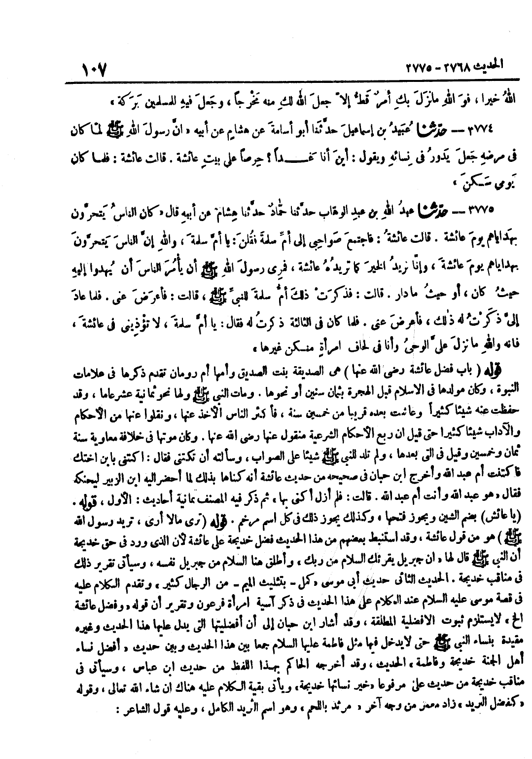 هِيَ الصِّدِّيقَةُ بِنْتُ الصِّدِّيقِ وَأُمُّهَا أُمُّ رُومَانَ تَقَدَّمَ ذِكْرُهَا فِي عَلَامَاتِ النُّبُوَّةِ وَكَانَ مَوْلِدُهَا فِي الْإِسْلَام قبل الْهِجْرَة بثمان سِنِينَ أَوْ نَحْوِهَا وَمَاتَ النَّبِيُّ صَلَّى اللَّهُ عَلَيْهِ وَسَلَّمَ وَلَهَا نَحْوُ ثَمَانِيَةَ عَشَرَ عَامًا وَقَدْ حَفِظَتْ عَنْهُ شَيْئًا كَثِيرًا وَعَاشَتْ بَعْدَهُ قَرِيبًا مِنْ خَمْسِينَ سَنَةً فَأَكْثَرَ النَّاسُ الْأَخْذَ عَنْهَا وَنَقَلُوا عَنْهَا مِنَ الْأَحْكَامِ وَالْآدَابِ شَيْئًا كَثِيرًا حَتَّى قِيلَ إِنَّ رُبْعَ الْأَحْكَامِ الشَّرْعِيَّةِ مَنْقُولٌ عَنْهَا رَضِيَ اللَّهُ عَنْهَا وَكَانَ مَوْتُهَا فِي خِلَافَةِ مُعَاوِيَةَ سَنَةَ ثَمَانٍ وَخَمْسِينَ وَقِيلَ فِي الَّتِي بَعْدَهَا وَلَمْ تَلِدْ لِلنَّبِيِّ صَلَّى اللَّهُ عَلَيْهِ وَسَلَّمَ شَيْئًا عَلَى الصَّوَابِ وَسَأَلَتْهُ أَنْ تَكْتَنِيَ فَقَالَ اكْتَنِّي بِابْنِ أُخْتِكِ فَاكْتَنَّتْ أم عبد الله واخرج بن حِبَّانَ فِي صَحِيحِهِ مِنْ حَدِيثِ عَائِشَةَ أَنَّهُ كناها بذلك لما احضر إِلَيْهِ بن الزُّبَيْرِ لِيُحَنِّكَهُ فَقَالَ هُوَ عَبْدُ اللَّهِ وَأَنْتِ أُمُّ عَبْدِ اللَّهِ قَالَتْ فَلَمْ أَزَلْ أُكَنَّى بهَا ثمَّ ذكر فِيهِ المُصَنّف ثَمَانِيَة أَحَادِيث الأول