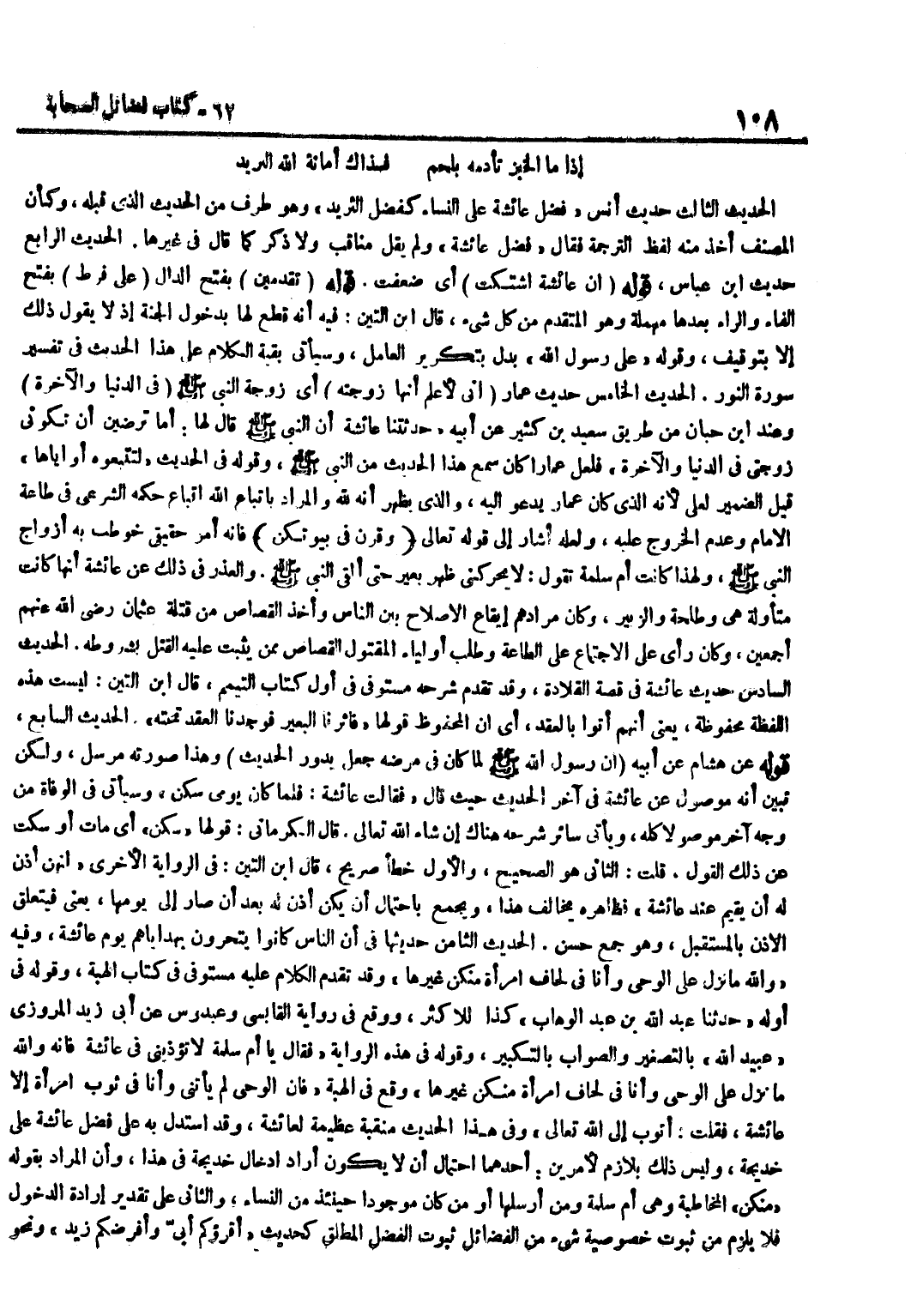 [3775] فِي أَوَّلِهِ حَدَّثَنَا عَبْدُ اللَّهِ بْنُ عَبْدِ الْوَهَّابِ كَذَا لِلْأَكْثَرِ وَوَقَعَ فِي رِوَايَةِ الْقَابِسِيِّ وَعَبْدُوسٍ عَنْ أَبِي زَيْدٍ الْمَرْوَزِيِّ عُبَيْدُ اللَّهِ بِالتَّصْغِيرِ وَالصَّوَابُ بِالتَّكْبِيرِ وَقَوْلُهُ فِي هَذِهِ الرِّوَايَةِ فَقَالَ يَا أُمَّ سَلَمَةَ لاتؤذيني فِي عَائِشَة فَإِنَّهُ وَالله مانزل عَلَيَّ الْوَحْيُ وَأَنَا فِي لِحَافِ امْرَأَةٍ مِنْكُنَّ غَيْرَهَا وَقَعَ فِي الْهِبَةِ فَإِنَّ الْوَحْيَ لَمْ يَأْتِنِي وَأَنَا فِي ثَوْبِ امْرَأَةٍ إِلَّا عَائِشَةَ فَقُلْتُ أَتُوبُ إِلَى اللَّهِ تَعَالَى وَفِي هَذَا الْحَدِيثِ مَنْقَبَةٌ عَظِيمَةٌ لِعَائِشَةَ وَقَدِ اسْتُدِلَّ بِهِ عَلَى فَضْلِ عَائِشَةَ عَلَى خَدِيجَةَ وَلَيْسَ ذَلِكَ بِلَازِمٍ لِأَمْرَيْنِ أَحَدُهُمَا احْتِمَالُ أَنْ لَا يَكُونَ أَرَادَ إِدْخَالَ خَدِيجَةَ فِي هَذَا وَأَنَّ الْمُرَادَ بِقَوْلِهِ مِنْكُنَّ الْمُخَاطَبَةُ وَهِيَ أُمُّ سَلَمَةَ وَمَنْ أَرْسَلَهَا أَوْ مَنْ كَانَ مَوْجُودًا حِينَئِذٍ مِنَ النِّسَاءِ وَالثَّانِي عَلَى تَقْدِيرِ إِرَادَةِ الدُّخُولِ فَلَا يَلْزَمُ مِنْ ثُبُوتِ خُصُوصِيَّةِ شَيْءٍ مِنَ الْفَضَائِلِ ثُبُوتُ الْفَضْلِ الْمُطْلَقِ كَحَدِيثِ أَقْرَؤُكُمْ أُبَيٌّ وَأَفْرَضُكُمْ زيد وَنَحْو