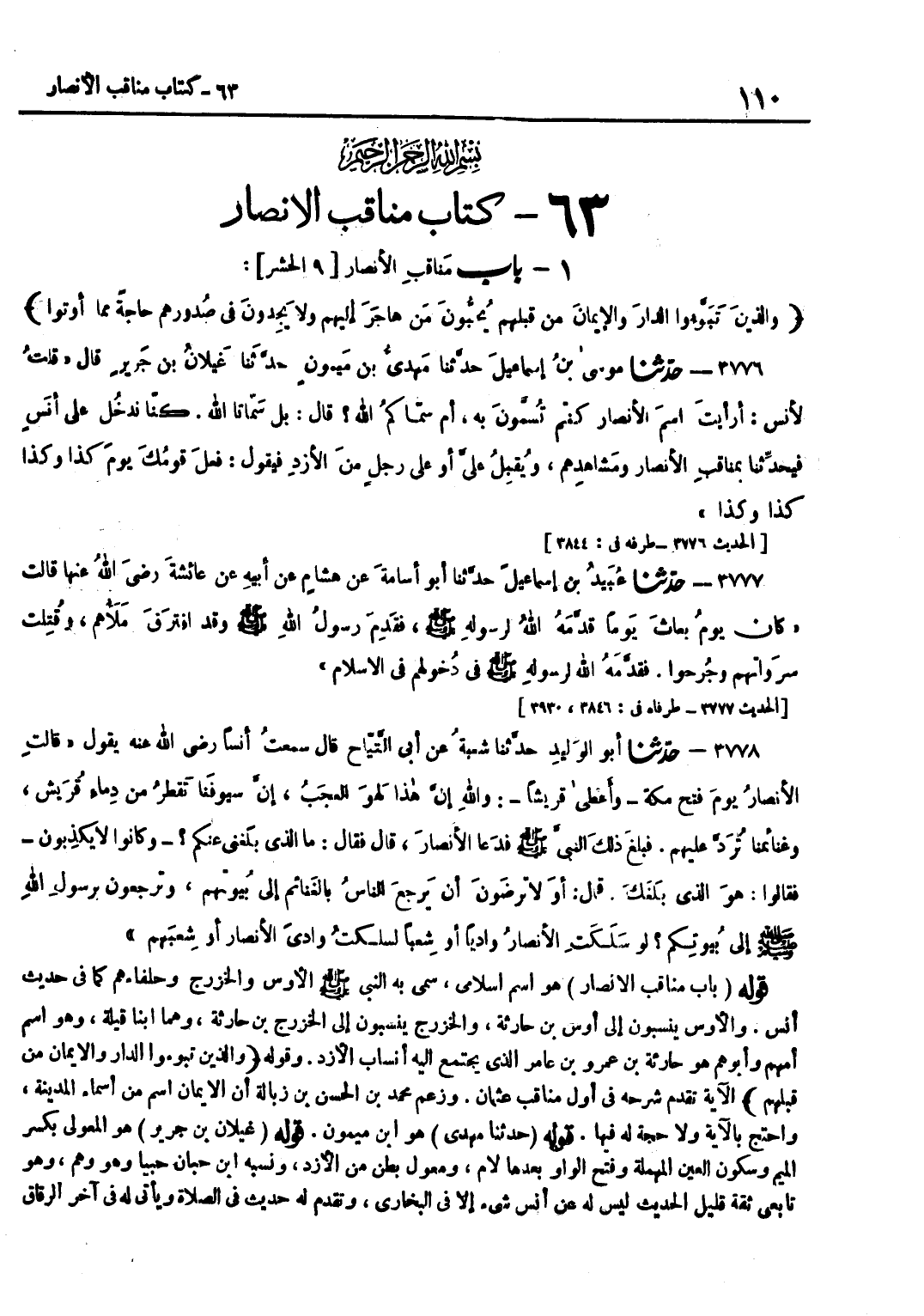 [3776] قَوْلُهُ حَدَّثَنَا مَهْدِيٌّ هُوَ بن مَيْمُونٍ قَوْلُهُ غَيْلَانُ بْنُ جَرِيرٍ هُوَ الْمِعْوَلِيُّ بِكْسِرِ الْمِيمِ وَسُكُونِ الْعَيْنِ الْمُهْمَلَةِ وَفَتْحِ الْوَاوِ بَعْدَهَا لَامٌ وَمِعْوَلٌ بَطْنٌ مِنَ الْأَزْدِ وَنَسَبَهُ بن حِبَّانَ حِبْيًا وَهُوَ وَهَمٌ وَهُوَ تَابِعِيٌّ ثِقَةٌ قَلِيلُ الْحَدِيثِ لَيْسَ لَهُ عَنْ أَنَسٍ شَيْءٌ إِلَّا فِي الْبُخَارِيِّ وَتَقَدَّمَ لَهُ حَدِيثٌ فِي الصَّلَاة وَيَأْتِي لَهُ فِي اخر الرقَاق وَقَوله قُلْتُ لِأَنَسٍ أَرَأَيْتَ اسْمَ الْأَنْصَارِ يَعْنِي أَخْبِرْنِي عَنْ تَسْمِيَةِ الْأَوْسِ وَالْخَزْرَجِ الْأَنْصَارَ قَوْلُهُ كُنَّا نَدْخُلُ كَذَا فِي هَذِهِ الرِّوَايَةِ بِغَيْرِ أَدَاةِ الْعَطْفِ وَهُوَ مِنْ كَلَامِ غَيْلَانَ لَا مِنْ كَلَامِ أَنَسٍ وَسَيَأْتِي بَعْدَ قَلِيلٍ قَبْلَ بَابِ الْقَسَامَةِ فِي الْجَاهِلِيَّةِ مِنْ وَجْهٍ آخَرَ عَنْ مَهْدِيِّ بْنِ مَيْمُونٍ عَنْ غَيْلَانَ قَالَ كُنَّا نَأْتِي أَنَسَ بْنَ مَالِكٍ الْحَدِيثَ وَلَمْ يَذْكُرْ مَا قَبْلَهُ قَوْلُهُ كُنَّا نَدْخُلُ عَلَى أَنَسٍ أَيْ بِالْبَصْرَةِ قَوْلُهُ وَيُقْبِلُ عَلَيَّ أَيْ مُخَاطِبًا لي قَوْله فعل قَوْمك كَذَا أَيْ يَحْكِي مَا كَانَ مِنْ مَآثِرِهِمْ فِي الْمَغَازِي وَنَصْرِ الْإِسْلَامِ