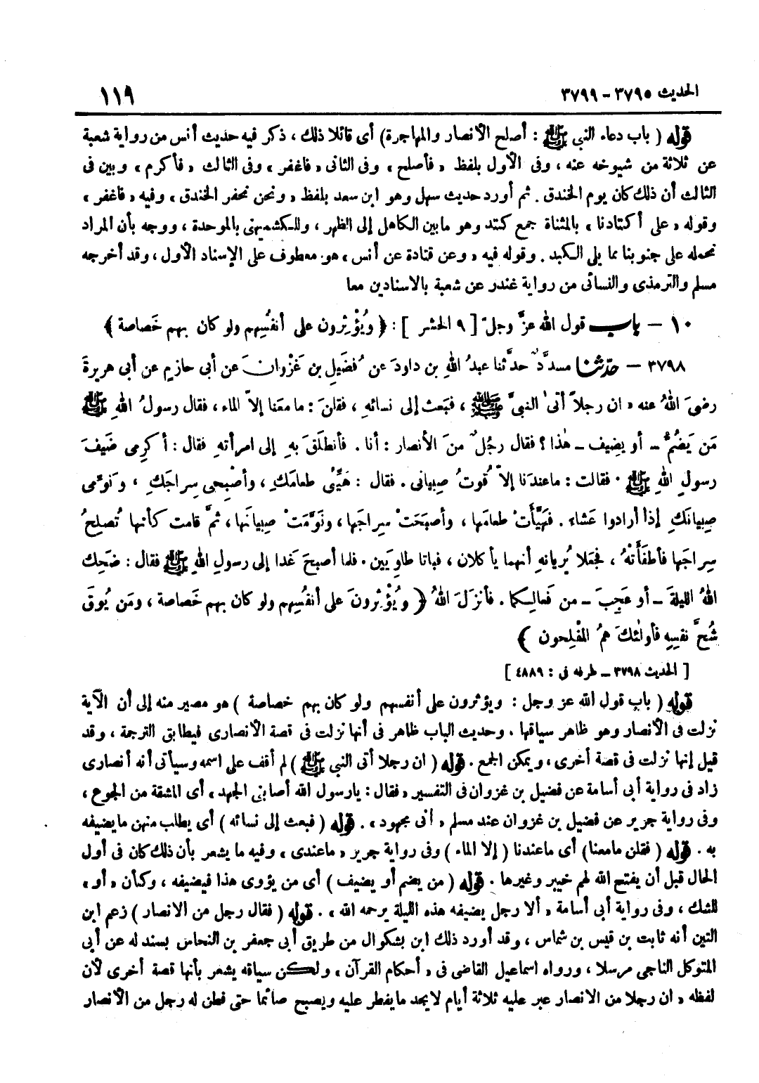 [3798] قَوْلُهُ أَنَّ رَجُلًا أَتَى النَّبِيِّ صَلَّى اللَّهُ عَلَيْهِ وَسَلَّمَ لَمْ أَقِفْ عَلَى اسْمِهِ وَسَيَأْتِي أَنَّهُ أَنْصَارِيٌّ زَادَ فِي رِوَايَةِ أَبِي أُسَامَةَ عَنْ فُضَيْلِ بْنِ غَزْوَانَ فِي التَّفْسِيرِ فَقَالَ يَا رَسُولَ اللَّهِ أَصَابَنِي الْجَهْدُ أَيِ الْمَشَقَّةُ مِنَ الْجُوعِ وَفِي رِوَايَةِ جَرِيرٍ عَنْ فُضَيْلِ بْنِ غَزْوَانَ عِنْدَ مُسْلِمٍ إِنِّي مَجْهُودٌ قَوْلُهُ فَبَعَثَ إِلَى نِسَائِهِ أَيْ يَطْلُبُ مِنْهُنَّ مَا يُضَيِّفُهُ بِهِ قَوْلُهُ فَقُلْنَ مَا مَعنا أَي ماعندنا الا المَاء وَفِي رِوَايَة جرير ماعندي وَفِيهِ مَا يُشْعِرُ بِأَنَّ ذَلِكَ كَانَ فِي أَوَّلِ الْحَالِ قَبْلَ أَنْ يَفْتَحَ اللَّهُ لَهُمْ خَيْبَرَ وَغَيْرَهَا قَوْلُهُ مَنْ يَضُمُّ أَوْ يُضَيِّفُ أَيْ مَنْ يُؤْوِي هَذَا فَيُضَيِّفُهُ وَكَأَنَّ أَوْ لِلشَّكِّ وَفِي رِوَايَةِ أَبِي أُسَامَةَ أَلَا رَجُلٌ يُضَيِّفُهُ هَذِهِ اللَّيْلَةَ يَرْحَمُهُ اللَّهُ قَوْلُهُ فَقَالَ رجل من الْأَنْصَار زعم بن التِّينِ أَنَّهُ ثَابِتُ بْنُ قَيْسِ بْنِ شَمَّاسٍ وَقد اورد ذَلِك بن بَشْكُوَالَ مِنْ طَرِيقِ أَبِي جَعْفَرِ بْنِ النَّحَّاسِ بِسَنَد لَهُ عَنْ أَبِي الْمُتَوَكِّلِ النَّاجِي مُرْسَلًا وَرَوَاهُ إِسْمَاعِيلُ الْقَاضِي فِي أَحْكَامِ الْقُرْآنِ وَلَكِنَّ سِيَاقَهُ يُشْعِرُ بِأَنَّهَا قِصَّةٌ أُخْرَى لِأَنَّ لَفْظَهُ أَنَّ رَجُلًا مِنَ الْأَنْصَارِ عَبَرَ عَلَيْهِ ثَلَاثَةَ أَيَّامٍ لايجد مَا يُفْطِرُ عَلَيْهِ وَيُصْبِحُ صَائِمًا حَتَّى فَطِنَ لَهُ رَجُلٌ مِنَ الْأَنْصَارِ