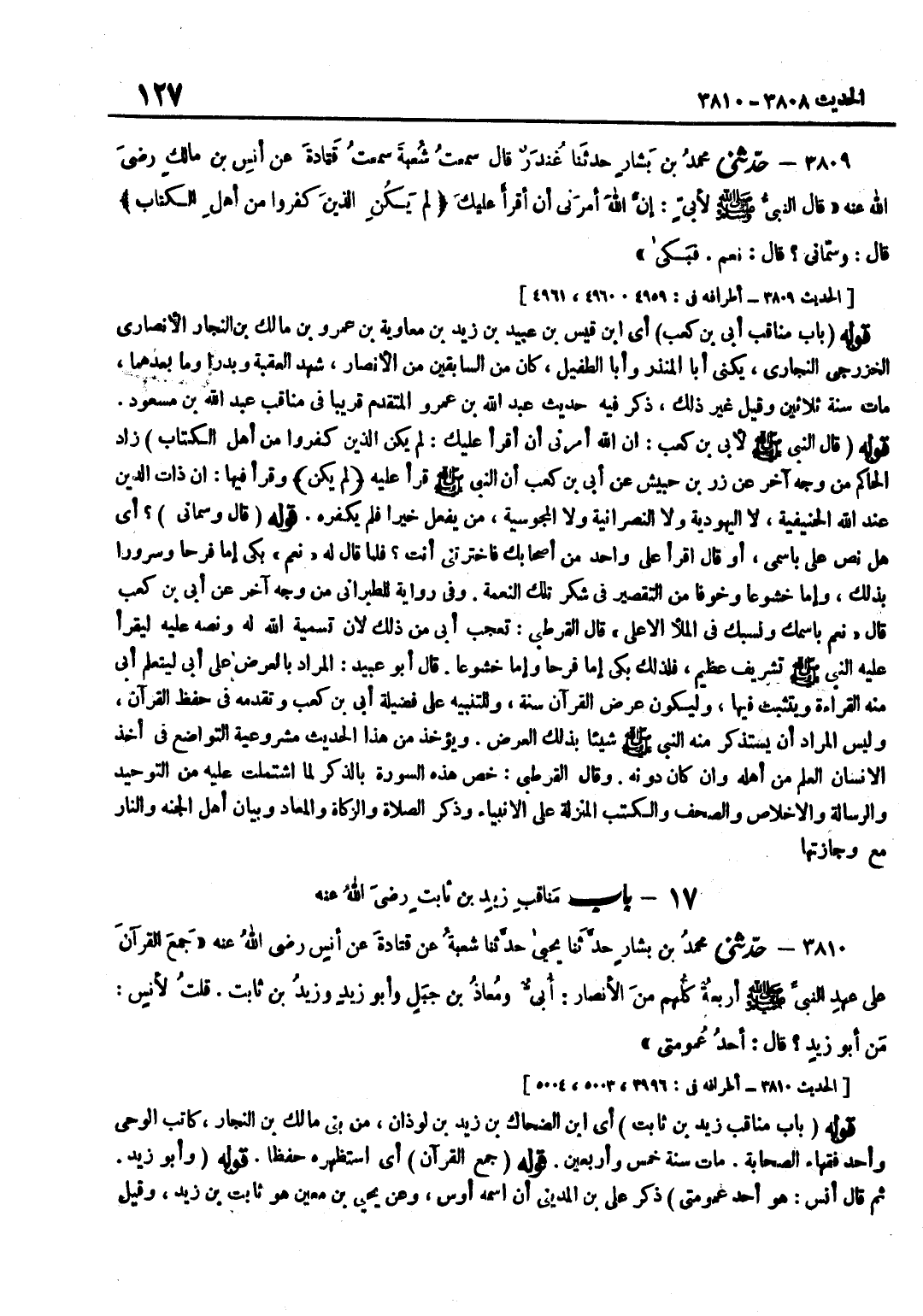 [3809] قَوْلُهُ قَالَ النَّبِيُّ صَلَّى اللَّهُ عَلَيْهِ وَسَلَّمَ لِأَبِي بْنِ كَعْبٍ إِنَّ اللَّهَ أَمَرَنِي أَنْ أَقْرَأَ عَلَيْكَ لَمْ يَكُنِ الَّذِينَ كَفَرُوا مِنْ أَهْلِ الْكِتَابِ زَادَ الْحَاكِمُ مِنْ وَجْهٍ آخَرَ عَنْ زِرِّ بْنِ حُبَيْشٍ عَنْ أُبَيِّ بْنِ كَعْبٍ أَنَّ النَّبِيَّ صَلَّى اللَّهُ عَلَيْهِ وَسَلَّمَ قَرَأَ عَلَيْهِ لَمْ يَكُنْ وَقَرَأَ فِيهَا إِنَّ ذَاتَ الدِّينِ عِنْدَ اللَّهِ الْحَنِيفِيَّةُ لَا الْيَهُودِيَّةُ وَلَا النَّصْرَانِيَّةُ وَلَا الْمَجُوسِيَّةُ مَنْ يَفْعَلْ خَيْرًا فَلَمْ يُكْفَرْهُ قَوْلُهُ قَالَ وَسَمَّانِي أَيْ هَلْ نَصَّ عَلَيَّ بِاسْمِي أَوْ قَالَ اقْرَأْ عَلَى وَاحِدٍ مِنْ أَصْحَابك فا خترتني أَنْتَ فَلَمَّا قَالَ لَهُ نَعَمْ بَكَى إِمَّا فَرَحًا وَسُرُورًا بِذَلِكَ وَإِمَّا خُشُوعًا وَخَوْفًا مِنَ التَّقْصِيرِ فِي شُكْرِ تِلْكَ النِّعْمَةِ وَفِي رِوَايَةٍ لِلطَّبَرَانِيِّ مِنْ وَجْهٍ آخَرَ عَنْ أُبَيِّ بْنِ كَعْبٍ قَالَ نَعَمْ بِاسْمِكَ وَنَسَبِكَ فِي الْمَلَأِ الْأَعْلَى قَالَ الْقُرْطُبِيُّ تَعَجَّبَ أُبَيٌّ مِنْ ذَلِكَ لِأَنَّ تَسْمِيَةَ اللَّهِ لَهُ وَنَصَّهُ عَلَيْهِ لِيَقْرَأَ عَلَيْهِ النَّبِيُّ صَلَّى اللَّهُ عَلَيْهِ وَسَلَّمَ تَشْرِيفٌ عَظِيمٌ فَلِذَلِكَ بَكَى إِمَّا فَرَحًا وَإِمَّا خُشُوعًا قَالَ أَبُو عُبَيْدٍ الْمُرَادُ بِالْعَرْضِ عَلَى أُبَيٍّ لِيَتَعَلَّمَ أُبَيٌّ مِنْهُ الْقِرَاءَةَ وَيَتَثَبَّتَ فِيهَا وَلِيَكُونَ عَرْضُ الْقُرْآنِ سُنَّةً وَلِلتَّنْبِيهِ عَلَى فَضِيلَةِ أُبَيِّ بْنِ كَعْبٍ وَتَقَدُّمِهِ فِي حِفْظِ الْقُرْآنِ وَلَيْسَ الْمُرَادُ أَنْ يَسْتَذْكِرَ مِنْهُ النَّبِيُّ صَلَّى اللَّهُ عَلَيْهِ وَسَلَّمَ شَيْئًا بِذَلِكَ الْعَرْضِ وَيُؤْخَذُ مِنْ هَذَا الْحَدِيثِ مَشْرُوعِيَّةُ التَّوَاضُعِ فِي أَخْذِ الْإِنْسَانِ الْعِلْمَ مِنْ أَهْلِهِ وَإِنْ كَانَ دُونَهُ وَقَالَ الْقُرْطُبِيُّ خَصَّ هَذِهِ السُّورَةَ بِالذِّكْرِ لِمَا اشْتَمَلَتْ عَلَيْهِ مِنَ التَّوْحِيدِ وَالرِّسَالَةِ وَالْإِخْلَاصِ وَالصُّحُفِ وَالْكُتُبِ الْمُنَزَّلَةِ عَلَى الْأَنْبِيَاءِ وَذِكْرِ الصَّلَاةِ وَالزَّكَاةِ وَالْمَعَادِ وَبَيَان أهل الْجنَّة وَالنَّار مَعَ وجازتها