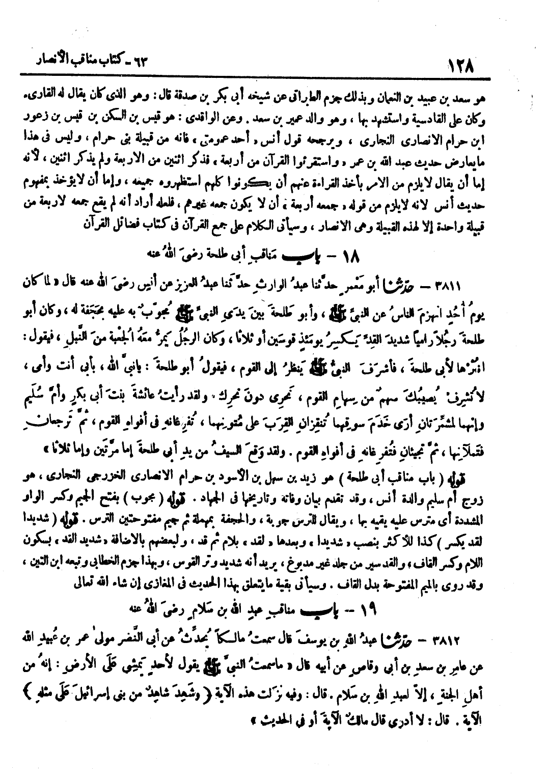 [3811] قَوْلُهُ مُجَوِّبٌ بِفَتْحِ الْجِيمِ وَكَسْرِ الْوَاوِ الْمُشَدَّدَةِ أَيْ مُتَرِّسٌ عَلَيْهِ يَقِيهِ بِهَا وَيُقَالُ لِلتُّرْسِ جَوْبَةٌ وَالْحَجَفَةُ بِمُهْمَلَةٍ ثُمَّ جِيمٍ مَفْتُوحَتَيْنِ التُّرْسُ قَوْلُهُ شَدِيدًا لِقِدٍّ يُكْسَرُ كَذَا لِلْأَكْثَرِ بِنَصْبِ شَدِيدًا وَبَعْدَهَا لِقِدٍّ بِلَامٍ ثُمَّ قِدٍّ وَلِبَعْضِهِمْ بِالْإِضَافَةِ شَدِيدِ الْقِدِّ بِسُكُونِ اللَّامِ وَكَسْرِ الْقَافِ وَالْقِدُّ سَيْرٌ مِنْ جِلْدٍ غَيْرِ مَدْبُوغٍ يُرِيد أَنَّهُ شَدِيدُ وَتَرِ الْقَوْسِ وَبِهَذَا جَزَمَ الْخَطَّابِيُّ وَتَبعهُ بن التِّينِ وَقَدْ رُوِيَ بِالْمِيمِ الْمَفْتُوحَةِ بَدَلَ الْقَافِ وَسَيَأْتِي بَقِيَّةُ مَا يَتَعَلَّقُ بِهَذَا الْحَدِيثِ فِي الْمَغَازِي إِنْ شَاءَ اللَّهُ تَعَالَى