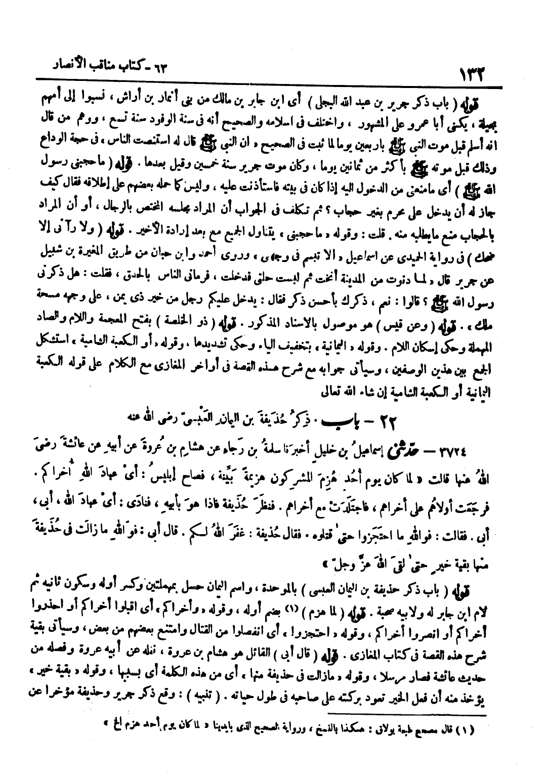 [3822] قَوْلُهُ مَا حَجَبَنِي رَسُولِ اللَّهِ صَلَّى اللَّهُ عَلَيْهِ وَسَلَّمَ أَيْ مَا مَنَعَنِي مِنَ الدُّخُولِ إِلَيْهِ إِذَا كَانَ فِي بَيْتِهِ فَاسْتَأْذَنْتُ عَلَيْهِ وَلَيْسَ كَمَا حَمَلَهُ بَعْضُهُمْ عَلَى إِطْلَاقِهِ فَقَالَ كَيْفَ جَازَ لَهُ أَنْ يَدْخُلَ عَلَى مُحَرَّمٍ بِغَيْرِ حِجَابٍ ثُمَّ تَكَلَّفَ فِي الْجَوَابِ أَنَّ الْمُرَادَ مَجْلِسُهُ الْمُخْتَصُّ بِالرِّجَالِ أَوْ أَنَّ الْمُرَادَ بِالْحِجَابِ مَنْعُ مَا يَطْلُبُهُ مِنْهُ قُلْتُ وَقَوْلُهُ مَا حَجَبَنِي يَتَنَاوَلُ الْجَمِيعَ مَعَ بُعْدِ إِرَادَةِ الْأَخِيرِ قَوْلُهُ وَلَا رَآنِي إِلَّا ضَحِكَ فِي رِوَايَةِ الْحُمَيْدِيِّ عَنْ إِسْمَاعِيلَ إِلَّا تَبَسَّمَ فِي وَجْهِي وروى احْمَد وبن حِبَّانَ مِنْ طَرِيقِ الْمُغِيرَةِ بْنِ شُبَيْلٍ عَنْ جَرِيرٍ قَالَ لَمَّا دَنَوْتُ مِنَ الْمَدِينَةِ أَنَخْتُ ثُمَّ لَبِسْتُ حُلَّتِي فَدَخَلْتُ فَرَمَانِي النَّاسُ بِالْحَدَقِ فَقُلْتُ هَلْ ذَكَرَنِي رَسُولُ اللَّهِ صَلَّى اللَّهُ عَلَيْهِ وَسَلَّمَ قَالُوا نَعَمْ ذَكَرَكَ بِأَحْسَنِ ذِكْرٍ فَقَالَ يَدْخُلُ عَلَيْكُمْ رَجُلٌ مِنْ خَيْرِ ذِي يَمَنٍ عَلَى وَجْهِهِ مَسْحَةُ مَلَكٍ قَوْلُهُ وَعَنْ قَيْسٍ هُوَ مَوْصُولٌ بِالْإِسْنَادِ الْمَذْكُورِ قَوْلُهُ ذُو الْخَلَصَةِ بِفَتْحِ الْمُعْجَمَةِ وَاللَّامِ وَالصَّادِ الْمُهْمَلَةِ وَحُكِيَ إِسْكَانُ اللَّامِ وَقَوْلُهُ الْيَمَانِيَةُ بِتَخْفِيفِ الْيَاءِ وَحُكِيَ تَشْدِيدُهَا وَقَوْلُهُ أَوِ الْكَعْبَةُ الشَّامِيَّةُ اسْتُشْكِلَ الْجَمْعُ بَيْنَ هَذَيْنِ الْوَصْفَيْنِ وَسَيَأْتِي جَوَابُهُ مَعَ شَرْحِ هَذِهِ الْقِصَّةِ فِي أَوَاخِرِ الْمَغَازِي مَعَ الْكَلَامِ عَلَى قَوْلِهِ الْكَعْبَةُ الْيَمَانِيَةِ أَوِ الْكَعْبَةُ الشَّامِيَّةُ ان شَاءَ الله تَعَالَى