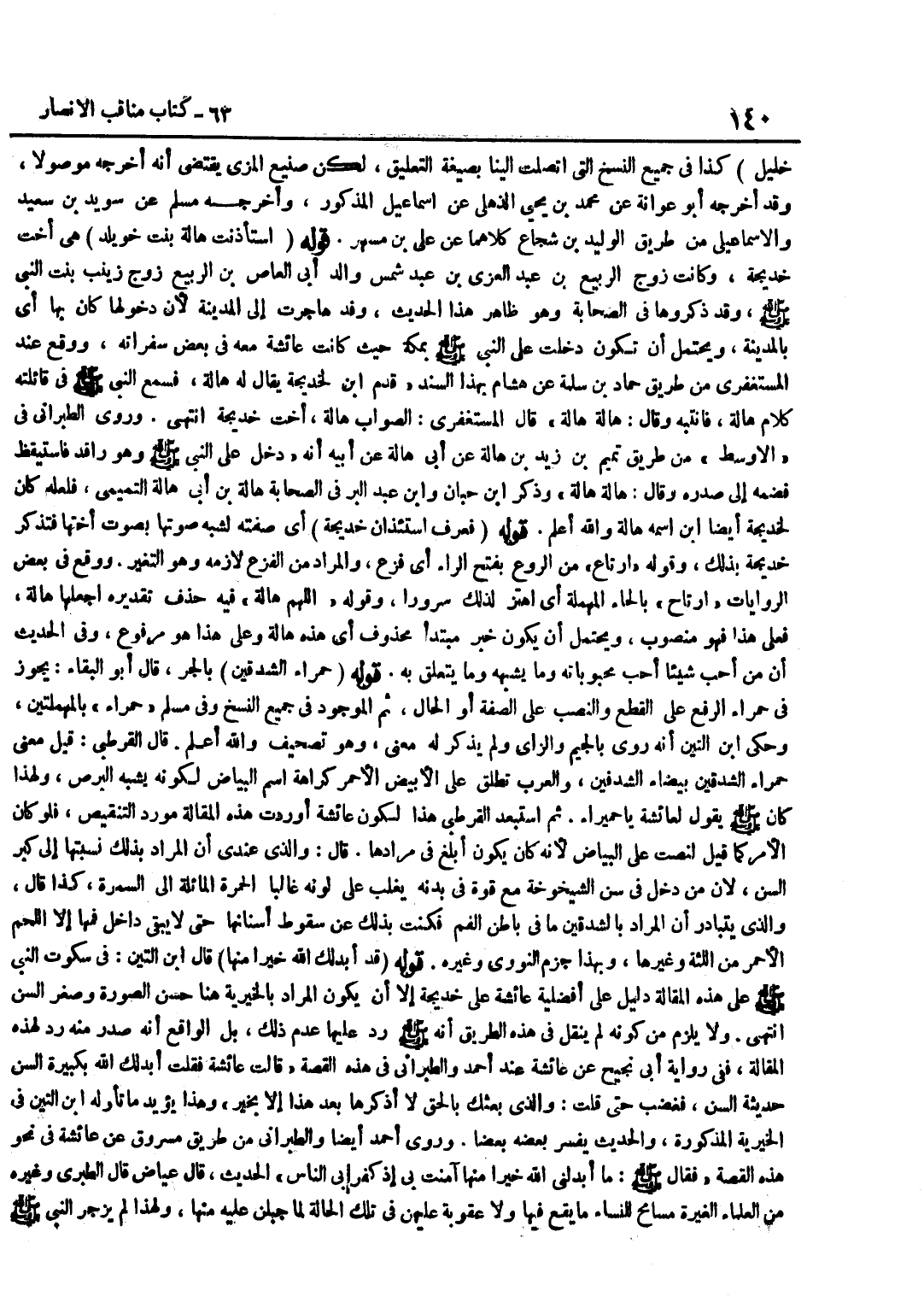 بْنُ خَلِيلٍ كَذَا فِي جَمِيعِ النُّسَخِ الَّتِي اتَّصَلَتْ إِلَيْنَا بِصِيغَةِ التَّعْلِيقِ لَكِنَّ صَنِيعَ الْمِزِّيِّ يَقْتَضِي أَنَّهُ أَخْرَجَهُ مَوْصُولًا وَقَدْ أَخْرَجَهُ أَبُو عَوَانَةَ عَنْ مُحَمَّدِ بْنِ يَحْيَى الذُّهْلِيِّ عَنْ إِسْمَاعِيلَ الْمَذْكُورِ وَأَخْرَجَهُ مُسْلِمٌ عَنْ سُوَيْدِ بْنِ سَعِيدٍ وَالْإِسْمَاعِيلِيُّ مِنْ طَرِيقِ الْوَلِيدِ بْنِ شُجَاعٍ كِلَاهُمَا عَنْ عَلِيِّ بْنِ مُسْهِرٍ قَوْلُهُ اسْتَأْذَنَتْ هَالَةُ بِنْتُ خُوَيْلِدٍ هِيَ أُخْتُ خَدِيجَةَ وَكَانَتْ زَوْجَ الرَّبِيعِ بْنِ عَبْدِ الْعُزَّى بْنِ عَبْدِ شَمْسٍ وَالِدِ أَبِي الْعَاصِ بْنِ الرَّبِيعِ زَوْجِ زَيْنَبَ بِنْتِ النَّبِيِّ صَلَّى اللَّهُ عَلَيْهِ وَسَلَّمَ وَقَدْ ذَكَرُوهَا فِي الصَّحَابَةِ وَهُوَ ظَاهِرُ هَذَا الْحَدِيثِ وَقَدْ هَاجَرَتْ إِلَى الْمَدِينَةِ لِأَنَّ دُخُولَهَا كَانَ بِهَا أَيْ بِالْمَدِينَةِ وَيَحْتَمِلُ أَنْ تَكُونَ دَخَلَتْ عَلَى النَّبِيِّ صَلَّى اللَّهُ عَلَيْهِ وَسَلَّمَ بِمَكَّةَ حَيْثُ كَانَتْ عَائِشَةُ مَعَهُ فِي بَعْضِ سَفَرَاتِهِ وَوَقَعَ عِنْدَ الْمُسْتَغْفِرِيِّ مِنْ طَرِيقِ حَمَّادِ بْنِ سَلَمَةَ عَنْ هِشَامِ بِهَذَا السَّنَدِ قَدِمَ بن لِخَدِيجَةَ يُقَالُ لَهُ هَالَةُ فَسَمِعَ النَّبِيُّ صَلَّى اللَّهُ عَلَيْهِ وَسَلَّمَ فِي قَائِلَتِهِ كَلَامَ هَالَةَ فَانْتَبَهَ وَقَالَ هَالَةُ هَالَةُ قَالَ الْمُسْتَغْفِرِيُّ الصَّوَابُ هَالَةُ أُخْتُ خَدِيجَةَ انْتَهَى وَرَوَى الطَّبَرَانِيُّ فِي الْأَوْسَطِ مِنْ طَرِيقِ تَمِيمِ بْنِ زَيْدِ بْنِ هَالَةَ عَنْ أَبِي هَالَةَ عَنْ أَبِيهِ أَنَّهُ دَخَلَ عَلَى النَّبِيِّ صَلَّى اللَّهُ عَلَيْهِ وَسَلَّمَ وَهُوَ رَاقِدٌ فَاسْتَيْقَظَ فَضَمَّهُ إِلَى صَدْرِهِ وَقَالَ هَالة هَالة وَذكر بن حبَان وبن عَبْدِ الْبَرِّ فِي الصَّحَابَةِ هَالَةَ بْنَ أَبِي هَالة التَّمِيمِي فَلَعَلَّهُ كَانَ لِخَدِيجَة أَيْضا بن اسْمُهُ هَالَةُ وَاللَّهُ أَعْلَمُ قَوْلُهُ فَعَرَفَ اسْتِئْذَانَ خَدِيجَةَ أَيْ صِفَتَهُ لِشَبَهِ صَوْتِهَا بِصَوْتِ أُخْتِهَا فَتَذَكَّرَ خَدِيجَةَ بِذَلِكَ وَقَوْلُهُ ارْتَاعَ مِنَ الرَّوْعِ بِفَتْحِ الرَّاءِ أَيْ فَزِعَ وَالْمُرَادُ مِنَ الْفَزَعِ لَازِمُهُ وَهُوَ التَّغَيُّرُ وَوَقَعَ فِي بَعْضِ الرِّوَايَاتِ ارْتَاحَ بِالْحَاءِ الْمُهْمَلَةِ أَيِ اهْتَزَّ لِذَلِكَ سُرُورًا وَقَوْلُهُ اللَّهُمَّ هَالَةَ فِيهِ حَذْفٌ تَقْدِيرُهُ اجْعَلْهَا هَالَةَ فَعَلَى هَذَا فَهُوَ مَنْصُوبٌ وَيَحْتَمِلُ أَنْ يَكُونَ خَبَرَ مُبْتَدَأٍ مَحْذُوفٍ أَيْ هَذِهِ هَالَةُ وَعَلَى هَذَا هُوَ مَرْفُوعٌ وَفِي الْحَدِيثِ أَنَّ مَنْ أَحَبَّ شَيْئًا أَحَبَّ مَحْبُوبَاتِهِ وَمَا يُشْبِهُهُ وَمَا يَتَعَلَّقُ بِهِ قَوْلُهُ حَمْرَاءَ الشِّدْقَيْنِ بِالْجَرِّ قَالَ أَبُو الْبَقَاءِ يَجُوزُ فِي حَمْرَاءَ الرَّفْعُ عَلَى الْقَطْعِ وَالنَّصْبُ عَلَى الصِّفَةِ أَوِ الْحَالِ ثُمَّ الْمَوْجُودُ فِي جَمِيعِ النُّسَخِ وَفِي مُسْلِمٍ حَمْرَاء بالمهملتين وَحكى بن التِّينِ أَنَّهُ رُوِيَ بِالْجِيمِ وَالزَّايِ وَلَمْ يَذْكُرْ لَهُ مَعْنًى وَهُوَ تَصْحِيفٌ وَاللَّهُ أَعْلَمُ قَالَ الْقُرْطُبِيُّ قِيلَ مَعْنَى حَمْرَاءِ الشِّدْقَيْنِ بَيْضَاءُ الشَّدْقَيْنِ وَالْعرب تطلق على الْأَبْيَض الْأَحْمَر كرهة اسْمِ الْبَيَاضِ لِكَوْنِهِ يُشْبِهُ الْبَرَصَ وَلِهَذَا كَانَ صلى الله عَلَيْهِ وَسلم يَقُول لعَائِشَة ياحميراء ثُمَّ اسْتَبْعَدَ الْقُرْطُبِيُّ هَذَا لِكَوْنِ عَائِشَةَ أَوْرَدَتْ هَذِهِ الْمَقَالَةَ مَوْرِدَ التَّنْقِيصِ فَلَوْ كَانَ الْأَمْرُ كَمَا قِيلَ لَنَصَّتْ عَلَى الْبَيَاضِ لِأَنَّهُ كَانَ يَكُونُ أَبْلَغَ فِي 