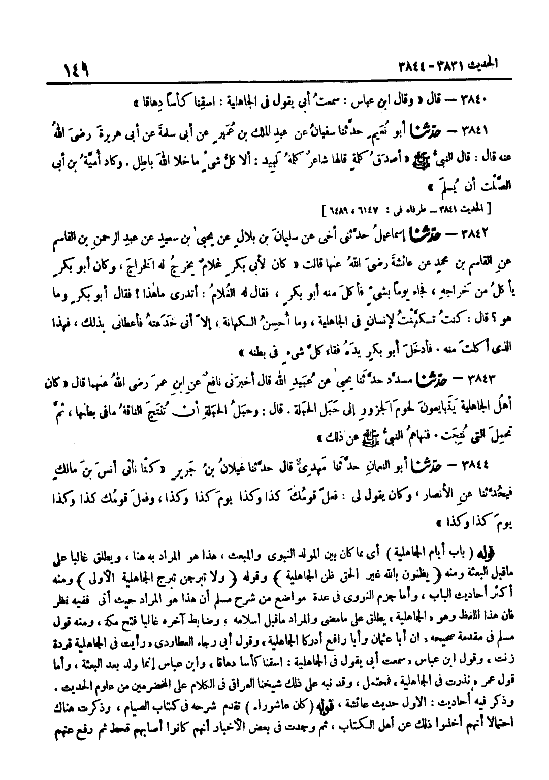 أَيْ مِمَّا كَانَ بَيْنَ الْمَوْلِدِ النَّبَوِيِّ وَالْمَبْعَثِ هَذَا هُوَ الْمُرَادُ بِهِ هُنَا وَيُطْلَقُ غَالِبًا عَلَى مَا قَبْلَ الْبَعْثَةِ وَمِنْهُ يَظُنُّونَ بِاللَّهِ غَيْرَ الْحَقِّ ظَنَّ الْجَاهِلِيَّة وَقَوله وَلَا تبرجن تبرج الْجَاهِلِيَّة الأولى وَمِنْهُ أَكْثَرُ أَحَادِيثِ الْبَابِ وَأَمَّا جَزْمُ النَّوَوِيِّ فِي عِدَّةِ مَوَاضِعَ مِنْ شَرْحِ مُسْلِمٍ أَنَّ هَذَا هُوَ الْمُرَادُ حَيْثُ أَتَى فَفِيهِ نَظَرٌ فَإِنَّ هَذَا اللَّفْظَ وَهُوَ الْجَاهِلِيَّةُ يُطْلَقُ عَلَى مامضى وَالْمُرَادُ مَا قَبْلَ إِسْلَامِهِ وَضَابِطُ آخِرِهِ غَالِبًا فَتْحُ مَكَّةَ وَمِنْهُ قَوْلُ مُسْلِمٍ فِي مُقَدَّمَةِ صَحِيحِهِ أَنَّ أَبَا عُثْمَانَ وَأَبَا رَافِعٍ أَدْرَكَا الْجَاهِلِيَّةَ وَقَوْلُ أَبِي رَجَاءٍ الْعُطَارِدِيِّ رَأَيْتُ فِي الْجَاهِلِيَّة قردة زنت وَقَول بن عَبَّاسٍ سَمِعْتُ أَبِي يَقُولُ فِي الْجَاهِلِيَّةِ اسْقِنَا كاسا دهاقا وبن عَبَّاسٍ إِنَّمَا وُلِدَ بَعْدَ الْبَعْثَةِ وَأَمَّا قَوْلُ عُمَرَ نَذَرْتُ فِي الْجَاهِلِيَّةِ فَمُحْتَمَلٌ وَقَدْ نَبَّهَ عَلَى ذَلِكَ شَيْخُنَا الْعِرَاقِيُّ فِي الْكَلَامِ عَلَى الْمُخَضْرَمِينَ مِنْ عُلُومِ الْحَدِيثِ وَذَكَرَ فِيهِ أَحَادِيثَ الْأَوَّلُ حَدِيثُ عَائِشَةَ