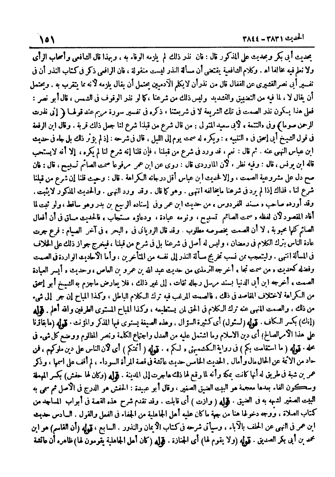 بِحَدِيثِ أَبِي بَكْرٍ وَبِحَدِيثِ عَلِيٍّ الْمَذْكُورِ قَالَ فَإِنْ نَذَرَ ذَلِكَ لَمْ يَلْزَمْهُ الْوَفَاءُ بِهِ وَبِهَذَا قَالَ الشَّافِعِيُّ وَأَصْحَابُ الرَّأْيِ وَلَا نَعْلَمُ فِيهِ مُخَالِفًا اه وَكَلَامُ الشَّافِعِيَّةِ يَقْتَضِي أَنَّ مَسْأَلَةَ النَّذْرِ لَيْسَتْ مَنْقُولَةً فَإِنَّ الرَّافِعِيَّ ذَكَرَ فِي كِتَابِ النَّذْرِ أَنَّ فِي تَفْسِيرِ أَبِي نَصْرٍ الْقُشَيْرِيِّ عَنِ الْقَفَّالِ قَالَ مَنْ نَذَرَ أَنْ لَا يُكَلِّمَ الْآدَمِيِّينَ يَحْتَمِلُ أَنْ يُقَالَ يَلْزَمُهُ لِأَنَّهُ مِمَّا يُتَقَرَّبُ بِهِ وَيَحْتَمِلُ أَنْ يُقَالَ لَا لِمَا فِيهِ مِنَ التَّضْيِيقِ وَالتَّشْدِيدِ وَلَيْسَ ذَلِكَ مِنْ شَرْعِنَا كَمَا لَوْ نَذَرَ الْوُقُوفَ فِي الشَّمْسِ قَالَ أَبُو نَصْرٍ فَعَلَى هَذَا يَكُونُ نَذْرُ الصَّمْتِ فِي تِلْكَ الشَّرِيعَةِ لَا فِي شَرِيعَتِنَا ذَكَرَهُ فِي تَفْسِيرِ سُورَةِ مَرْيَمَ عِنْدَ قَوْلِهَا إِنِّي نَذَرْتُ لِلرَّحْمَنِ صَوْمًا وَفِي التَّتِمَّةِ لِأَبِي سَعِيدٍ الْمُتَوَلِّي مَنْ قَالَ شَرْعُ مَنْ قَبْلَنَا شَرْعٌ لَنَا جَعَلَ ذَلِكَ قربَة وَقَالَ بن الرِّفْعَةِ فِي قَوْلِ الشَّيْخِ أَبِي إِسْحَاقَ فِي التَّنْبِيهِ وَيُكْرَهُ لَهُ صَمْتُ يَوْمٍ إِلَى اللَّيْلِ قَالَ فِي شَرْحِهِ إِذْ لَمْ يُؤْثَرْ ذَلِكَ بل جَاءَ فِي حَدِيث بن عَبَّاسٍ النَّهْيُ عَنْهُ ثُمَّ قَالَ نَعَمْ قَدْ وَرَدَ فِي شَرْعِ مَنْ قَبْلنَا فَإِنْ قُلْنَا إِنَّهُ شَرْعٌ لَنَا لَمْ يُكْرَهْ إِلَّا أَنَّهُ لايستحب قَالَه بن يُونُسَ قَالَ وَفِيهِ نَظَرٌ لِأَنَّ الْمَاوَرْدِيَّ قَالَ رُوِيَ عَن بن عُمَرَ مَرْفُوعًا صَمْتُ الصَّائِمِ تَسْبِيحٌ قَالَ فَإِنْ صَحَّ دَلَّ عَلَى مَشْرُوعِيَّةِ الصَّمْتِ وَإِلَّا فَحَدِيثُ بن عَبَّاسٍ أَقَلُّ دَرَجَاتِهِ الْكَرَاهَةُ قَالَ وَحَيْثُ قُلْنَا إِنَّ شَرْعَ مَنْ قَبْلَنَا شَرْعٌ لَنَا فَذَاكَ إِذَا لَمْ يَرِدْ فِي شَرْعِنَا مَا يُخَالِفُهُ انْتَهَى وَهُوَ كَمَا قَالَ وَقَدْ وَرَدَ النَّهْيُ وَالْحَدِيثُ الْمَذْكُورُ لَا يَثْبُتُ وَقَدْ أَوْرَدَهُ صَاحِبُ مُسْند الفردوس من حَدِيث بن عُمَرَ وَفِي إِسْنَادِهِ الرَّبِيعُ بْنُ بَدْرٍ وَهُوَ سَاقِطٌ وَلَوْ ثَبَتَ لَمَا أَفَادَ الْمَقْصُودَ لِأَنَّ لَفْظَهُ صَمْتُ الصَّائِمِ تَسْبِيحٌ وَنَوْمُهُ عِبَادَةٌ وَدُعَاؤُهُ مُسْتَجَابٌ فَالْحَدِيثُ مُسَاقٌ فِي أَنَّ أَفْعَالَ الصَّائِمِ كُلَّهَا مَحْبُوبَةٌ لَا أَنَّ الصَّمْتَ بِخُصُوصِهِ مَطْلُوبٌ وَقَدْ قَالَ الرُّويَانِيُّ فِي الْبَحْرِ فِي آخِرِ الصِّيَامِ فَرْعٌ جَرَتْ عَادَةُ النَّاسِ بِتَرْكِ الْكَلَامِ فِي رَمَضَانَ وَلَيْسَ لَهُ أَصْلٌ فِي شَرْعِنَا بَلْ فِي شَرْعِ مَنْ قَبْلَنَا فَيَخْرُجُ جَوَازُ ذَلِكَ عَلَى الْخِلَافِ فِي الْمَسْأَلَةِ انْتَهَى وَلْيُتَعَجَّبْ مِمَّنْ نَسَبَ تَخْرِيجَ مَسْأَلَةِ النَّذْرِ إِلَى نَفْسِهِ مِنَ الْمُتَأَخِّرِينَ وَأَمَّا الْأَحَادِيثُ الْوَارِدَةُ فِي الصَّمْتِ وَفَضْلِهِ كَحَدِيثِ مَنْ صَمَتَ نَجَا أَخْرَجَهُ التِّرْمِذِيُّ مِنْ حَدِيثِ عَبْدِ اللَّهِ بْنِ عَمْرِو بْنِ الْعَاصِ وَحَدِيث أيسر الْعِبَادَة الصمت أخرجه بن أَبِي الدُّنْيَا بِسَنَدٍ مُرْسَلٍ رِجَالُهُ ثِقَاتٌ إِلَى غَيْرِ ذَلِكَ فَلَا يُعَارِضُ مَا جَزَمَ بِهِ الشَّيْخُ أَبُو إِسْحَاقَ مِنَ الْكَرَاهَةِ لِاخْتِلَافِ الْمَقَاصِدِ فِي ذَلِكَ فَالصَّمْتُ الْمُرَغَّبُ فِيهِ تَرْكُ الْكَلَامِ الْبَاطِلِ وَكَذَا الْمُبَاحُ إِنْ جَرَّ إِلَى شَيْءٍ مِنْ ذَلِكَ وَالصَّمْتُ الْمَنْهِيُّ عَنْهُ تَرْكُ الْكَلَامِ فِي الْحَقِّ لِمَنْ يَسْتَطِيعُهُ وَكَذَا الْمُبَاحُ الْمُسْتَوِي الطَّرَفَيْنِ وَاللَّهُ أَعْلَمُ قَوْلُهُ إِنَّكِ بِك
