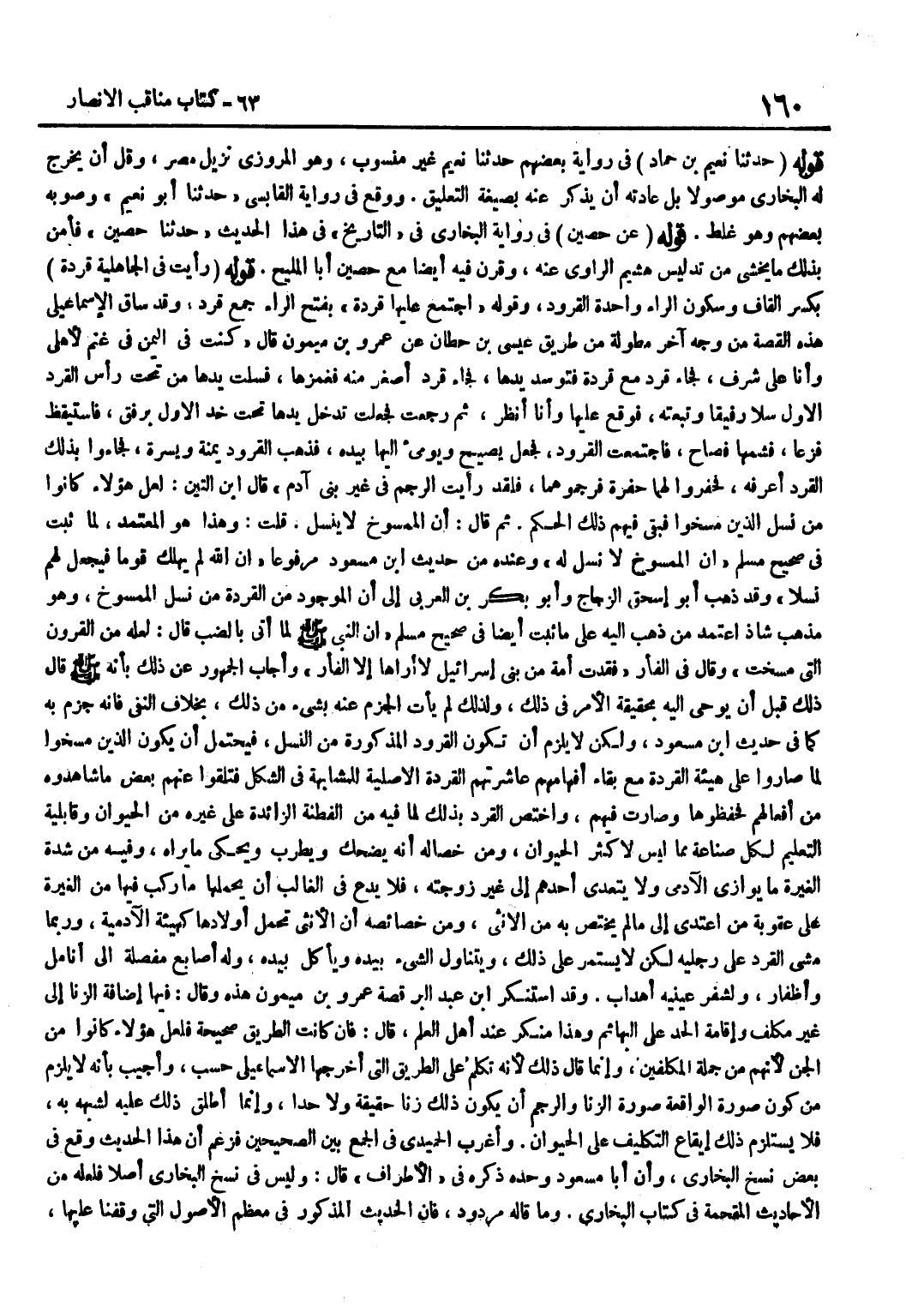 [3849] قَوْلُهُ حَدَّثَنَا نُعَيْمُ بْنُ حَمَّادٍ فِي رِوَايَةِ بَعْضِهِمْ حَدَّثَنَا نُعَيْمٌ غَيْرُ مَنْسُوبٍ وَهُوَ الْمَرْوَزِيُّ نَزِيلُ مِصْرَ وَقَلَّ أَنْ يُخَرِّجَ لَهُ الْبُخَارِيُّ مَوْصُولًا بَلْ عَادَتُهُ أَنْ يَذْكُرَ عَنْهُ بِصِيغَةِ التَّعْلِيقِ وَوَقَعَ فِي رِوَايَةِ الْقَابِسِيِّ حَدَّثَنَا أَبُو نُعَيْمٍ وَصَوَّبَهُ بَعْضُهُمْ وَهُوَ غَلَطٌ قَوْلُهُ عَنْ حُصَيْنٍ فِي رِوَايَةِ الْبُخَارِيِّ فِي التَّارِيخِ فِي هَذَا الْحَدِيثِ حَدَّثَنَا حُصَيْنٌ فَأَمِنَ بِذَلِكَ مَا يَخْشَى مِنْ تَدْلِيسِ هُشَيْمٍ الرَّاوِي عَنْهُ وَقَرَنَ فِيهِ أَيْضًا مَعَ حُصَيْنٍ أَبَا الْمَلِيحِ قَوْلُهُ رَأَيْتُ فِي الْجَاهِلِيَّةِ قِرْدَةً بِكَسْرِ الْقَافِ وَسُكُونِ الرَّاءِ وَاحِدَةُ الْقُرُودِ وَقَوْلُهُ اجْتَمَعَ عَلَيْهَا قِرَدَةٌ بِفَتْحِ الرَّاءِ جَمْعُ قِرْدٍ وَقَدْ سَاقَ الْإِسْمَاعِيلِيُّ هَذِهِ الْقِصَّةَ مِنْ وَجْهٍ آخَرَ مُطَوَّلَةً مِنْ طَرِيقِ عِيسَى بْنِ حِطَّانَ عَنْ عَمْرِو بْنِ مَيْمُونٍ قَالَ كُنْتُ فِي الْيَمَنِ فِي غَنَمٍ لأهلي وانا على شرف فجَاء قرد مَعَ قِرَدَةٍ فَتَوَسَّدَ يَدَهَا فَجَاءَ قِرْدٌ أَصْغَرُ مِنْهُ فَغَمَزَهَا فَسَلَّتْ يَدَهَا مِنْ تَحْتِ رَأْسِ الْقِرْدِ الأول سلا رَقِيقا وَتَبِعَتْهُ فَوَقَعَ عَلَيْهَا وَأَنَا أَنْظُرُ ثُمَّ رَجَعَتْ فَجَعَلَتْ تُدْخِلُ يَدَهَا تَحْتَ خَدِّ الْأَوَّلِ بِرِفْقٍ فَاسْتَيْقَظَ فَزِعًا فَشَمَّهَا فَصَاحَ فَاجْتَمَعَتِ الْقُرُودُ فَجَعَلَ يَصِيحُ وَيُومِئُ إِلَيْهَا بِيَدِهِ فَذَهَبَ الْقُرُودُ يَمْنَةً ويسرة فجاؤوا بِذَلِكَ الْقِرْدِ أَعْرِفُهُ فَحَفَرُوا لَهُمَا حُفْرَةً فَرَجَمُوهُمَا فَلَقَدْ رَأَيْتُ الرَّجْمَ فِي غَيْرِ بَنِي آدَمَ قَالَ بن التِّينِ لَعَلَّ هَؤُلَاءِ كَانُوا مِنْ نَسْلِ الَّذِينَ مُسِخُوا فَبَقِيَ فِيهِمْ ذَلِكَ الْحُكْمُ ثُمَّ قَالَ إِنَّ الْمَمْسُوخَ لَا يَنْسِلُ قُلْتُ وَهَذَا هُوَ الْمُعْتَمَدُ لِمَا ثَبَتَ فِي صَحِيحِ مُسْلِمٍ أَنَّ الْمَمْسُوخَ لَا نَسْلَ لَهُ وَعِنْدَهُ مِنْ حَدِيثِ بن مَسْعُودٍ مَرْفُوعًا إِنَّ اللَّهَ لَمْ يُهْلِكْ قَوْمًا فَيَجْعَلُ لَهُمْ نَسْلًا وَقَدْ ذَهَبَ أَبُو إِسْحَاقَ الزَّجَّاجُ وَأَبُو بَكْرِ بْنِ الْعَرَبِيِّ إِلَى أَنَّ الْمَوْجُودَ مِنَ الْقِرَدَةِ مِنْ نَسْلِ الْمَمْسُوخِ وَهُوَ مَذْهَب شَاذ اعْتمد من ذهب إِلَيْهِ على ماثبت أَيْضًا فِي صَحِيحِ مُسْلِمٍ أَنَّ النَّبِيَّ صَلَّى اللَّهُ عَلَيْهِ وَسَلَّمَ لَمَّا أُتِيَ بِالضَّبِّ قَالَ لَعَلَّهُ مِنَ الْقُرُونِ الَّتِي مُسِخَتْ وَقَالَ فِي الفأر فقدت امة من بني إِسْرَائِيل لااراها إِلَّا الْفَأْرَ وَأَجَابَ الْجُمْهُورُ عَنْ ذَلِكَ بِأَنَّهُ صَلَّى اللَّهُ عَلَيْهِ وَسَلَّمَ قَالَ ذَلِكَ قَبْلَ أَنْ يُوحَى إِلَيْهِ بِحَقِيقَةِ الْأَمْرِ فِي ذَلِكَ وَلِذَلِكَ لَمْ يَأْتِ الْجَزْمُ عَنْهُ بِشَيْءٍ مِنْ ذَلِكَ بِخِلَافِ النَّفْيِ فَإِنَّهُ جَزَمَ بِهِ كَمَا فِي حَدِيث بن مَسْعُودٍ وَلَكِنْ لَا يَلْزَمُ أَنْ تَكُونَ الْقُرُودُ الْمَذْكُورَةُ مِنَ النَّسْلِ فَيَحْتَمِلُ أَنْ يَكُونَ الَّذِينَ مُسِخُوا لَمَّا صَارُوا عَلَى هَيْئَةِ الْقِرَدَةِ مَعَ بَقَاءِ أَفْهَامِهِمْ عَاشَرَتْهُمُ الْقِرَدَةُ الْأَصْلِيَّةُ لِلْمُشَابَهَةِ فِي الشكل فتلقوا عَنْهُم بعض ماشاهدوه مِنْ أَفْعَالِهِمْ فَحَفِظُوهَا وَصَارَتْ فِيهِمْ وَاخْتُصَّ الْقِرْدُ بِذَلِكَ لِمَا فِيهِ مِنَ الْفِطْنَةِ الزَّائِدَةِ عَلَى غَيْرِهِ مِنَ الْحَيَوَانِ وَقَابِلِيَّةِ التَّعْلِيمِ لِكُلِّ صِنَاعَةٍ مِمَّا لَيْسَ لِأَكْثَرِ الْحَيَوَانِ وَمِنْ خِصَالِهِ أَنَّهُ يَضْحَكُ وَيَطْرَبُ وَيَحْكِي مَا يَرَاهُ وَفِيهِ م