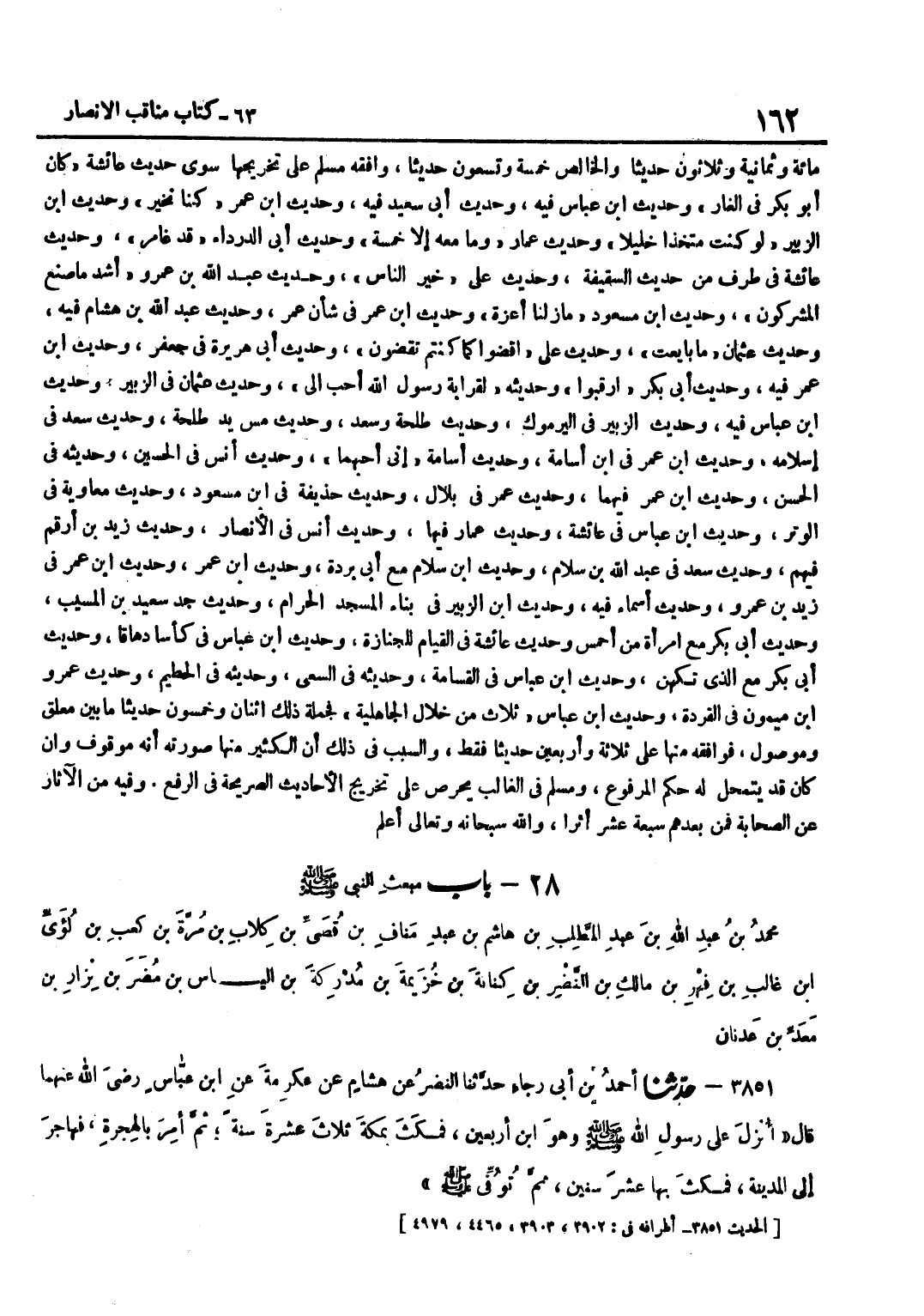 مِائَةٌ وَثَمَانِيَةٌ وَثَلَاثُونَ حَدِيثًا وَالْخَالِصُ خَمْسَةٌ وَتِسْعُونَ حَدِيثًا وَافَقَهُ مُسْلِمٌ عَلَى تَخْرِيجِهَا سِوَى حَدِيثِ عَائِشَةَ كَانَ أَبُو بَكْرٍ فِي الْغَارِ وَحَدِيثِ بن عَبَّاسٍ فِيهِ وَحَدِيثِ أَبِي سَعِيدٍ فِيهِ وَحَدِيثِ بن عمر كُنَّا نخير وَحَدِيث بن الزبير لَو كنت متخذا خَلِيلًا وَحَدِيث عَمَّارٍ وَمَا مَعَهُ إِلَّا خَمْسَةُ وَحَدِيثِ أَبِي الدَّرْدَاءِ قَدْ غَامَرَ وَحَدِيثِ عَائِشَةَ فِي طَرَفٍ مِنْ حَدِيثِ السَّقِيفَةِ وَحَدِيثِ عَلِيٍّ خَيْرُ النَّاسِ وَحَدِيث عبد الله بن عَمْرو أَشد ماصنع الْمُشْركُونَ وَحَدِيث بن مَسْعُود مَا زلنا اعزة وَحَدِيث بن عُمَرَ فِي شَأْنِ عُمَرَ وَحَدِيثِ عَبْدِ اللَّهِ بْنِ هِشَامٍ فِيهِ وَحَدِيثِ عُثْمَانَ مَا بَايَعْتُ وَحَدِيثِ عَلِيٍّ اقْضُوا كَمَا كُنْتُمْ تَقْضُونَ وَحَدِيثِ أبي هُرَيْرَة فِي جَعْفَر وَحَدِيث بن عُمَرَ فِيهِ وَحَدِيثِ أَبِي بَكْرٍ ارْقُبُوا وَحَدِيثِهِ لَقَرَابَةُ رَسُولِ اللَّهِ أَحَبُّ إِلَيَّ وَحَدِيثِ عُثْمَانَ فِي الزبير وَحَدِيث بن عَبَّاسٍ فِيهِ وَحَدِيثِ الزُّبَيْرِ فِي الْيَرْمُوكِ وَحَدِيثِ طَلْحَةَ وَسَعْدٍ وَحَدِيثِ مَسِّ يَدِ طَلْحَةَ وَحَدِيثِ سعد فِي إِسْلَامه وَحَدِيث بن عمر فِي بن أُسَامَةَ وَحَدِيثِ أُسَامَةَ إِنِّي أُحِبُّهُمَا وَحَدِيثِ أَنَسٍ فِي الْحُسَيْن وَحَدِيثه فِي الْحسن وَحَدِيث بن عُمَرَ فِيهِمَا وَحَدِيثِ عُمَرَ فِي بِلَالٍ وَحَدِيثِ حُذَيْفَة فِي بن مَسْعُود وَحَدِيث مُعَاوِيَة فِي الْوتر وَحَدِيث بن عَبَّاسٍ فِي عَائِشَةَ وَحَدِيثِ عَمَّارٍ فِيهَا وَحَدِيثِ أَنَسٍ فِي الْأَنْصَارِ وَحَدِيثِ زَيْدِ بْنِ أَرْقَمَ فِيهِمْ وَحَدِيثِ سَعْدٍ فِي عَبْدِ اللَّهِ بْنِ سَلام وَحَدِيث بن سَلام مَعَ أبي بردة وَحَدِيث بن عمر وَحَدِيث بن عُمَرَ فِي زَيْدِ بْنِ عَمْرٍو وَحَدِيثِ أَسْمَاءَ فِيهِ وَحَدِيث بن الزُّبَيْرِ فِي بِنَاءِ الْمَسْجِدِ الْحَرَامِ وَحَدِيثِ جَدِّ سَعِيدِ بْنِ الْمُسَيَّبِ وَحَدِيثِ أَبِي بَكْرٍ مَعَ امْرَأَةٍ مِنْ أَحْمَسَ وَحَدِيثِ عَائِشَةَ فِي الْقِيَامِ للجنازة وَحَدِيث بن عَبَّاسٍ فِي كَأْسًا دِهَاقًا وَحَدِيثِ أَبِي بَكْرٍ مَعَ الَّذِي تكهن وَحَدِيث بن عَبَّاسٍ فِي الْقَسَامَةِ وَحَدِيثِهِ فِي السَّعْيِ وَحَدِيثِهِ فِي الْحَطِيمِ وَحَدِيثِ عَمْرِو بْنِ مَيْمُونٍ فِي القردة وَحَدِيث بن عَبَّاسٍ ثَلَاثٌ مِنْ خِلَالِ الْجَاهِلِيَّةِ فَجُمْلَةُ ذَلِكَ اثْنَانِ وَخَمْسُونَ حَدِيثًا مَا بَيْنَ مُعَلَّقٍ وَمَوْصُولٍ فَوَافَقَهُ مِنْهَا عَلَى ثَلَاثَةٍ وَأَرْبَعِينَ حَدِيثًا فَقَطْ وَالسَّبَبُ فِي ذَلِكَ أَنَّ الْكَثِيرَ مِنْهَا صُورَتُهُ أَنَّهُ مَوْقُوفٌ وَإِنْ كَانَ قَدْ يُتَمَحَّلُ لَهُ حُكْمُ الْمَرْفُوعِ وَمُسْلِمٌ فِي الْغَالِبِ يَحْرِصُ عَلَى تَخْرِيجِ الْأَحَادِيثِ الصَّرِيحَةِ فِي الرَّفْعِ وَفِيهِ مِنَ الْآثَارِ عَنِ الصَّحَابَةِ فَمَنْ بَعْدَهُمْ سَبْعَةَ عَشَرَ أَثَرًا وَاَللَّهُ سُبْحَانَهُ وَتَعَالَى أَعْلَمُ