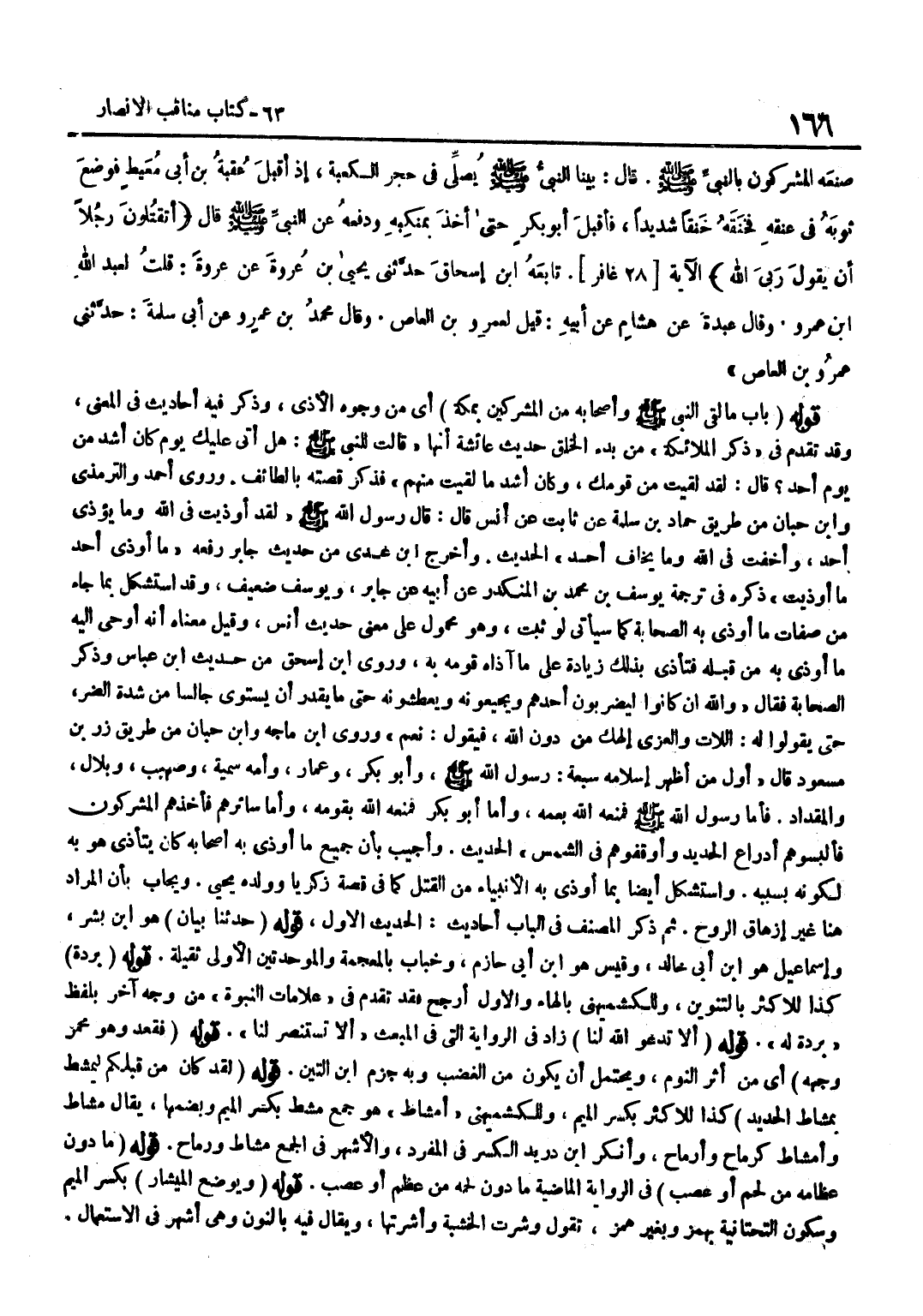 أَي من وُجُوه الْأَذَى وَذَكَرَ فِيهِ أَحَادِيثَ فِي الْمَعْنَى وَقَدْ تَقَدَّمَ فِي ذِكْرِ الْمَلَائِكَةِ مِنْ بَدْءِ الْخَلْقِ حَدِيثُ عَائِشَةَ أَنَّهَا قَالَتْ لِلنَّبِيِّ صَلَّى اللَّهُ عَلَيْهِ وَسَلَّمَ هَلْ أَتَى عَلَيْكَ يَوْمٌ كَانَ أَشَدَّ مِنْ يَوْمِ أُحُدٍ قَالَ لَقَدْ لَقِيتُ من قَوْمك وَكَانَ أَشد مالقيت مِنْهُمْ فَذَكَرَ قِصَّتَهُ بِالطَّائِفِ وَرَوَى أَحْمَدُ وَالتِّرْمِذِيُّ وبن حِبَّانَ مِنْ طَرِيقِ حَمَّادُ بْنُ سَلَمَةَ عَنْ ثَابِتٍ عَنْ أَنَسٌ قَالَ قَالَ رَسُولُ اللَّهِ صَلَّى اللَّهُ عَلَيْهِ وَسَلَّمَ لَقَدْ أُوذِيتُ فِي اللَّهِ وَمَا يُؤْذَى أَحَدٌ وَأُخِفْتُ فِي اللَّهِ وَمَا يخَاف أحد الحَدِيث واخرج بن عَدِيٍّ مِنْ حَدِيثِ جَابِرٍ رَفَعَهُ مَا أُوذِيَ أَحَدٌ مَا أُوذِيتُ ذَكَرَهُ فِي تَرْجَمَةِ يُوسُفَ بْنِ مُحَمَّدِ بْنِ الْمُنْكَدِرِ عَنْ أَبِيهِ عَنْ جَابِرٍ وَيُوسُفُ ضَعِيفٌ وَقَدِ اسْتُشْكِلَ بِمَا جَاءَ مِنْ صِفَاتِ مَا أُوذِيَ بِهِ الصَّحَابَةُ كَمَا سَيَأْتِي لَوْ ثَبَتَ وَهُوَ مَحْمُولٌ عَلَى مَعْنَى حَدِيثِ أَنَسٍ وَقِيلَ مَعْنَاهُ أَنَّهُ أُوحِيَ إِلَيْهِ مَا أُوذِيَ بِهِ مَنْ قَبْلَهُ فَتَأَذَّى بِذَلِكَ زِيَادَةً عَلَى مَا آذَاهُ قَوْمُهُ بِهِ وَرَوَى بن إِسْحَاق من حَدِيث بن عَبَّاس وَذكر الصَّحَابَة فَقَالَ وَالله ان كَانُوا لَيَضْرِبُونَ أَحَدَهُمْ وَيُجِيعُونَهُ وَيُعَطِّشُونَهُ حَتَّى مَا يَقْدِرُ أَنْ يَسْتَوِيَ جَالِسًا مِنْ شِدَّةِ الضَّرِّ حَتَّى يَقُولُوا لَهُ اللَّاتُ وَالْعُزَّى إِلَهُكَ مِنْ دون الله فَيَقُول نعم وروى بن ماجة وبن حِبَّانَ مِنْ طَرِيقِ زِرِّ بْنِ مَسْعُودٍ قَالَ أَوَّلُ مَنْ أَظْهَرَ إِسْلَامَهُ سَبْعَةٌ رَسُولُ اللَّهِ صَلَّى اللَّهُ عَلَيْهِ وَسَلَّمَ وَأَبُو بَكْرٍ وَعَمَّارٌ وَأُمُّهُ سُمَيَّةُ وَصُهَيْبٌ وَبِلَالٌ وَالْمِقْدَادُ فَأَمَّا رَسُولُ اللَّهِ صَلَّى اللَّهُ عَلَيْهِ وَسَلَّمَ فَمَنَعَهُ اللَّهُ بِعَمِّهِ وَأَمَّا أَبُو بَكْرٍ فَمَنَعَهُ اللَّهُ بِقَوْمِهِ وَأَمَّا سَائِرُهُمْ فَأَخَذَهُمُ الْمُشْرِكُونَ فَأَلْبَسُوهُمْ أَدْرَاعَ الْحَدِيدِ وَأَوْقَفُوهُمْ فِي الشَّمْسِ الْحَدِيثَ وَأُجِيبَ بِأَنَّ جَمِيعَ مَا أُوذِيَ بِهِ أَصْحَابُهُ كَانَ يَتَأَذَّى هُوَ بِهِ لِكَوْنِهِ بِسَبَبِهِ وَاسْتُشْكِلَ أَيْضًا بِمَا أُوذِيَ بِهِ الْأَنْبِيَاءُ مِنَ الْقَتْلِ كَمَا فِي قِصَّةِ زَكَرِيَّا وَوَلَدِهِ يَحْيَى وَيُجَابُ بِأَنَّ الْمُرَادَ هُنَا غَيْرُ إِزْهَاقِ الرُّوحِ ثَمَّ ذَكَرَ الْمُصَنِّفُ فِي الْبَابِ أَحَادِيثَ الْحَدِيثُ الْأَوَّلُ