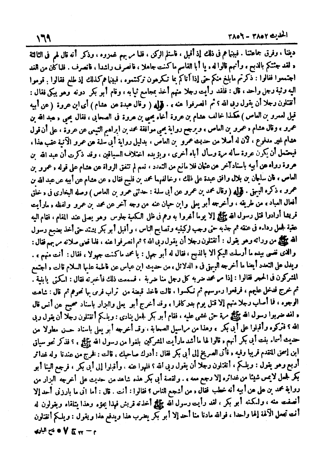 دِينَنَا وَفَرَّقَ جَمَاعَتَنَا فَبَيْنَمَا هُمْ فِي ذَلِكَ إِذْ أَقْبَلَ فَاسْتَلَمَ الرُّكْنَ فَلَمَّا مَرَّ بِهِمْ غَمَزُوهُ وَذَكَرَ أَنَّهُ قَالَ لَهُمْ فِي الثَّالِثَةِ لَقَدْ جِئْتُكُمْ بِالذَّبْحِ وَأَنَّهُمْ قَالُوا لَهُ يَا أَبَا الْقَاسِمِ مَا كُنْتَ جَاهِلًا فَانْصَرِفْ رَاشِدًا فَانْصَرَفَ فَلَمَّا كَانَ مِنَ الْغَدِ اجْتَمَعُوا فَقَالُوا ذَكَرْتُمْ مَا بَلَغَ مِنْكُمْ حَتَّى إِذَا أَتَاكُمْ بِمَا تَكْرَهُونَ تَرَكْتُمُوهُ فَبَيْنَمَا هُمْ كَذَلِكَ إِذْ طَلَعَ فَقَالُوا قُومُوا إِلَيْهِ وَثْبَةَ رَجُلٍ وَاحِدٍ قَالَ فَلَقَدْ رَأَيْتُ رَجُلًا مِنْهُمْ أَخَذَ بِمَجَامِعِ ثِيَابِهِ وَقَامَ أَبُو بَكْرٍ دُونَهُ وَهُوَ يَبْكِي فَقَالَ أَتَقْتُلُونَ رَجُلًا أَنْ يَقُولَ رَبِّيَ اللَّهُ ثُمَّ انْصَرَفُوا عَنْهُ قَوْلُهُ وَقَالَ عَبْدَةُ عَنْ هِشَام أَي بن عُرْوَةَ عَنْ أَبِيهِ قِيلَ لِعَمْرِو بْنِ الْعَاصِ هَكَذَا خَالَفَ هِشَامُ بْنُ عُرْوَةَ أَخَاهُ يَحْيَى بْنَ عُرْوَةَ فِي الصَّحَابِيِّ فَقَالَ يَحْيَى عَبْدُ اللَّهِ بْنُ عَمْرٍو وَقَالَ هِشَامٌ عَمْرُو بْنُ الْعَاصِ وَيُرَجِّحُ رِوَايَةَ يَحْيَى مُوَافَقَةُ مُحَمَّدِ بْنِ إِبْرَاهِيمَ التَّيْمِيِّ عَنْ عُرْوَةَ عَلَى أَنَّ قَوْلَ هِشَامٍ غَيْرُ مَدْفُوعٍ لِأَنَّ لَهُ أَصْلًا مِنْ حَدِيثِ عَمْرِو بْنِ الْعَاصِ بِدَلِيلِ رِوَايَةِ أَبِي سَلَمَةَ عَنْ عَمْرٍو الْآتِيَةِ عَقِبَ هَذَا فَيَحْتَمِلُ أَنْ يَكُونَ عُرْوَةُ سَأَلَهُ مَرَّةً وَسَأَلَ أَبَاهُ أُخْرَى وَيُؤَيِّدُهُ اخْتِلَافُ السِّيَاقَيْنِ وَقَدْ ذَكَرْتُ أَنَّ عَبْدَ اللَّهِ بْنَ عُرْوَةَ رَوَاهُ عَنْ أَبِيهِ بِإِسْنَادٍ آخَرَ عَنْ عُثْمَانَ فَلَا مَانِعَ مِنَ التَّعَدُّدِ نَعَمْ لَمْ تَتَّفِقِ الرُّوَاةُ عَنْ هِشَامٍ عَلَى قَوْلِهِ عَمْرُو بْنُ الْعَاصِ فَإِنَّ سُلَيْمَانَ بْنَ بِلَالٍ وَافَقَ عَبْدَةَ عَلَى ذَلِكَ وَخَالَفَهُمَا مُحَمَّدُ بْنُ فُلَيْحٍ فَقَالَ عَنْ هِشَامٍ عَنْ أَبِيهِ عَنْ عَبْدِ اللَّهِ بْنِ عَمْرٍو ذَكَرَهُ الْبَيْهَقِيُّ قَوْلُهُ وَقَالَ مُحَمَّدُ بْنُ عَمْرٍو عَنْ أَبِي سَلَمَةَ حَدَّثَنِي عَمْرُو بْنُ الْعَاصِ وَصَلَهُ الْبُخَارِيُّ فِي خَلْقِ أَفْعَالِ الْعِبَادِ مِنْ طَرِيقِهِ وَأخرجه أَبُو يعلى وبن حِبَّانَ عَنْهُ مِنْ وَجْهٍ آخَرَ عَنْ مُحَمَّدِ بْنِ عَمْرٍو وَلَفْظُهُ مَا رَأَيْتُ قُرَيْشًا أَرَادُوا قَتْلَ رَسُولُ اللَّهِ صَلَّى اللَّهُ عَلَيْهِ وَسَلَّمَ إِلَّا يَوْمًا أُغْرُوا بِهِ وَهُمْ فِي ظِلِّ الْكَعْبَةِ جُلُوسٌ وَهُوَ يُصَلِّي عِنْدَ الْمَقَامِ فَقَامَ إِلَيْهِ عُقْبَةُ فَجَعَلَ رِدَاءَهُ فِي عُنُقِهِ ثُمَّ جذبه حَتَّى وَجب لِرُكْبَتَيْهِ وَتَصَايَحَ النَّاسُ وَأَقْبَلَ أَبُو بَكْرٍ يَشْتَدُّ حَتَّى أَخَذَ بِضَبْعِ رَسُولِ اللَّهِ صَلَّى اللَّهُ عَلَيْهِ وَسَلَّمَ مِنَ وَرَائِهِ وَهُوَ يَقُولُ أَتَقْتُلُونَ رجلا ان يَقُول رَبِّي الله ثُمَّ انْصَرَفُوا عَنْهُ فَلَمَّا قَضَى صَلَاتَهُ مَرَّ بِهِمْ فَقَالَ وَالَّذِي نَفْسِي بِيَدِهِ مَا أُرْسِلْتُ إِلَيْكُمْ إِلَّا بِالذَّبْحِ فَقَالَ لَهُ أَبُو جَهْلٍ يَا مُحَمَّدُ مَا كُنْتَ جَهُولًا فَقَالَ أَنْتَ مِنْهُمْ وَيَدُلُّ عَلَى التَّعَدُّدِ أَيْضًا مَا أَخْرَجَهُ الْبَيْهَقِيّ فِي الدَّلَائِل من حَدِيث بن عَبَّاسٍ عَنْ فَاطِمَةَ عَلَيْهَا السَّلَامُ قَالَتْ اجْتَمَعَ الْمُشْرِكُونَ فِي الْحِجْرِ فَقَالُوا إِذَا مَرَّ مُحَمَّدٌ ضَرَبَهُ كُلُّ رَجُلٍ مِنَّا ضَرْبَةً فَسَمِعْتُ ذَلِكَ فَأَخْبَرْتُهُ فَقَالَ اسْكُتِي يَا بُنَيَّةُ ثُمَّ خَرَجَ فَدخل عَلَيْهِم فَرفعُوا رؤوسهم ثُمَّ نَكَسُوا قَالَتْ فَأَخَذَ قَبْضَةً مِنْ تُرَابٍ فَرَمَى بِهَا نَح