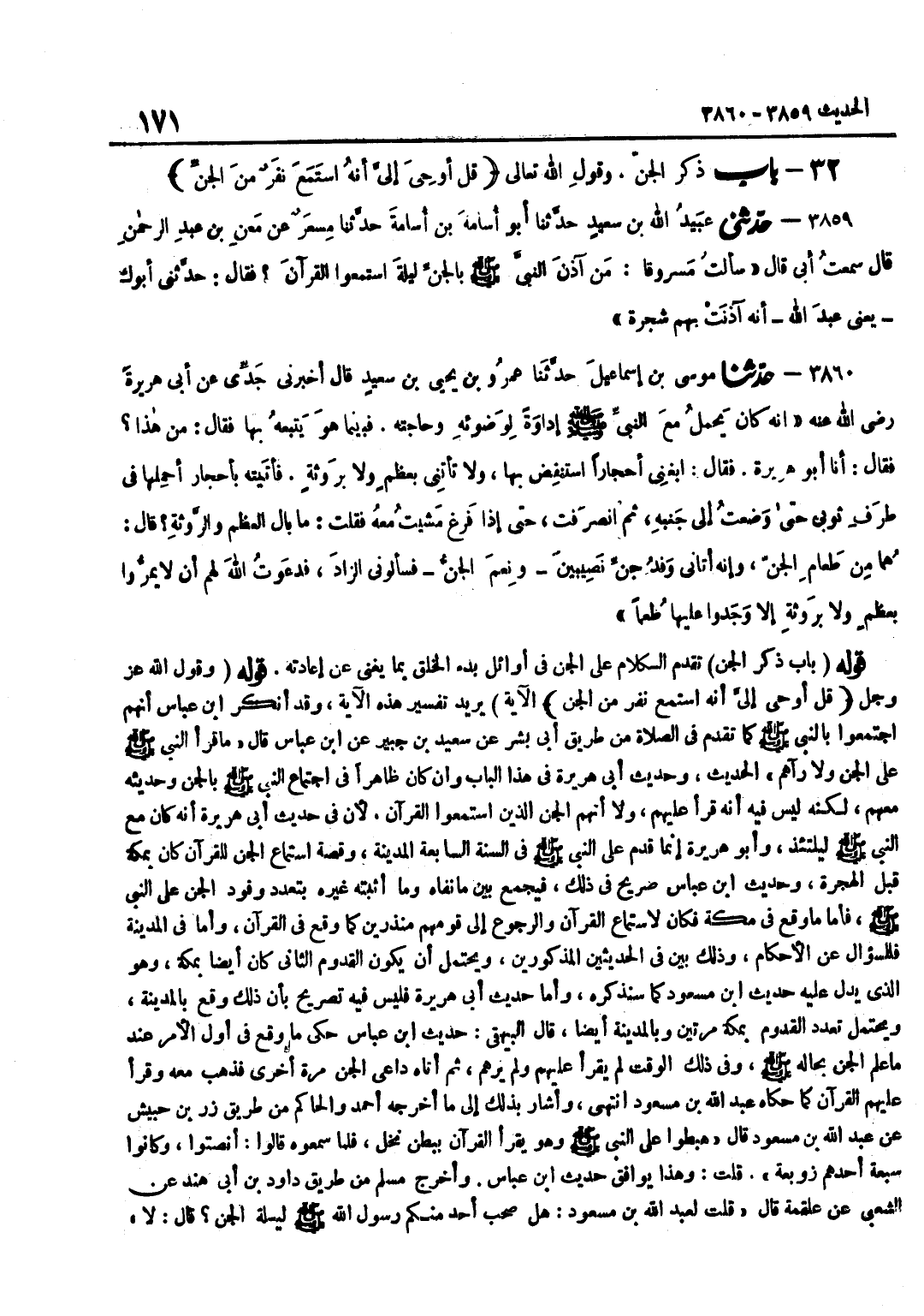 تَقَدَّمَ الْكَلَامُ عَلَى الْجِنِّ فِي أَوَائِلِ بَدْءِ الْخَلْقِ بِمَا يُغْنِي عَنْ إِعَادَتِهِ قَوْلُهُ وَقَوْلُ اللَّهِ عَزَّ وَجَلَّ قُلْ أُوحِيَ إِلَيَّ أَنَّهُ اسْتَمَعَ نَفَرٌ مِنَ الْجِنّ الْآيَةَ يُرِيدُ تَفْسِيرَ هَذِهِ الْآيَةِ وَقَدْ انكر بن عَبَّاسٍ أَنَّهُمُ اجْتَمَعُوا بِالنَّبِيِّ صَلَّى اللَّهُ عَلَيْهِ وَسَلَّمَ كَمَا تَقَدَّمَ فِي الصَّلَاةِ مِنْ طَرِيقِ أَبِي بِشْرٍ عَنْ سَعِيدِ بْنِ جُبَيْرٍ عَنِ بن عَبَّاس قَالَ ماقرأ النَّبِيُّ صَلَّى اللَّهُ عَلَيْهِ وَسَلَّمَ عَلَى الْجِنِّ وَلَا رَآهُمْ الْحَدِيثَ وَحَدِيثُ أَبِي هُرَيْرَةَ فِي هَذَا الْبَابِ وَإِنْ كَانَ ظَاهِرًا فِي اجْتِمَاعِ النَّبِيِّ صَلَّى اللَّهُ عَلَيْهِ وَسَلَّمَ بِالْجِنِّ وَحَدِيثِهِ مَعَهُمْ لَكِنَّهُ لَيْسَ فِيهِ أَنَّهُ قَرَأَ عَلَيْهِمْ وَلَا أَنَّهُمُ الْجِنُّ الَّذِينَ اسْتَمَعُوا الْقُرْآنَ لِأَنَّ فِي حَدِيثِ أَبِي هُرَيْرَةَ أَنَّهُ كَانَ مَعَ النَّبِيِّ صَلَّى اللَّهُ عَلَيْهِ وَسَلَّمَ لَيْلَتَئِذٍ وَأَبُو هُرَيْرَةَ إِنَّمَا قَدِمَ عَلَى النَّبِيِّ صَلَّى اللَّهُ عَلَيْهِ وَسَلَّمَ فِي السَّنَةِ السَّابِعَةِ الْمَدِينَةَ وَقِصَّةُ اسْتِمَاعِ الْجِنِّ لِلْقُرْآنِ كَانَ بِمَكَّةَ قَبْلَ الْهِجْرَةِ وَحَدِيث بن عَبَّاسٍ صَرِيحٌ فِي ذَلِكَ فَيُجْمَعُ بَيْنَ مَا نَفَاهُ وَمَا أَثْبَتَهُ غَيْرُهُ بِتَعَدُّدِ وُفُودِ الْجِنِّ عَلَى النَّبِيِّ صَلَّى اللَّهُ عَلَيْهِ وَسَلَّمَ فَأَمَّا مَا وَقَعَ فِي مَكَّةَ فَكَانَ لِاسْتِمَاعِ الْقُرْآنِ وَالرُّجُوعِ إِلَى قَوْمِهِمْ مُنْذِرِينَ كَمَا وَقَعَ فِي الْقُرْآنِ وَأَمَّا فِي الْمَدِينَةِ فَلِلسُّؤَالِ عَنِ الْأَحْكَامِ وَذَلِكَ بَيِّنٌ فِي الْحَدِيثَيْنِ الْمَذْكُورَيْنِ وَيَحْتَمِلُ أَنْ يَكُونَ الْقُدُومُ الثَّانِي كَانَ أَيْضًا بِمَكَّةَ وَهُوَ الَّذِي يدل عَلَيْهِ حَدِيث بن مَسْعُودٍ كَمَا سَنَذْكُرُهُ وَأَمَّا حَدِيثُ أَبِي هُرَيْرَةَ فَلَيْسَ فِيهِ تَصْرِيحٌ بِأَنَّ ذَلِكَ وَقَعَ بِالْمَدِينَةِ وَيُحْتَمَلُ تَعَدُّدُ الْقُدُومِ بِمَكَّةَ مَرَّتَيْنِ وَبِالْمَدِينَةِ أَيْضًا قَالَ الْبَيْهَقِيّ حَدِيث بن عَبَّاسٍ حَكَى مَا وَقَعَ فِي أَوَّلِ الْأَمْرِ عِنْدَمَا عَلِمَ الْجِنُّ بِحَالِهِ صَلَّى اللَّهُ عَلَيْهِ وَسَلَّمَ وَفِي ذَلِكَ الْوَقْتِ لَمْ يَقْرَأْ عَلَيْهِمْ وَلَمْ يَرَهُمْ ثُمَّ أَتَاهُ دَاعِي الْجِنِّ مَرَّةً أُخْرَى فَذَهَبَ مَعَهُ وَقَرَأَ عَلَيْهِمُ الْقُرْآنَ كَمَا حَكَاهُ عَبْدُ اللَّهِ بْنُ مَسْعُودٍ انْتَهَى وَأَشَارَ بِذَلِكَ إِلَى مَا أَخْرَجَهُ أَحْمَدُ وَالْحَاكِمُ مِنْ طَرِيقِ زِرِّ بْنِ حُبَيْشٍ عَنْ عَبْدِ اللَّهِ بْنِ مَسْعُودٍ قَالَ هَبَطُوا عَلَى النَّبِيِّ صَلَّى اللَّهُ عَلَيْهِ وَسَلَّمَ وَهُوَ يَقْرَأُ الْقُرْآنَ بِبَطْنِ نَخْلٍ فَلَمَّا سَمِعُوهُ قَالُوا أَنْصِتُوا وَكَانُوا سَبْعَةً أحدهم زَوْبَعَة قلت وَهَذَا يُوَافق حَدِيث بن عَبَّاسٍ وَأَخْرَجَ مُسْلِمٌ مِنْ طَرِيقِ دَاوُدَ بْنِ أَبِي هِنْدٍ عَنِ الشَّعْبِيِّ عَنْ عَلْقَمَةَ قَالَ قُلْتُ لِعَبْدِ اللَّهِ بْنِ مَسْعُودٍ هَلْ صَحِبَ أَحَدٌ مِنْكُمْ رَسُولُ اللَّهِ صَلَّى اللَّهُ عَلَيْهِ وَسَلَّمَ لَيْلَةً الْجِنِّ قَالَ لَا