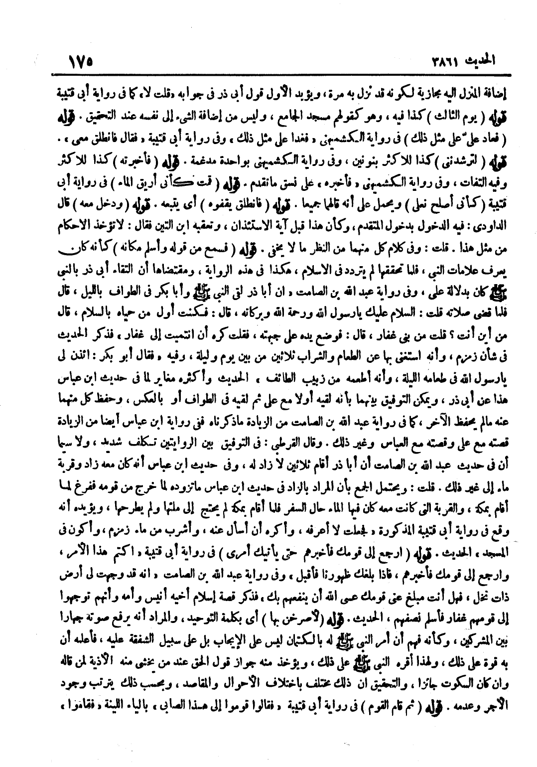 إِضَافَةُ الْمَنْزِلِ إِلَيْهِ مَجَازِيَّةً لِكَوْنِهِ قَدْ نَزَلَ بِهِ مَرَّةً وَيُؤَيِّدُ الْأَوَّلَ قَوْلُ أَبِي ذَرٍّ فِي جَوَابِهِ قُلْتُ لَا كَمَا فِي رِوَايَةِ أَبِي قُتَيْبَةَ قَوْلُهُ يَوْمَ الثَّالِثِ كَذَا فِيهِ وَهُوَ كَقَوْلِهِمْ مَسْجِدُ الْجَامِعِ وَلَيْسَ مِنْ إِضَافَةِ الشَّيْءِ إِلَى نَفْسِهِ عِنْدَ التَّحْقِيقِ قَوْلُهُ فَعَادَ عَلِيٌّ عَلَى مِثْلِ ذَلِكَ فِي رِوَايَةِ الْكُشْمِيهَنِيِّ فَغَدَا عَلَى مِثْلِ ذَلِكَ وَفِي رِوَايَةِ أَبِي قُتَيْبَةَ فَقَالَ فَانْطَلِقْ مَعِي قَوْلُهُ لَتُرْشِدَنَّنِي كَذَا لِلْأَكْثَرِ بِنُونَيْنِ وَفِي رِوَايَةِ الْكُشْمِيهَنِيِّ بِوَاحِدَةٍ مُدْغَمَةٍ قَوْلُهُ فَأَخْبَرْتُهُ كَذَا لِلْأَكْثَرِ وَفِيهِ الْتِفَاتٌ وَفِي رِوَايَةِ الْكُشْمِيهَنِيِّ فَأَخْبَرَهُ عَلَى نَسَقِ مَا تَقَدَّمَ قَوْلُهُ قُمْتُ كَأَنِّي أُرِيقُ الْمَاءَ فِي رِوَايَةِ أَبِي قُتَيْبَةَ كَأَنِّي أُصْلِحُ نَعْلِي وَيُحْمَلُ عَلَى أَنَّهُ قَالَهُمَا جَمِيعًا قَوْلُهُ فَانْطَلَقَ يَقْفُوهُ أَيْ يَتْبَعُهُ قَوْلُهُ وَدَخَلَ مَعَهُ قَالَ الدَّاوُدِيُّ فِيهِ الدُّخُولُ بِدُخُولِ الْمُتَقَدِّمِ وَكَأَنَّ هَذَا قَبْلَ آيَةِ الاسْتِئْذَان وَتعقبه بن التِّين فَقَالَ لاتؤخذ الْأَحْكَامُ مِنْ مِثْلِ هَذَا قُلْتُ وَفِي كَلَامِ كُلٍّ مِنْهُمَا مِنَ النَّظَرِ مَا لَا يَخْفَى قَوْلُهُ فَسَمِعَ مِنْ قَوْلِهِ وَأَسْلَمَ مَكَانَهُ كَأَنَّهُ كَانَ يَعْرِفُ عَلَامَاتِ النَّبِيِّ فَلَمَّا تَحَقَّقَهَا لَمْ يَتَرَدَّدْ فِي الْإِسْلَامِ هَكَذَا فِي هَذِهِ الرِّوَايَةِ وَمُقْتَضَاهَا أَنَّ الْتِقَاءَ أَبِي ذَرٍّ بِالنَّبِيِّ صَلَّى اللَّهُ عَلَيْهِ وَسَلَّمَ كَانَ بِدَلَالَةِ عَلِيٍّ وَفِي رِوَايَةِ عَبْدِ اللَّهِ بْنِ الصَّامِتِ أَنَّ أَبَا ذَرٍّ لَقِيَ النَّبِيَّ صَلَّى اللَّهُ عَلَيْهِ وَسَلَّمَ وَأَبَا بَكْرٍ فِي الطَّوَافِ بِاللَّيْلِ قَالَ فَلَمَّا قَضَى صَلَاتَهُ قُلْتُ السَّلَامُ عَلَيْكَ يَا رَسُولَ اللَّهِ وَرَحْمَةُ اللَّهِ وَبَرَكَاتُهُ قَالَ فَكُنْتُ أَوَّلَ مَنْ حَيَّاهُ بِالسَّلَامِ قَالَ مِنْ أَيْنَ أَنْتَ قُلْتُ مِنَ بَنِي غِفَارٍ قَالَ فَوَضَعَ يَدَهُ عَلَى جَبْهَتِهِ فَقُلْتُ كَرِهَ أَنِ انْتَمَيْتُ إِلَى غِفَارٍ فَذَكَرَ الْحَدِيثَ فِي شَأْنِ زَمْزَمَ وَأَنَّهُ اسْتَغْنَى بِهَا عَنِ الطَّعَامِ وَالشَّرَابِ ثَلَاثِينَ مِنْ بَيْنِ يَوْمٍ وَلَيْلَةٍ وَفِيهِ فَقَالَ أَبُو بَكْرٍ ائْذَنْ لِي يَا رَسُولَ اللَّهِ فِي طَعَامِهِ اللَّيْلَةَ وَأَنَّهُ أَطْعَمَهُ مِنْ زَبِيبِ الطَّائِفِ الْحَدِيثُ واكثره مُغَاير لما فِي حَدِيث بن عَبَّاسٍ هَذَا عَنْ أَبِي ذَرٍّ وَيُمْكِنُ التَّوْفِيقُ بَيْنَهُمَا بِأَنَّهُ لَقِيَهُ أَوَّلًا مَعَ عَلِيٍّ ثُمَّ لَقِيَهُ فِي الطَّوَافِ أَوْ بِالْعَكْسِ وَحَفِظَ كُلٌّ مِنْهُمَا عَنْهُ مَا لَمْ يَحْفَظِ الْآخَرُ كَمَا فِي رِوَايَةِ عَبْدِ اللَّهِ بْنِ الصَّامِتِ مِنَ الزِّيَادَة مَا ذَكرْنَاهُ فَفِي رِوَايَة بن عَبَّاسٍ أَيْضًا مِنَ الزِّيَادَةِ قِصَّتُهُ مَعَ عَلِيٍّ وَقِصَّتُهُ مَعَ الْعَبَّاسِ وَغَيْرُ ذَلِكَ وَقَالَ الْقُرْطُبِيُّ فِي التَّوْفِيقِ بَيْنَ الرِّوَايَتَيْنِ تَكَلُّفٌ شَدِيدٌ وَلَا سِيَّمَا أَنَّ فِي حَدِيثِ عَبْدِ اللَّهِ بْنِ الصَّامِتِ أَنَّ أَبَا ذَرٍّ أَقَامَ ثَلَاثِينَ لَا زَاد لَهُ وَفِي حَدِيث بن عَبَّاسٍ أَنَّهُ كَانَ مَعَهُ زَادٌ وَقِرْبَةُ مَاءٍ إِلَى غَيْرِ ذَلِكَ قُلْتُ وَيَحْتَمِلُ الْجَمْعُ بِأَنَّ المُرَاد بالزاد فِي حَدِيث بن عَبَّاسٍ مَا تَزَوَّدَهُ لَمَّا خَرَجَ مِنْ قَوْمِهِ فَفَرَغَ لَمَّا أَقَامَ بِمَكَّةَ وَالْقِرْبَةُ الَّتِي كَانَتْ مَعَهُ كَانَ فِيهَا الْمَاءُ 