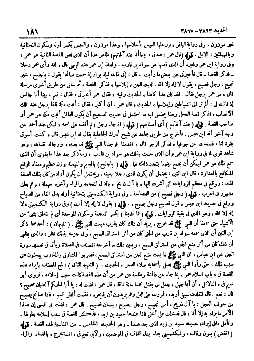 غَيْرَ مَوْزُونٍ وَفِي رِوَايَةِ الْبَاقِرِ وَرَحْلُهَا الْعِيسُ بِأَحْلَاسِهَا وَهَذَا مَوْزُونٌ وَالْعِيسُ بِكَسْرِ أَوَّلِهِ وَسُكُونِ التَّحْتَانِيَّةِ وَبِالْمُهْمَلَتَيْنِ الْإِبِلُ قَوْلُهُ قَالَ عُمَرُ صَدَقَ بَيْنَمَا أَنَا عِنْدَ آلِهَتِهِمْ ظَاهِرُ هَذَا أَنَّ الَّذِي قَصَّ الْقِصَّةَ الثَّانِيَةَ هُوَ عُمَرُ وَفِي رِوَايَة بن عُمَرَ وَغَيْرِهِ أَنَّ الَّذِي قَصَّهَا هُوَ سَوَادُ بن قَارب وَلَفظ بن عُمَرَ عِنْدَ الْبَيْهَقِيِّ قَالَ لَقَدْ رَأَى عُمَرُ رَجُلًا فَذَكَرَ الْقِصَّةَ قَالَ فَأَخْبِرْنِي عَنْ بَعْضِ مَا رَأَيْتَ قَالَ إِنِّي ذَاتَ لَيْلَةٍ بِوَادٍ إِذْ سَمِعْتُ صَائِحًا يَقُولُ يَا جَلِيحْ خَبَرٌ نَجِيحْ رَجُلٌ فَصِيحْ يَقُولُ لَا إِلَهَ إِلَّا اللَّهُ عَجِبْتُ لِلْجِنِّ وَإِبْلَاسِهَا فَذَكَرَ الْقِصَّةَ ثُمَّ سَاقَ مِنْ طَرِيقٍ أُخْرَى مُرْسَلَةٍ قَالَ مَرَّ عُمَرُ بِرَجُلٍ فَقَالَ لَقَدْ كَانَ هَذَا كَاهِنًا الْحَدِيثُ وَفِيهِ فَقَالَ عُمَرُ أَخْبِرْنِي فَقَالَ نَعَمْ بَيْنَا أَنَا جَالِسٌ إِذْ قَالَتْ لِي أَلَمْ تَرَ إِلَى الشَّيَاطِينِ وَإِبْلَاسِهَا الْحَدِيثُ قَالَ عُمَرُ اللَّهُ أَكْبَرُ فَقَالَ أَتَيْتُ مَكَّةَ فَإِذَا بِرَجُلٍ عِنْدَ تِلْكَ الْأَنْصَابِ فَذَكَرَ قِصَّةَ الْعِجْلِ وَهَذَا يُحْتَمَلُ فِيهِ مَا احْتُمِلَ فِي حَدِيثِ الصَّحِيحِ أَنْ يَكُونَ الْقَائِلُ أَتَيْتُ مَكَّةَ هُوَ عُمَرُ أَوْ صَاحِبُ الْقِصَّةِ قَوْلُهُ عِنْدَ آلِهَتِهِمْ أَيْ أَصْنَامُهُمْ قَوْلُهُ إِذْ جَاءَ رَجُلٌ لَمْ أَقِفْ عَلَى اسْمِهِ لَكِنْ عِنْدَ أَحْمَدَ مِنْ وَجْهٍ اخر انه بن عَبْسٍ فَأَخْرَجَ مِنْ طَرِيقِ مُجَاهِدٍ عَنْ شَيْخٍ أدْرك الْجَاهِلِيَّة يُقَال لَهُ بن عَبْسٍ قَالَ كُنْتُ أَسُوقُ بَقَرَةً لَنَا فَسَمِعْتُ مِنْ جَوْفِهَا فَذَكَرَ الرَّجَزَ قَالَ فَقَدِمْنَا فَوَجَدْنَا النَّبِيَّ صَلَّى اللَّهُ عَلَيْهِ وَسَلَّمَ قَدْ بُعِثَ وَرِجَالُهُ ثِقَاتٌ وَهُوَ شَاهِدٌ قَوِيٌّ لِمَا فِي رِوَايَة بن عُمَرَ وَأَنَّ الَّذِي حَدَّثَ بِذَلِكَ هُوَ سَوَادُ بْنُ قَارِبٍ وَسَأَذْكُرُ بَعْدَ هَذَا مَا يُقَوِّي أَنَّ الَّذِي سَمِعَ ذَلِكَ هُوَ عُمَرُ فَيُمْكِنُ أَنْ يُجْمَعَ بَيْنَهُمَا بِتَعَدُّدِ ذَلِكَ لَهُمَا قَوْلُهُ يَا جَلِيحْ بِالْجِيمِ وَالْمُهْمَلَةِ بِوَزْنِ عَظِيمٍ وَمَعْنَاهُ الوقح المكافح بالعداوة قَالَ بن التِّينِ يَحْتَمِلُ أَنْ يَكُونَ نَادَى رَجُلًا بِعَيْنِهِ وَيَحْتَمِلُ أَنْ يَكُونَ أَرَادَ مَنْ كَانَ بِتِلْكَ الصِّفَةِ قُلْتُ وَوَقَعَ فِي مُعْظَمِ الرِّوَايَاتِ الَّتِي أَشَرْتُ إِلَيْهَا يَا آلَ ذَرِيحْ بِالذَّالِ الْمُعْجَمَةِ وَالرَّاءِ وَآخِرُهُ مُهْمَلَةٌ وَهُمْ بَطْنٌ مَشْهُورٌ فِي الْعَرَبِ قَوْلُهُ رَجُلٌ فَصِيحٌ مِنَ الْفَصَاحَةِ وَفِي رِوَايَةِ الْكُشْمِيهَنِيِّ بِتَحْتَانِيَّةٍ أَوَّلَهُ بَدَلَ الْفَاءِ مِنَ الصياح وَوَقع فِي حَدِيث بن عَبْسٍ قَوْلٌ فَصِيحْ رَجُلٌ يَصِيحْ قَوْلُهُ يَقُولُ لَا إِلَهَ إِلَّا أَنْتَ وَفِي رِوَايَةِ الْكُشْمِيهَنِيِّ لَا إِلَهَ إِلَّا اللَّهُ وَهُوَ الَّذِي فِي بَقِيَّةِ الرِّوَايَاتِ قَوْلُهُ فَمَا نَشِبْنَا بِكَسْرِ الْمُعْجَمَةِ وَسُكُونِ الْمُوَحَّدَةِ أَيْ لَمْ نَتَعَلَّقْ بِشَيْءٍ مِنَ الْأَشْيَاءِ حَتَّى سَمِعْنَا أَنَّ النَّبِيَّ صَلَّى اللَّهُ عَلَيْهِ وَسَلَّمَ قَدِ خَرَجَ يُرِيدُ أَنْ ذَلِكَ كَانَ بِقُرْبِ مَبْعَثِ النَّبِيِّ صَلَّى اللَّهُ عَلَيْهِ وَسلم تَنْبِيهَانِ أَحدهمَا ذكر بن التِّينِ أَنَّ الَّذِي سَمِعَهُ سَوَادُ بْنُ قَارِبٍ مِنَ الْجِنِّيِّ كَانَ مِنْ أَثَرِ اسْتِرَاقِ السَّمْعِ وَفِي جَزْمِهِ بِذَلِكَ نَظَرٌ وَالَّذِي يَظْهَرُ أَنَّ ذَلِكَ كَانَ مِنْ 
