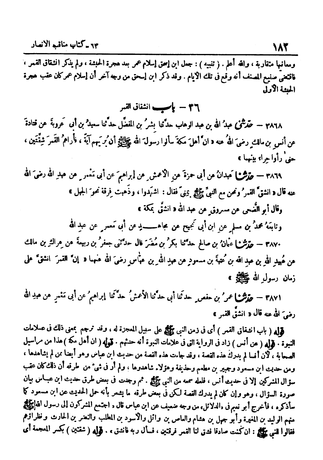 [3868] قَوْلُهُ أَنَّ أَهْلَ مَكَّةَ هَذَا مِنْ مَرَاسِيلِ الصَّحَابَةِ لِأَنَّ أَنَسًا لَمْ يُدْرِكْ هَذِهِ الْقِصَّةَ وَقد جَاءَت هَذِه الْقِصَّة من حَدِيث بن عَبَّاسٍ وَهُوَ أَيْضًا مِمَّنْ لَمْ يُشَاهِدْهَا وَمِنْ حَدِيث بن مَسْعُودٍ وَجُبَيْرِ بْنِ مُطْعِمٍ وَحُذَيْفَةَ وَهَؤُلَاءِ شَاهَدُوهَا وَلَمْ أَرَ فِي شَيْءٍ مِنْ طُرُقِهِ أَنَّ ذَلِكَ كَانَ عَقِبَ سُؤَالِ الْمُشْرِكِينَ إِلَّا فِي حَدِيثِ أَنَسٍ فَلَعَلَّهُ سَمِعَهُ مِنَ النَّبِيِّ صَلَّى اللَّهُ عَلَيْهِ وَسَلَّمَ ثُمَّ وَجَدْتُ فِي بَعْضِ طرق حَدِيث بن عَبَّاسٍ بَيَانُ صُورَةِ السُّؤَالِ وَهُوَ وَإِنْ كَانَ لَمْ يُدْرِكِ الْقِصَّةَ لَكِنْ فِي بَعْضِ طُرُقِهِ مَا يشْعر بِأَنَّهُ حمل الحَدِيث عَن بن مَسْعُودٍ كَمَا سَأَذْكُرُهُ فَأَخْرَجَ أَبُو نُعَيْمٍ فِي الدَّلَائِل من وَجه ضَعِيف عَن بن عَبَّاسٍ قَالَ اجْتَمَعَ الْمُشْرِكُونَ إِلَى رَسُولِ اللَّهِ صَلَّى اللَّهُ عَلَيْهِ وَسَلَّمَ مِنْهُمِ الْوَلِيدُ بْنُ الْمُغِيرَةِ وَأَبُو جَهْلِ بْنِ هِشَامٍ وَالْعَاصِ بْنِ وَائِلٍ وَالْأَسْوَدُ بْنُ الْمُطَّلِبِ وَالنَّضْرُ بْنُ الْحَارِثِ ونظرائهم فَقَالُوا لِلنَّبِيِّ صَلَّى اللَّهُ عَلَيْهِ وَسَلَّمَ إِنْ كُنْتَ صَادِقًا فَشُقَّ لَنَا الْقَمَرَ فِرْقَتَيْنِ فَسَأَلَ رَبَّهُ فَانْشَقَّ قَوْلُهُ شِقَّتَيْنِ بِكَسْرِ الْمُعْجَمَةِ أَيْ