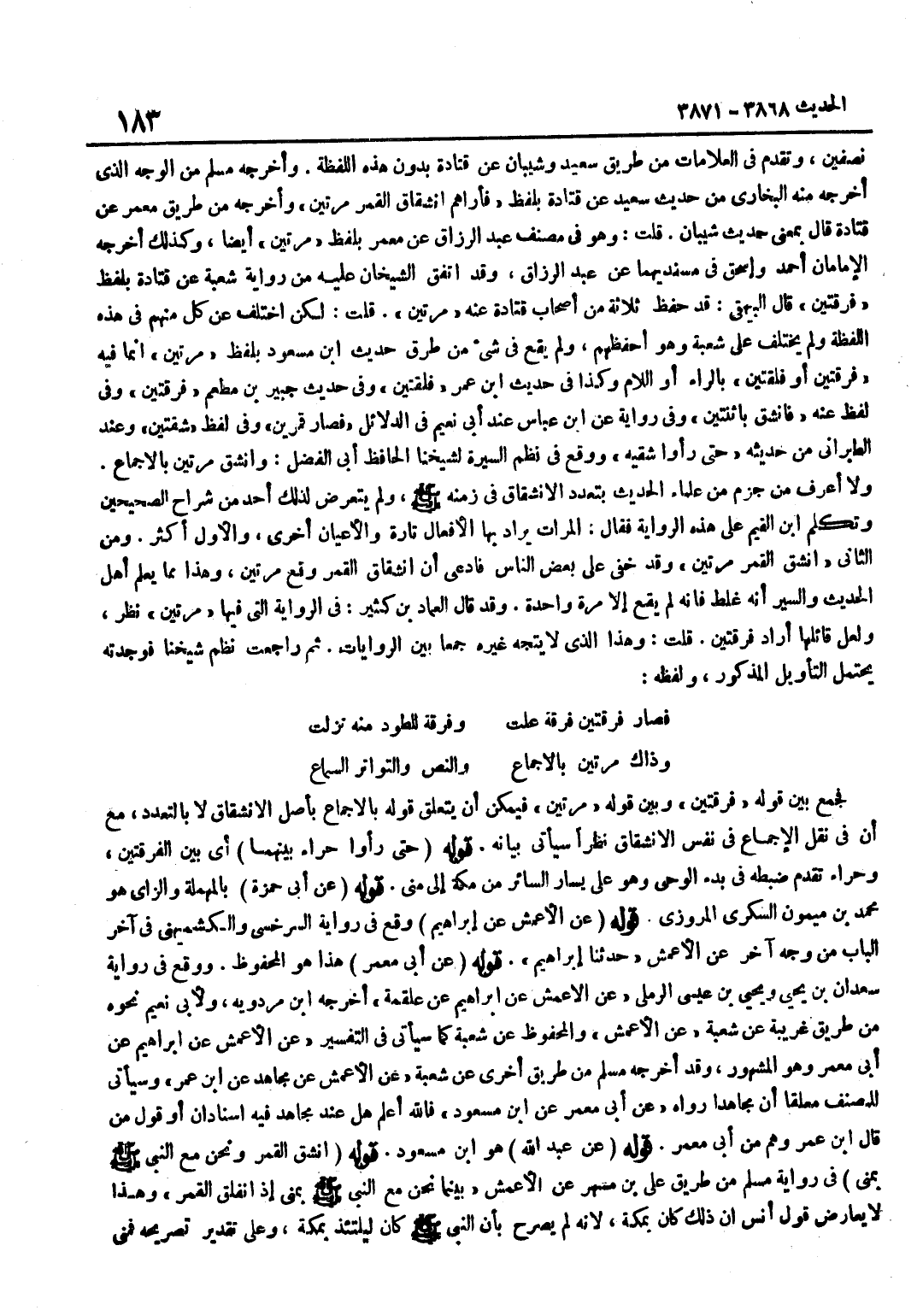 [3869] قَوْلُهُ عَنْ أَبِي حَمْزَةَ بِالْمُهْمَلَةِ وَالزَّايِ هُوَ مُحَمَّدُ بْنُ مَيْمُونٍ السُّكَّرِيُّ الْمَرْوَزِيُّ قَوْلُهُ عَنِ الْأَعْمَشِ عَنْ إِبْرَاهِيمَ وَقَعَ فِي رِوَايَةِ السَّرَخْسِيِّ وَالْكُشْمِيهَنِيِّ فِي آخِرِ الْبَابِ مِنْ وَجْهٍ آخَرَ عَنِ الْأَعْمَشِ حَدَّثَنَا إِبْرَاهِيمُ قَوْلُهُ عَنْ أَبِي مَعْمَرٍ هَذَا هُوَ الْمَحْفُوظُ وَوَقَعَ فِي رِوَايَةِ سَعْدَانَ بْنِ يَحْيَى وَيَحْيَى بْنِ عِيسَى الرَّمْلِيُّ عَنِ الْأَعْمَش عَن إِبْرَاهِيم عَن عَلْقَمَة أخرجه بن مَرْدَوَيْهِ وَلِأَبِي نُعَيْمٍ نَحْوَهُ مِنْ طَرِيقٍ غَرِيبَةٍ عَنْ شُعْبَةَ عَنِ الْأَعْمَشِ وَالْمَحْفُوظُ عَنْ شُعْبَةَ كَمَا سَيَأْتِي فِي التَّفْسِيرِ عَنِ الْأَعْمَشِ عَنْ إِبْرَاهِيم عَن أبي معمر وَهُوَ الْمَشْهُورُ وَقَدْ أَخْرَجَهُ مُسْلِمٌ مِنْ طَرِيقٍ أُخْرَى عَنْ شُعْبَةَ عَنِ الْأَعْمَشِ عَنْ مُجَاهِدٍ عَن بن عُمَرَ وَسَيَأْتِي لِلْمُصَنِّفِ مُعَلَّقًا أَنَّ مُجَاهِدًا رَوَاهُ عَن أبي معمر عَن بن مَسْعُودٍ فَاللَّهُ أَعْلَمُ هَلْ عِنْدَ مُجَاهِدٍ فِيهِ اسنادان أَو قَول من قَالَ بن عُمَرَ وَهَمٌ مِنْ أَبِي مَعْمَرٍ قَوْلُهُ عَنْ عبد الله هُوَ بن مَسْعُودٍ قَوْلُهُ انْشَقَّ الْقَمَرُ وَنَحْنُ مَعَ النَّبِيِّ صَلَّى اللَّهُ عَلَيْهِ وَسَلَّمَ بِمِنًى فِي رِوَايَةِ مُسْلِمٍ مِنْ طَرِيقِ عَلِيِّ بْنِ مُسْهِرٍ عَنِ الْأَعْمَشِ بَيْنَمَا نَحْنُ مَعَ النَّبِيِّ صَلَّى اللَّهُ عَلَيْهِ وَسَلَّمَ بِمِنًى إِذِ انْفَلَقَ الْقَمَرُ وَهَذَا لَا يُعَارِضُ قَوْلَ أَنَسٍ أَنَّ ذَلِكَ كَانَ بِمَكَّةَ لِأَنَّهُ لَمْ يُصَرِّحْ بِأَنَّ النَّبِيَّ صَلَّى اللَّهُ عَلَيْهِ وَسَلَّمَ كَانَ لَيْلَتَئِذٍ بِمَكَّةَ وَعَلَى تَقْدِير تصريحه فَهِيَ