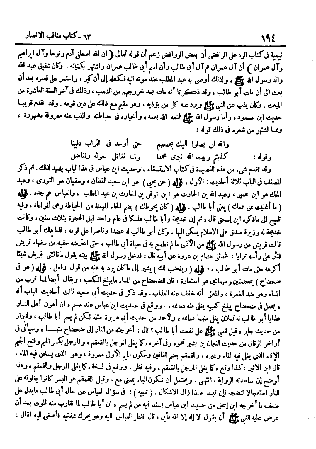 وَاسْمُهُ عِنْدَ الْجَمِيعِ عَبْدُ مَنَافٍ وَشَذَّ مَنْ قَالَ عِمْرَانَ بل هُوَ قَول بَاطِل نَقله بن تَيْمِيَّةَ فِي كِتَابِ الرَّدِّ عَلَى الرَّافِضِيِّ أَنَّ بَعْضَ الرَّوَافِضِ زَعَمَ أَنَّ قَوْلَهُ تَعَالَى إِنَّ اللَّهَ اصْطَفَى آدَمَ وَنُوحًا وَآلَ إِبْرَاهِيمَ وَآلَ عمرَان أَنَّ آلَ عِمْرَانَ هُمْ آلُ أَبِي طَالِبٍ وَأَنَّ اسْمَ أَبِي طَالِبٍ عِمْرَانُ وَاشْتُهِرَ بِكُنْيَتِهِ وَكَانَ شَقِيقَ عَبْدِ اللَّهِ وَالِدِ رَسُولِ اللَّهِ صَلَّى اللَّهُ عَلَيْهِ وَسَلَّمَ وَلِذَلِكَ أَوْصَى بِهِ عبد الْمطلب عِنْد مَوته إِلَيْهِ فَكَفَلَهُ إِلَى أَنْ كَبِرَ وَاسْتَمَرَّ عَلَى نَصْرِهِ بَعْدَ أَنْ بُعِثَ إِلَى أَنْ مَاتَ أَبُو طَالِبٍ وَقَدْ ذَكَرْنَا أَنَّهُ مَاتَ بَعْدَ خُرُوجِهِمْ مِنَ الشِّعْبِ وَذَلِكَ فِي آخِرِ السَّنَةِ الْعَاشِرَةِ مِنَ الْمَبْعَثِ وَكَانَ يَذُبُّ عَنِ النَّبِيِّ صَلَّى اللَّهُ عَلَيْهِ وَسَلَّمَ وَيَرُدُّ عَنْهُ كُلَّ مَنْ يُؤْذِيهِ وَهُوَ مُقِيمٌ مَعَ ذَلِكَ عَلَى دِينِ قومه وَقد تقدم قَرِيبا حَدِيث بن مَسْعُودٍ وَأَمَّا رَسُولُ اللَّهِ صَلَّى اللَّهُ عَلَيْهِ وَسَلَّمَ فَمَنَعَهُ اللَّهُ بِعَمِّهِ وَأَخْبَارُهُ فِي حِيَاطَتِهِ وَالذَّبِّ عَنْهُ مَعْرُوفَةٌ مَشْهُورَةٌ وَمِمَّا اشْتُهِرَ مِنْ شِعْرِهِ فِي ذَلِكَ قَوْلُهُ وَاللَّهِ لَنْ يَصِلُوا إِلَيْكَ بِجَمْعِهِمْ حَتَّى أُوَسَّدَ فِي التُّرَابِ دَفِينَا وَقَوْلُهُ كَذَبْتُمْ وَبَيْتِ اللَّهِ نَبْزِي مُحَمَّدًا وَلَمَّا نُقَاتِلْ حَوْلَهُ وَنُنَاضِلِ وَقَدْ تَقَدَّمَ شَيْءٌ مِنْ هَذِه القصيدة فِي كتاب الاسْتِسْقَاء وَحَدِيث بن عَبَّاسٍ فِي هَذَا الْبَابِ يَشْهَدُ لِذَلِكَ ثُمَّ ذَكَرَ الْمُصَنِّفُ فِي الْبَابِ ثَلَاثَةَ أَحَادِيثَ الْأَوَّلُ