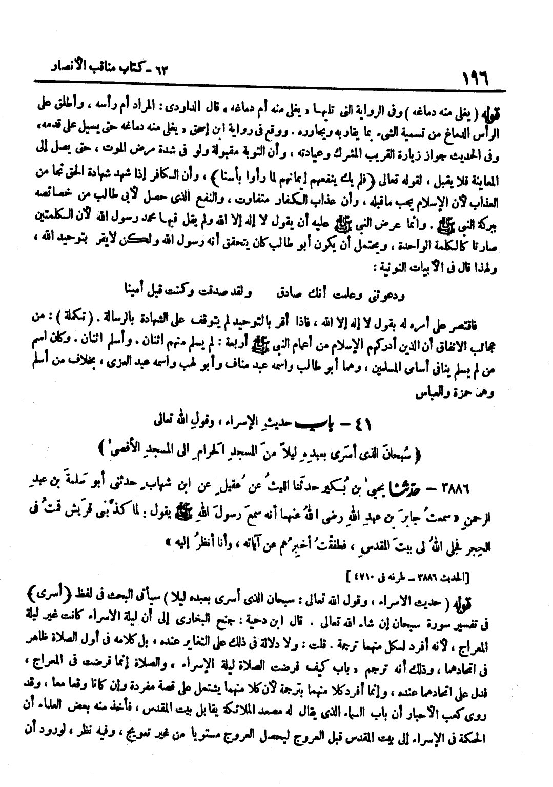 سَيَأْتِي الْبَحْثُ فِي لَفْظِ أَسْرَى فِي تَفْسِيرِ سُورَةِ سُبْحَانَ إِنْ شَاءَ اللَّهُ تَعَالَى قَالَ بن دِحْيَةَ جَنَحَ الْبُخَارِيُّ إِلَى أَنَّ لَيْلَةَ الْإِسْرَاءِ كَانَتْ غَيْرَ لَيْلَةِ الْمِعْرَاجِ لِأَنَّهُ أَفْرَدَ لِكُلٍّ مِنْهُمَا تَرْجَمَةً قُلْتُ وَلَا دَلَالَةَ فِي ذَلِكَ عَلَى التَّغَايُرِ عِنْدَهُ بَلْ كَلَامُهُ فِي أَوَّلِ الصَّلَاةِ ظَاهِرٌ فِي اتِّحَادِهِمَا وَذَلِكَ أَنَّهُ تَرْجَمَ بَابَ كَيْفَ فُرِضَتِ الصَّلَاةُ لَيْلَةَ الْإِسْرَاءِ وَالصَّلَاةُ إِنَّمَا فُرِضَتْ فِي الْمِعْرَاجِ فَدَلَّ عَلَى اتِّحَادِهِمَا عِنْدَهُ وَإِنَّمَا أَفْرَدَ كُلًّا مِنْهُمَا بِتَرْجَمَةٍ لِأَنَّ كُلًّا مِنْهُمَا يَشْتَمِلُ عَلَى قِصَّةٍ مُفْرَدَةٍ وَإِنْ كَانَا وَقَعَا مَعًا وَقَدْ رَوَى كَعْبُ الْأَحْبَارِ أَنَّ بَابَ السَّمَاءِ الَّذِي يُقَالُ لَهُ مِصْعَدُ الْمَلَائِكَةِ يُقَابِلُ بَيْتَ الْمَقْدِسِ فَأَخَذَ مِنْهُ بَعْضُ الْعُلَمَاءِ أَنَّ الْحِكْمَةَ فِي الْإِسْرَاءِ إِلَى بَيْتِ الْمَقْدِسِ قَبْلَ الْعُرُوجِ لِيَحْصُلَ الْعُرُوجُ مُسْتَوِيًا مِنْ غَيْرِ تَعْوِيجٍ وَفِيهِ نَظَرٌ لِوُرُودِ أَنَّ