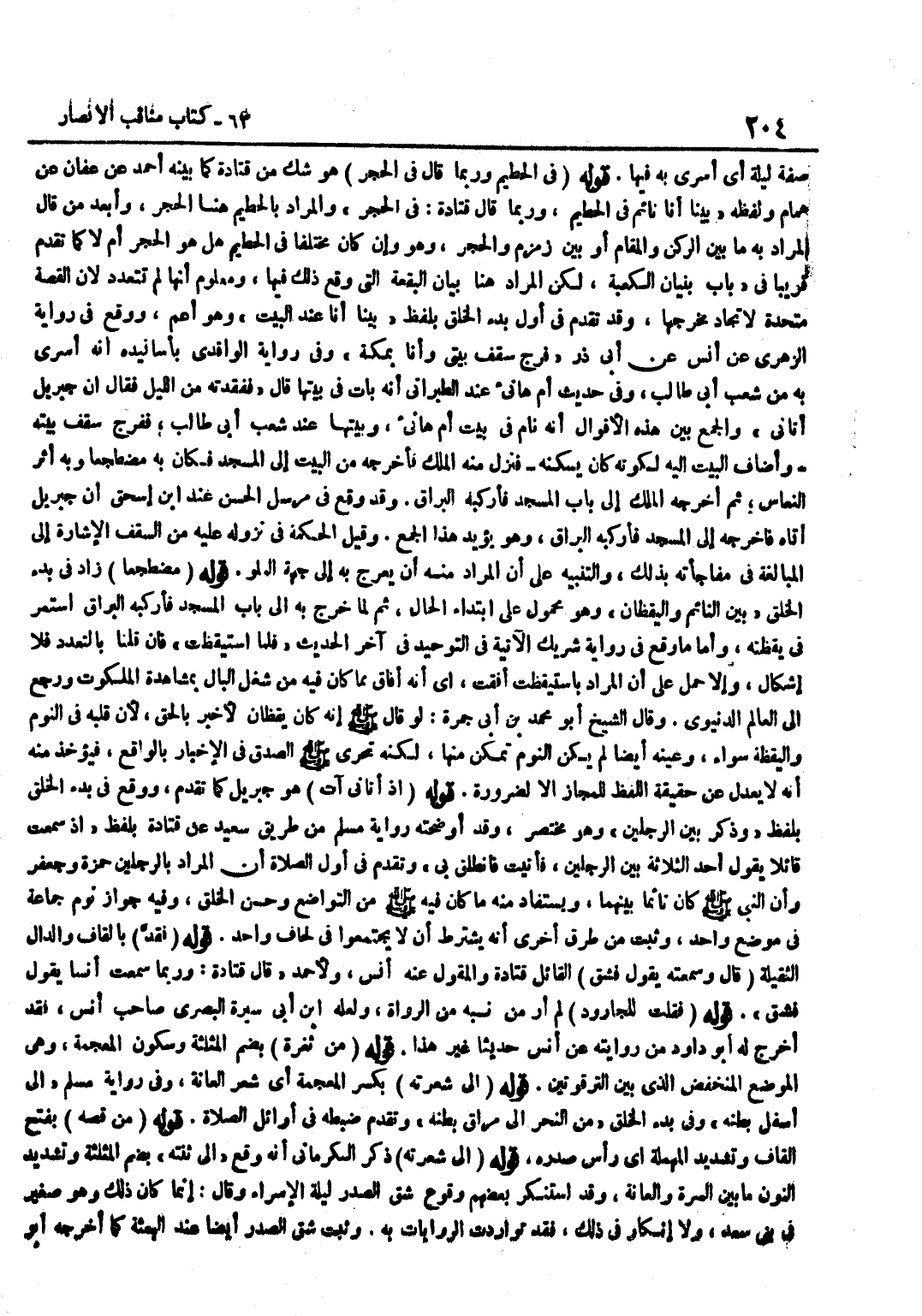 صِفَةُ لَيْلَةٍ أَيْ أُسْرِيَ بِهِ فِيهَا قَوْلُهُ فِي الْحَطِيمِ وَرُبَّمَا قَالَ فِي الْحِجْرِ هُوَ شَكٌّ مِنْ قَتَادَةَ كَمَا بَيَّنَهُ أَحْمَدُ عَنْ عَفَّانَ عَنْ هَمَّامٍ وَلَفْظُهُ بَيْنَا أَنَا نَائِمٌ فِي الْحَطِيمِ وَرُبَّمَا قَالَ قَتَادَةُ فِي الْحِجْرِ وَالْمُرَادُ بِالْحَطِيمِ هُنَا الْحِجْرُ وَأَبْعَدَ مَنْ قَالَ الْمُرَادُ بِهِ مَا بَيْنَ الرُّكْنِ وَالْمَقَامِ أَوْ بَيْنَ زَمْزَمَ وَالْحِجْرِ وَهُوَ وَإِنْ كَانَ مُخْتَلَفًا فِي الْحَطِيمِ هَلْ هُوَ الْحِجْرُ أَمْ لَا كَمَا تَقَدَّمَ قَرِيبًا فِي بَابِ بُنْيَانِ الْكَعْبَةِ لَكِنِ الْمُرَادُ هُنَا بَيَانُ الْبُقْعَةِ الَّتِي وَقَعَ ذَلِكَ فِيهَا وَمَعْلُومٌ أَنَّهَا لَمْ تَتَعَدَّدْ لِأَنَّ الْقِصَّةَ مُتَّحِدَةٌ لِاتِّحَادِ مَخْرَجِهَا وَقَدْ تَقَدَّمَ فِي أَوَّلِ بَدْءِ الْخَلْقِ بِلَفْظِ بَيْنَا أَنَا عِنْدَ الْبَيْتِ وَهُوَ أَعَمُّ وَوَقَعَ فِي رِوَايَةِ الزُّهْرِيِّ عَنْ أَنَسٍ عَنْ أَبِي ذَرٍّ فُرِّجَ سَقْفُ بَيْتِي وَأَنَا بِمَكَّةَ وَفِي رِوَايَةِ الْوَاقِدِيِّ بِأَسَانِيدِهِ أَنَّهُ أُسْرِيَ بِهِ مِنْ شِعْبِ أَبِي طَالِبٍ وَفِي حَدِيثِ أُمِّ هَانِئٍ عِنْدَ الطَّبَرَانِيِّ أَنَّهُ بَاتَ فِي بَيْتِهَا قَالَ فَفَقَدْتُهُ مِنَ اللَّيْلِ فَقَالَ إِنَّ جِبْرِيلَ أَتَانِي وَالْجَمْعُ بَيْنَ هَذِهِ الْأَقْوَالِ أَنَّهُ نَامَ فِي بَيْتِ أُمِّ هَانِئٍ وَبَيْتُهَا عِنْدَ شِعْبِ أَبِي طَالِبٍ فَفُرِّجَ سَقْفُ بَيْتِهِ وَأَضَافَ الْبَيْتَ إِلَيْهِ لِكَوْنِهِ كَانَ يَسْكُنُهُ فَنَزَلَ مِنْهُ الْمَلَكُ فَأَخْرَجَهُ مِنَ الْبَيْتِ إِلَى الْمَسْجِدِ فَكَانَ بِهِ مُضْطَجِعًا وَبِهِ أَثَرُ النُّعَاسِ ثُمَّ أَخْرَجَهُ الْمَلَكُ إِلَى بَابِ الْمَسْجِدِ فَأَرْكَبَهُ الْبُرَاقُ وَقَدْ وَقَعَ فِي مُرْسَلِ الْحَسَنِ عِنْدَ بن إِسْحَاقَ أَنَّ جِبْرِيلَ أَتَاهُ فَأَخْرَجَهُ إِلَى الْمَسْجِدِ فَأَرْكَبَهُ الْبُرَاقُ وَهُوَ يُؤَيِّدُ هَذَا الْجَمْعَ وَقِيلَ الْحِكْمَةُ فِي نُزُولِهِ عَلَيْهِ مِنَ السَّقْفِ الْإِشَارَةُ إِلَى الْمُبَالَغَةِ فِي مُفَاجَأَتِهِ بِذَلِكَ وَالتَّنْبِيهُ عَلَى أَنَّ الْمُرَادَ مِنْهُ أَنْ يَعْرُجَ بِهِ إِلَى جِهَةِ الْعُلُوِّ قَوْلُهُ مُضْطَجِعًا زَادَ فِي بَدْءِ الْخَلْقِ بَيْنَ النَّائِمِ وَالْيَقْظَانِ وَهُوَ مَحْمُولٌ عَلَى ابْتِدَاء الْحَال ثمَّ لما خرج بِهِ إِلَى بَابِ الْمَسْجِدِ فَأَرْكَبَهُ الْبُرَاقُ اسْتَمَرَّ فِي يَقَظَتِهِ وَأَمَّا مَا وَقَعَ فِي رِوَايَةِ شَرِيكٍ الْآتِيَةِ فِي التَّوْحِيدِ فِي آخِرِ الْحَدِيثِ فَلَمَّا اسْتَيْقَظْتُ فَإِنْ قُلْنَا بِالتَّعَدُّدِ فَلَا إِشْكَالَ والا حمل على ان المُرَاد باستيقظت أَفَقْتُ أَيْ أَنَّهُ أَفَاقَ مِمَّا كَانَ فِيهِ مِنْ شَغْلِ الْبَالِ بِمُشَاهَدَةِ الْمَلَكُوتِ وَرَجَعَ إِلَى الْعَالَمِ الدُّنْيَوِيِّ وَقَالَ الشَّيْخُ أَبُو مُحَمَّدِ بْنِ أَبِي جَمْرَةَ لَوْ قَالَ صَلَّى اللَّهُ عَلَيْهِ وَسلم انه كَانَ يقظان لَأَخْبَرَ بِالْحَقِّ لِأَنَّ قَلْبَهُ فِي النَّوْمِ وَالْيَقَظَةِ سَوَاءٌ وَعَيْنُهُ أَيْضًا لَمْ يَكُنِ النَّوْمُ تَمَكَّنَ مِنْهَا لَكِنَّهُ تَحَرَّى صَلَّى اللَّهُ عَلَيْهِ وَسَلَّمَ الصِّدْقَ فِي الْإِخْبَارِ بِالْوَاقِعِ فَيُؤْخَذُ مِنْهُ أَنَّهُ لَا يُعْدَلُ عَنْ حَقِيقَةِ اللَّفْظِ لِلْمَجَازِ إِلَّا لِضَرُورَةٍ قَوْلُهُ إِذْ أَتَانِي آتٍ هُوَ جِبْرِيلُ كَمَا تَقَدَّمَ وَوَقَعَ فِي بَدْءِ الْخَلْقِ بِلَفْظِ وَذَكَرَ بَيْنَ الرَّجُلَيْنِ وَهُوَ مُخْتَصَرٌ وَقَدْ أَوْضَحَتْهُ رِوَايَةُ مُسْلِمٍ مِنْ طَرِيقِ سَعِيدٍ عَنْ قَتَادَةَ بِلَفْظِ إِذْ سَمِعْتُ قَائِلًا يَقُولُ أَحَدُ الثَّلَاثَةِ بَي