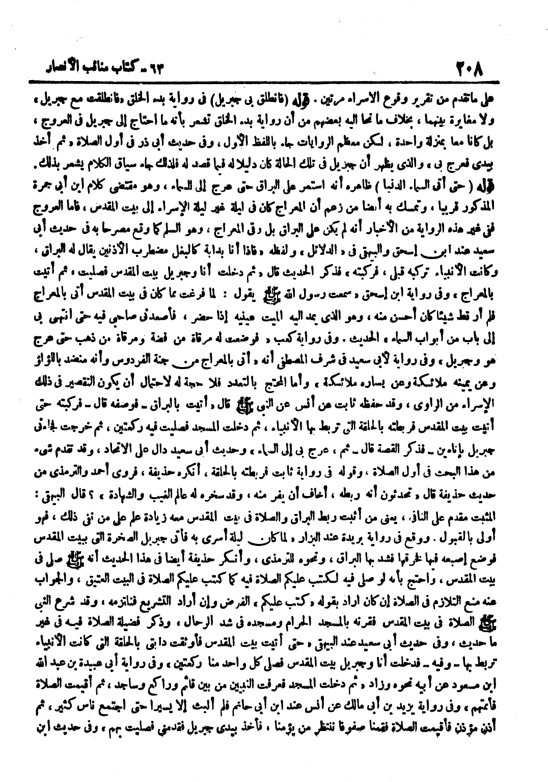 عَلَى مَا تَقَدَّمَ مِنْ تَقْرِيرِ وُقُوعِ الْإِسْرَاءِ مَرَّتَيْنِ قَوْلُهُ فَانْطَلَقَ بِي جِبْرِيلُ فِي رِوَايَةِ بَدْءِ الْخَلْقِ فَانْطَلَقْتُ مَعَ جِبْرِيلَ وَلَا مُغَايَرَةَ بَيْنَهُمَا بِخِلَافِ مَا نَحَا إِلَيْهِ بَعْضُهُمْ مِنْ أَنَّ رِوَايَةَ بَدْءِ الْخَلْقِ تُشْعِرُ بِأَنَّهُ مَا احْتَاجَ إِلَى جِبْرِيلَ فِي الْعُرُوجِ بَلْ كَانَا مَعًا بِمَنْزِلَةٍ وَاحِدَةٍ لَكِنْ مُعْظَمُ الرِّوَايَاتِ جَاءَ بِاللَّفْظِ الْأَوَّلِ وَفِي حَدِيثِ أَبِي ذَرٍّ فِي أَوَّلِ الصَّلَاةِ ثُمَّ أَخَذَ بِيَدِي فَعَرَجَ بِي وَالَّذِي يَظْهَرُ أَنَّ جِبْرِيلَ فِي تِلْكَ الْحَالَةِ كَانَ دَلِيلًا لَهُ فِيمَا قَصَدَ لَهُ فَلِذَلِكَ جَاءَ سِيَاقُ الْكَلَامِ يُشْعِرُ بِذَلِكَ قَوْلُهُ حَتَّى أَتَى السَّمَاءَ الدُّنْيَا ظَاهِرُهُ أَنَّهُ اسْتَمَرَّ عَلَى الْبُرَاقِ حَتَّى عَرَجَ إِلَى السَّمَاءِ وَهُوَ مُقْتَضَى كَلَام بن أَبِي جَمْرَةَ الْمَذْكُورِ قَرِيبًا وَتَمَسَّكَ بِهِ أَيْضًا مَنْ زَعَمَ أَنَّ الْمِعْرَاجَ كَانَ فِي لَيْلَةٍ غَيْرِ لَيْلَةِ الْإِسْرَاءِ إِلَى بَيْتِ الْمَقْدِسِ فَأَمَّا الْعُرُوجُ فَفِي غَيْرِ هَذِهِ الرِّوَايَةِ مِنَ الْأَخْبَارِ أَنَّهُ لَمْ يَكُنْ عَلَى الْبُرَاقِ بَلْ رَقِيَ الْمِعْرَاجَ وَهُوَ السُّلَّمَ كَمَا وَقَعَ مُصَرَّحًا بِهِ فِي حَدِيث أبي سعيد عِنْد بن إِسْحَاقَ وَالْبَيْهَقِيِّ فِي الدَّلَائِلِ وَلَفْظُهُ فَإِذَا أَنَا بِدَابَّةٍ كَالْبَغْلِ مُضْطَرِبَ الْأُذُنَيْنِ يُقَالُ لَهُ الْبُرَاقُ وَكَانَتِ الْأَنْبِيَاءُ تَرْكَبُهُ قَبْلِي فَرَكِبْتُهُ فَذَكَرَ الْحَدِيثَ قَالَ ثُمَّ دَخَلْتُ أَنَا وَجِبْرِيلُ بَيْتَ الْمَقْدِسِ فَصليت ثمَّ أتيت بالمعراج وَفِي رِوَايَة بن إِسْحَاقَ سَمِعْتُ رَسُولَ اللَّهِ صَلَّى اللَّهُ عَلَيْهِ وَسَلَّمَ يَقُولُ لَمَّا فَرَغْتُ مِمَّا كَانَ فِي بَيْتِ الْمَقْدِسِ أُتِيَ بِالْمِعْرَاجِ فَلَمْ أَرَ قَطُّ شَيْئًا كَانَ أَحْسَنَ مِنْهُ وَهُوَ الَّذِي يَمُدُّ إِلَيْهِ الْمَيِّتُ عَيْنَيْهِ إِذَا حُضِرَ فَأَصْعَدَنِي صَاحِبِي فِيهِ حَتَّى انْتَهَى بِي إِلَى بَابٍ مِنْ أَبْوَابِ السَّمَاءِ الْحَدِيثَ وَفِي رِوَايَةِ كَعْبٍ فَوُضِعَتْ لَهُ مَرْقَاةٌ مِنْ فِضَّةٍ وَمَرْقَاةٌ مِنْ ذَهَبٍ حَتَّى عَرَجَ هُوَ وَجِبْرِيلُ وَفِي رِوَايَةٍ لِأَبِي سَعِيدٍ فِي شَرَفِ الْمُصْطَفَى أَنَّهُ أُتِيَ بِالْمِعْرَاجِ مِنْ جَنَّةِ الْفِرْدَوْسِ وَأَنَّهُ مُنَضَّدٌ بِاللُّؤْلُؤِ وَعَنْ يَمِينِهِ مَلَائِكَةٌ وَعَنْ يَسَارِهِ مَلَائِكَةٌ وَأَمَّا الْمُحْتَجُّ بِالتَّعَدُّدِ فَلَا حُجَّةَ لَهُ لِاحْتِمَالِ أَنْ يَكُونَ التَّقْصِيرُ فِي ذَلِكَ الْإِسْرَاءِ مِنَ الرَّاوِي وَقَدْ حَفِظَهُ ثَابِتٌ عَنْ أَنَسٌ عَنْ النَّبِيِّ صَلَّى اللَّهُ عَلَيْهِ وَسَلَّمَ قَالَ أُتِيتُ بِالْبُرَاقِ فَوَصَفَهُ قَالَ فَرَكِبْتُهُ حَتَّى أَتَيْتُ بَيْتَ الْمَقْدِسِ فَرَبَطْتُهُ بِالْحَلْقَةِ الَّتِي تَرْبِطُ بِهَا الْأَنْبِيَاءُ ثُمَّ دَخَلْتُ الْمَسْجِدَ فَصَلَّيْتُ فِيهِ رَكْعَتَيْنِ ثُمَّ خَرَجْتُ فَجَاءَنِي جِبْرِيلُ بِإِنَاءَيْنِ فَذَكَرَ الْقِصَّةَ قَالَ ثُمَّ عُرِجَ بِي إِلَى السَّمَاءِ وَحَدِيثُ أَبِي سَعِيدٍ دَالٌّ عَلَى الِاتِّحَادِ وَقَدْ تَقَدَّمَ شَيْءٌ مِنْ هَذَا الْبَحْثِ فِي أَوَّلِ الصَّلَاةِ وَقَوْلُهُ فِي رِوَايَةِ ثَابِتٍ فَرَبَطْتُهُ بِالْحَلْقَةِ أَنْكَرَهُ حُذَيْفَةُ فَرَوَى أَحْمَدُ وَالتِّرْمِذِيُّ مِنْ حَدِيثِ حُذَيْفَةَ قَالَ تُحَدِّثُونَ أَنَّهُ رَبَطَهُ أَخَافَ أَنْ يَفِرَّ مِنْهُ وَقَدْ سَخَّرَهُ لَهُ عَالِمُ الْغَيْبِ وَالشَّهَادَةِ قَالَ الْبَيْهَقِيُّ الْمُثْبِتُ مُقَدَّمٌ عَلَى النَّافِي يَعْنِي مَن