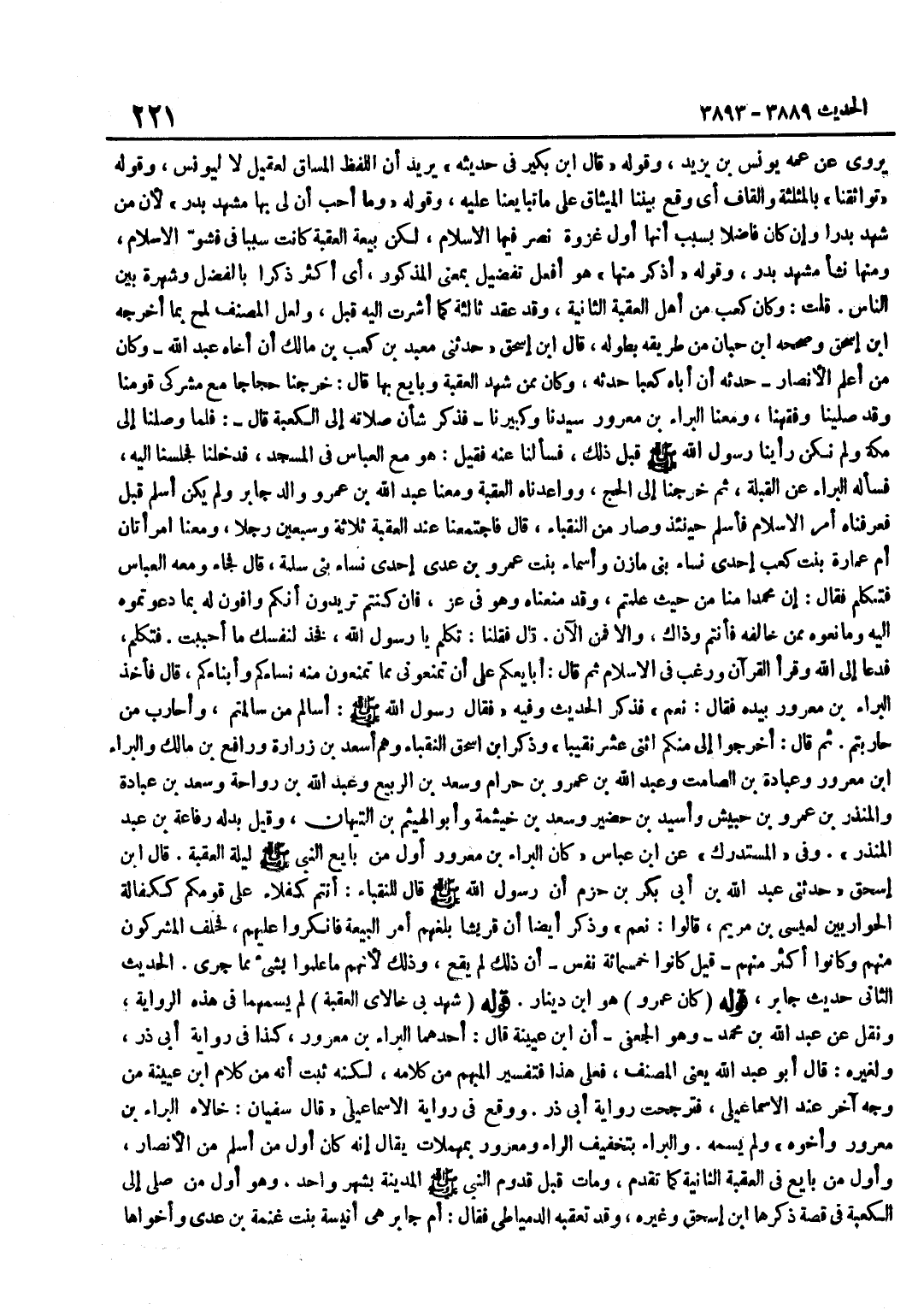 [3889] قَالَ بن بُكَيْرٍ فِي حَدِيثِهِ يُرِيدُ أَنَّ اللَّفْظَ الْمُسَاقَ لِعَقِيلٍ لَا لِيُونُسَ وَقَوْلُهُ تَوَاثَقْنَا بِالْمُثَلَّثَةِ وَالْقَافِ أَيْ وَقَعَ بَيْنَنَا الْمِيثَاقُ عَلَى مَا تَبَايَعْنَا عَلَيْهِ وَقَوْلُهُ وَمَا أُحِبُّ أَنَّ لِي بِهَا مَشْهَدَ بَدْرٍ لِأَنَّ مَنْ شَهِدَ بَدْرًا وَإِنْ كَانَ فَاضِلًا بِسَبَبِ أَنَّهَا أَوَّلُ غَزْوَةٍ نُصِرَ فِيهَا الْإِسْلَامُ لَكِنَّ بَيْعَةَ الْعَقَبَةِ كَانَتْ سَبَبًا فِي فُشُوِّ الْإِسْلَامِ وَمِنْهَا نَشَأَ مَشْهَدُ بَدْرٍ وَقَوْلُهُ أَذْكَرُ مِنْهَا هُوَ أَفْعَلُ تَفْضِيلٍ بِمَعْنَى الْمَذْكُورِ أَيْ أَكْثَرُ ذِكْرًا بِالْفَضْلِ وَشُهْرَةً بَيْنَ النَّاسِ قُلْتُ وَكَانَ كَعْبٌ مِنْ أَهْلِ الْعَقَبَةِ الثَّانِيَةِ وَقَدْ عَقَدَ ثَالِثَةً كَمَا أَشَرْتُ إِلَيْهِ قبل وَلَعَلَّ المُصَنّف لمح بِمَا أخرجه بن إِسْحَاق وَصَححهُ بن حبَان من طَرِيقه بِطُولِهِ قَالَ بن إِسْحَاقَ حَدَّثَنِي مَعْبَدُ بْنُ كَعْبِ بْنِ مَالِكٍ أَنَّ أَخَاهُ عَبْدَ اللَّهِ وَكَانَ مِنْ أَعْلَمِ الْأَنْصَارِ حَدَّثَهُ أَنَّ أَبَاهُ كَعْبًا حَدَّثَهُ وَكَانَ مِمَّنْ شَهِدَ الْعَقَبَةَ وَبَايَعَ بِهَا قَالَ خَرَجْنَا حُجَّاجًا مَعَ مُشْرِكِي قَوْمِنَا وَقَدْ صَلَّيْنَا وَفَقِهْنَا وَمَعَنَا الْبَرَاءُ بْنُ مَعْرُورٍ سَيِّدُنَا وَكَبِيرُنَا فَذَكَرَ شَأْنَ صَلَاتِهِ إِلَى الْكَعْبَةِ قَالَ فَلَمَّا وَصَلْنَا إِلَى مَكَّةَ وَلَمْ نَكُنْ رَأَيْنَا رَسُولَ اللَّهِ صَلَّى اللَّهُ عَلَيْهِ وَسَلَّمَ قِبَلَ ذَلِك فسألنا عَنْهُ فَقِيلَ هُوَ مَعَ الْعَبَّاسِ فِي الْمَسْجِدِ فَدَخَلْنَا فَجَلَسْنَا إِلَيْهِ فَسَأَلَهُ الْبَرَاءُ عَنِ الْقِبْلَةِ ثُمَّ خَرَجْنَا إِلَى الْحَجِّ وَوَاعَدْنَاهُ الْعَقَبَةَ وَمَعَنَا عَبْدُ اللَّهِ بْنُ عَمْرٍو وَالِدُ جَابِرٍ وَلَمْ يَكُنْ أَسْلَمَ قَبْلُ فَعَرَّفْنَاهُ أَمْرَ الْإِسْلَامِ فَأَسْلَمَ حِينَئِذٍ وَصَارَ مِنَ النُّقَبَاءِ قَالَ فَاجْتَمَعْنَا عِنْدَ الْعَقَبَةِ ثَلَاثَةً وَسَبْعِينَ رَجُلًا وَمَعَنَا امْرَأَتَانِ أُمُّ عُمَارَةَ بِنْتُ كَعْبٍ إِحْدَى نِسَاءِ بَنِي مَازِنٍ وَأَسْمَاءُ بِنْتُ عَمْرِو بْنِ عَدِيٍّ إِحْدَى نِسَاءِ بَنِي سَلَمَةَ قَالَ فَجَاءَ وَمَعَهُ الْعَبَّاسُ فَتَكَلَّمَ فَقَالَ إِنَّ مُحَمَّدًا مِنَّا مِنْ حَيْثُ عَلِمْتُمْ وَقَدْ مَنَعْنَاهُ وَهُوَ فِي عِزٍّ فَإِنْ كُنْتُمْ تُرِيدُونَ أَنَّكُمْ وَافُونَ لَهُ بِمَا دَعَوْتُمُوهُ إِلَيْهِ وَمَانِعُوهُ مِمَّنْ خَالَفَهُ فَأَنْتُمْ وَذَاكَ وَإِلَّا فَمِنَ الْآنِ قَالَ فَقُلْنَا تَكَلَّمْ يَا رَسُولَ اللَّهِ فَخُذْ لِنَفْسِكَ مَا أَحْبَبْتَ فَتَكَلَّمَ فَدَعَا إِلَى اللَّهِ وَقَرَأَ الْقُرْآنَ وَرَغَّبَ فِي الْإِسْلَامِ ثُمَّ قَالَ أُبَايِعُكُمْ عَلَى أَنْ تَمْنَعُونِي مِمَّا تَمْنَعُونَ مِنْهُ نِسَاءَكُمْ وَأَبْنَاءَكُمْ قَالَ فَأَخَذَ الْبَرَاءُ بْنُ مَعْرُورٍ بِيَدِهِ فَقَالَ نَعَمْ فَذَكَرَ الْحَدِيثَ وَفِيهِ فَقَالَ رَسُولُ اللَّهِ صَلَّى اللَّهُ عَلَيْهِ وَسَلَّمَ أُسَالِمُ مَنْ سَالَمْتُمْ وَأُحَارِبُ مَنْ حَارَبْتُمْ ثُمَّ قَالَ أَخْرِجُوا إِلَيَّ مِنْكُمُ اثْنَيْ عَشَرَ نَقِيبًا وَذكر بن إِسْحَاقَ النُّقَبَاءَ وَهُمْ أَسْعَدُ بْنُ زُرَارَةَ وَرَافِعُ بْنُ مَالِكٍ وَالْبَرَاءُ بْنُ مَعْرُورٍ وَعُبَادَةُ بْنُ الصَّامِتِ وَعَبْدُ اللَّهِ بْنُ عَمْرِو بْنِ حَرَامٍ وَسَعْدُ بْنُ الرَّبِيعِ وَعَبْدُ اللَّهِ بْنُ رَوَاحَةَ وَسَعْدُ بْنُ عُبَادَةَ وَالْمُنْذِرُ بْنُ عَمْرِو بْنِ حُبَيْشٍ وَأُسَيْدُ بْنُ حُضَيْرٍ وَسَعْدُ بْنُ خَيْثَمَةَ وَأَبُو الْهَيْثَمِ بْنُ التَّيِّهَانِ وَقِيلَ بَدَلَهُ رِفَاعَةُ بن عبد الْ