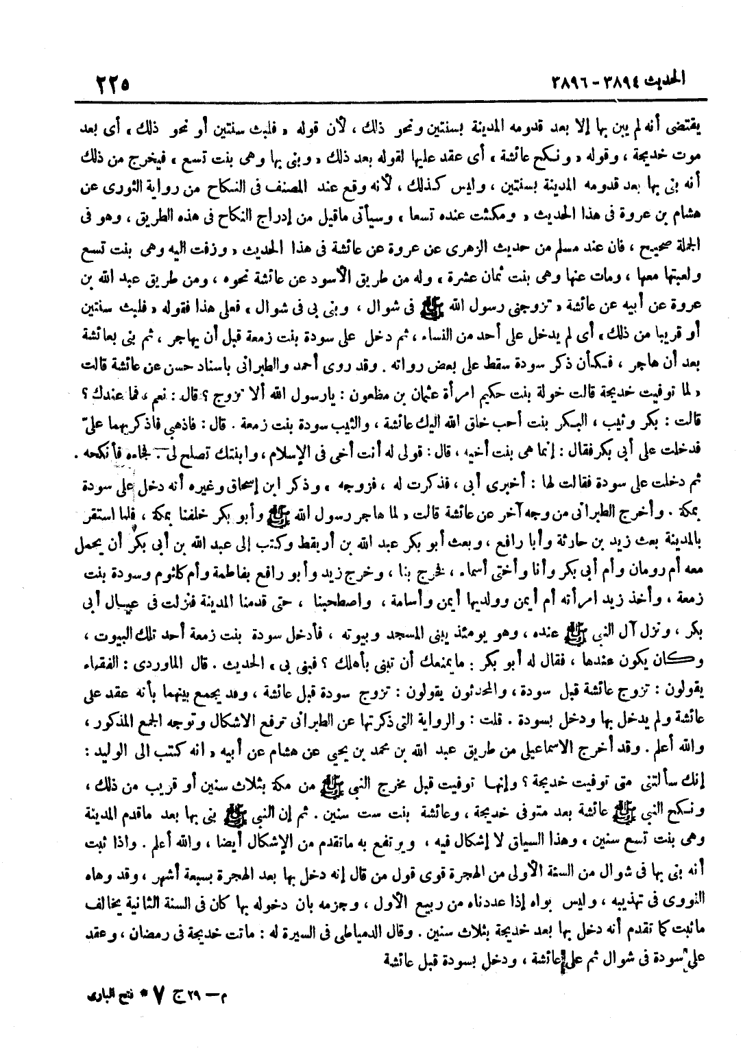وَقَدْ أَخْرَجَ الْإِسْمَاعِيلِيُّ مِنْ طَرِيقِ عَبْدِ اللَّهِ بْنِ مُحَمَّدِ بْنِ يَحْيَى عَنْ هِشَامٍ عَنْ أَبِيهِ أَنَّهُ كَتَبَ إِلَى الْوَلِيدِ إِنَّكَ سَأَلْتَنِي مَتَى تُوُفِّيَتْ خَدِيجَةُ وَإِنَّهَا تُوُفِّيَتْ قَبْلَ مَخْرَجِ النَّبِيِّ صَلَّى اللَّهُ عَلَيْهِ وَسَلَّمَ مِنْ مَكَّةَ بِثَلَاثِ سِنِينَ أَوْ قَرِيبٍ من ذَلِك ونكح النَّبِيُّ صَلَّى اللَّهُ عَلَيْهِ وَسَلَّمَ عَائِشَةَ بَعْدَ مُتَوَفَّى خَدِيجَةَ وَعَائِشَةُ بِنْتُ سِتِّ سِنِينَ ثُمَّ إِنَّ النَّبِيَّ صَلَّى اللَّهُ عَلَيْهِ وَسَلَّمَ بَنَى بهَا بعد مَا قَدِمَ الْمَدِينَةَ وَهِيَ بِنْتُ تِسْعِ سِنِينَ وَهَذَا السِّيَاقُ لَا إِشْكَالَ فِيهِ وَيَرْتَفِعُ بِهِ مَا تقدم من الْإِشْكَال أَيْضا وَالله أعلم وَإِذا ثَبَتَ أَنَّهُ بَنَى بِهَا فِي شَوَّالٍ مِنَ السَّنَةِ الْأُولَى مِنَ الْهِجْرَةِ قَوَّى قَوْلَ مَنْ قَالَ إِنَّهُ دَخَلَ بِهَا بَعْدَ الْهِجْرَةِ بِسَبْعَةِ أَشْهُرٍ وَقَدْ وَهَّاهُ النَّوَوِيُّ فِي تَهْذِيبِهِ وَلَيْسَ بِوَاهٍ إِذَا عَدَدْنَاهُ مِنْ رَبِيعٍ الْأَوَّلِ وَجَزْمُهُ بِأَنَّ دُخُولَهُ بِهَا كَانَ فِي السَّنَةِ الثَّانِيَةِ يُخَالِفُ مَا ثَبَتَ كَمَا تَقَدَّمَ أَنَّهُ دَخَلَ بِهَا بَعْدَ خَدِيجَةَ بِثَلَاثِ سِنِينَ وَقَالَ الدِّمْيَاطِيُّ فِي السِّيرَةِ لَهُ مَاتَتْ خَدِيجَةُ فِي رَمَضَانَ وَعَقَدَ عَلَى سَوْدَةَ فِي شَوَّالٍ ثُمَّ عَلَى عَائِشَة وَدخل بسودة قبل عَائِشَة