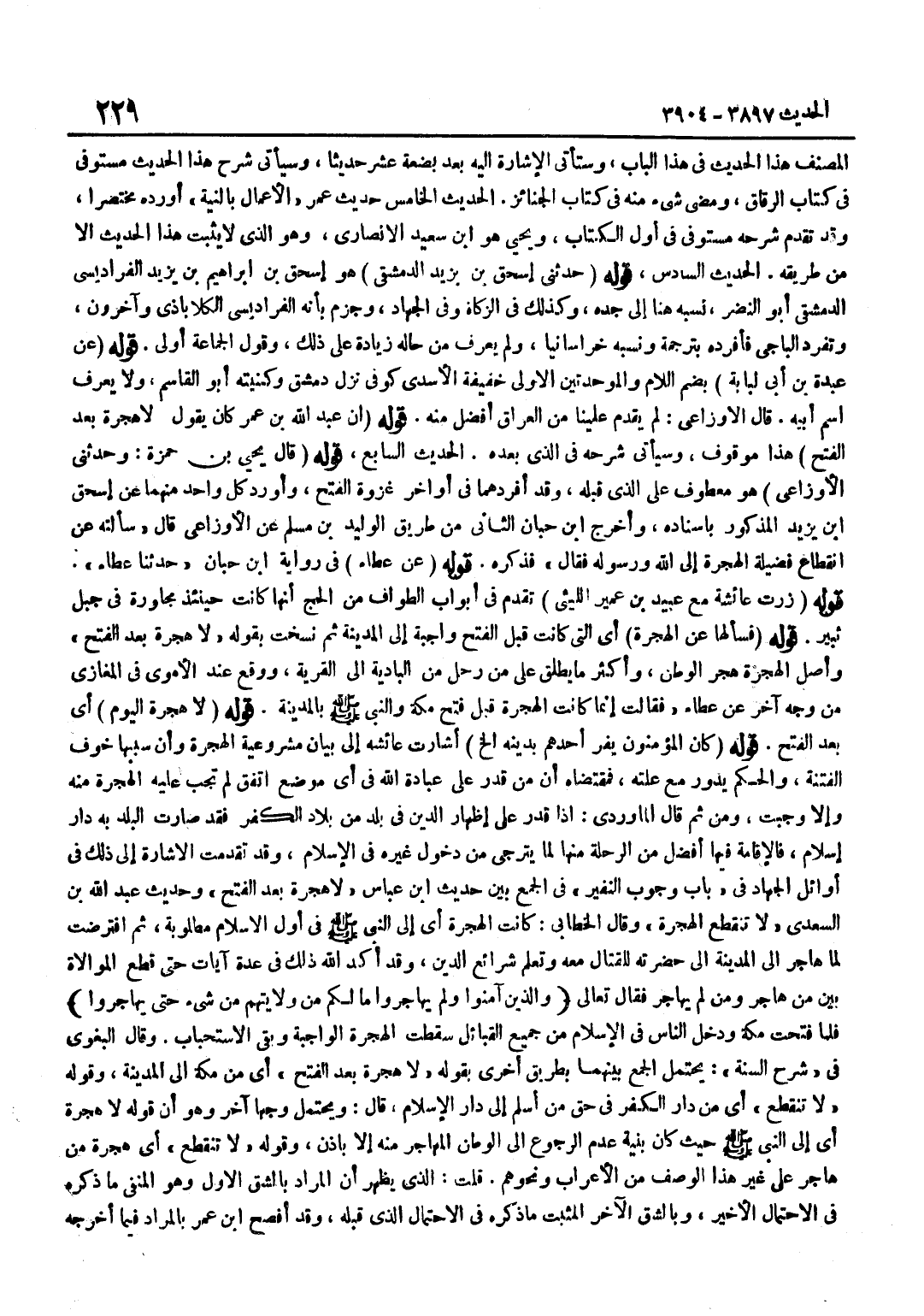 [3900] قَوْلُهُ قَالَ يَحْيَى بْنُ حَمْزَةَ وَحَدَّثَنِي الْأَوْزَاعِيُّ هُوَ مَعْطُوفٌ عَلَى الَّذِي قَبْلَهُ وَقَدْ أَفْرَدَهُمَا فِي أَوَاخِرِ غَزْوَةِ الْفَتْحِ وَأَوْرَدَ كُلَّ وَاحِدٍ مِنْهُمَا عَنْ إِسْحَاقَ بْنِ يَزِيدَ الْمَذْكُورِ بِإِسْنَادِهِ وَأَخْرَجَ بن حِبَّانَ الثَّانِيَ مِنْ طَرِيقِ الْوَلِيدِ بْنِ مُسْلِمٍ عَنِ الْأَوْزَاعِيِّ قَالَ سَأَلْتُهُ عَنِ انْقِطَاعِ فَضِيلَةِ الْهِجْرَةِ إِلَى اللَّهِ وَرَسُولِهِ فَقَالَ فَذَكَرَهُ قَوْلُهُ عَن عَطاء فِي رِوَايَة بن حِبَّانَ حَدَّثَنَا عَطَاءٌ قَوْلُهُ زُرْتُ عَائِشَةَ مَعَ عُبَيْدِ بْنِ عُمَيْرٍ اللَّيْثِيِّ تَقَدَّمَ فِي أَبْوَابِ الطَّوَافِ مِنَ الْحَجِّ أَنَّهَا كَانَتْ حِينَئِذٍ مُجَاوِرَةً فِي جَبَلِ ثَبِيرٍ قَوْلُهُ فَسَأَلَهَا عَنِ الْهِجْرَةِ أَيِ الَّتِي كَانَتْ قَبْلَ الْفَتْحِ وَاجِبَةً إِلَى الْمَدِينَةِ ثُمَّ نُسِخَتْ بِقَوْلِهِ لَا هِجْرَةَ بَعْدَ الْفَتْحِ وَأَصْلُ الْهِجْرَةِ هَجْرُ الْوَطَنِ وَأَكْثَرُ مَا يُطْلَقُ عَلَى مَنْ رَحَلَ مِنَ الْبَادِيَةِ إِلَى الْقَرْيَةِ وَوَقَعَ عِنْدَ الْأُمَوِيِّ فِي الْمَغَازِي مِنْ وَجْهٍ آخَرَ عَنْ عَطَاءٍ فَقَالَتْ إِنَّمَا كَانَتِ الْهِجْرَةُ قَبْلَ فَتْحِ مَكَّةَ وَالنَّبِيُّ صَلَّى اللَّهُ عَلَيْهِ وَسَلَّمَ بِالْمَدِينَةِ قَوْلُهُ لَا هِجْرَةَ الْيَوْمَ أَيْ بَعْدَ الْفَتْحِ قَوْلُهُ كَانَ الْمُؤْمِنُونَ يَفِرُّ أَحَدُهُمْ بِدِينِهِ إِلَخْ أَشَارَتْ عَائِشَةُ إِلَى بَيَانِ مَشْرُوعِيَّةِ الْهِجْرَةِ وَأَنَّ سَبَبَهَا خَوْفُ الْفِتْنَةِ وَالْحُكْمُ يَدُورُ مَعَ عِلَّتِهِ فَمُقْتَضَاهُ أَنَّ مَنْ قَدَرَ عَلَى عِبَادَةِ اللَّهِ فِي أَيِّ مَوْضِعٍ اتَّفَقَ لَمْ تَجِبْ عَلَيْهِ الْهِجْرَةُ مِنْهُ وَإِلَّا وَجَبَتْ وَمِنْ ثَمَّ قَالَ الْمَاوَرْدِيُّ إِذَا قَدَرَ عَلَى إِظْهَارِ الدِّينِ فِي بَلَدٍ مِنْ بِلَادِ الْكُفْرِ فَقَدْ صَارَتِ الْبَلَدَ بِهِ دَارَ إِسْلَامٍ فَالْإِقَامَةُ فِيهَا أَفْضَلُ مِنَ الرِّحْلَةِ مِنْهَا لِمَا يُتَرَجَّى مِنْ دُخُولِ غَيْرِهِ فِي الْإِسْلَامِ وَقَدْ تَقَدَّمَتِ الْإِشَارَةُ إِلَى ذَلِكَ فِي أَوَائِلِ الْجِهَادِ فِي بَابِ وُجُوبِ النَّفِيرِ فِي الْجَمْعِ بَيْنَ حَدِيثِ بن عَبَّاسٍ لَا هِجْرَةَ بَعْدَ الْفَتْحِ وَحَدِيثِ عَبْدِ اللَّهِ بْنِ السَّعْدِيِّ لَا تَنْقَطِعُ الْهِجْرَةُ وَقَالَ الْخَطَّابِيُّ كَانَتِ الْهِجْرَةُ أَيْ إِلَى النَّبِيِّ صَلَّى اللَّهُ عَلَيْهِ وَسَلَّمَ فِي أَوَّلِ الْإِسْلَامِ مَطْلُوبَةً ثُمَّ افْتُرِضَتْ لَمَّا هَاجَرَ إِلَى الْمَدِينَةِ إِلَى حَضْرَتِهِ لِلْقِتَالِ مَعَهُ وَتَعَلُّمِ شَرَائِعِ الدِّينِ وَقَدْ أَكَّدَ اللَّهُ ذَلِكَ فِي عِدَّةِ آيَاتٍ حَتَّى قَطَعَ الْمُوَالَاةَ بَيْنَ مَنْ هَاجَرَ وَمَنْ لَمْ يُهَاجِرْ فَقَالَ تَعَالَى وَالَّذِينَ آمَنُوا وَلَمْ يُهَاجِرُوا مَا لَكُمْ مِنْ وَلَايَتِهِمْ مِنْ شَيْءٍ حَتَّى يهاجروا فَلَمَّا فُتِحَتْ مَكَّةُ وَدَخَلَ النَّاسُ فِي الْإِسْلَامِ مِنْ جَمِيعِ الْقَبَائِلِ سَقَطَتِ الْهِجْرَةُ الْوَاجِبَةُ وَبَقِيَ الِاسْتِحْبَابُ وَقَالَ الْبَغَوِيُّ فِي شَرْحِ السُّنَّةِ يَحْتَمِلُ الْجَمْعُ بَيْنَهُمَا بِطَرِيقٍ أُخْرَى بِقَوْلِهِ لَا هِجْرَةَ بَعْدَ الْفَتْحِ أَيْ مِنْ مَكَّةَ إِلَى الْمَدِينَةِ وَقَوْلُهُ لَا تَنْقَطِعُ أَيْ مِنْ دَارِ الْكُفْرِ فِي حَقِّ مَنْ أَسْلَمَ إِلَى دَارِ الْإِسْلَامِ قَالَ وَيَحْتَمِلُ وَجْهًا آخَرَ وَهُوَ أَنَّ قَوْلَهُ لَا هِجْرَةَ أَيْ إِلَى النَّبِيِّ صَلَّى اللَّهُ عَلَيْهِ وَسَلَّمَ حَيْثُ كَانَ بِنِيَّةِ عَدَمِ الرُّجُوعِ إِلَى الْوَطَنِ الْمُهَاجَرِ مِنْهُ إِلَّا بِإِذْنٍ وَقَوْلُه