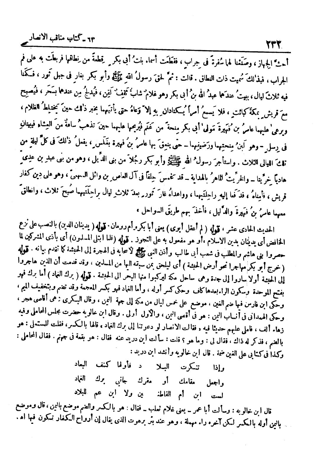 [3905] الْحَدِيثُ الْحَادِيَ عَشَرَ قَوْلُهُ لَمْ أَعْقِلْ أَبَوَيَّ يَعْنِي أَبَا بَكْرٍ وَأُمَّ رُومَانَ قَوْلُهُ يَدِينَانِ الدِّينَ بِالنَّصْبِ عَلَى نَزْعِ الْخَافِضِ أَيْ يَدِينَانِ بِدِينِ الْإِسْلَامِ أَوْ هُوَ مَفْعُولٌ بِهِ عَلَى التَّجَوُّزِ قَوْلُهُ فَلَمَّا ابْتُلِيَ الْمُسْلِمُونَ أَيْ بِأَذَى الْمُشْرِكِينَ لَمَّا حَصَرُوا بَنِي هَاشِمٍ وَالْمُطَّلِبِ فِي شِعْبِ أَبِي طَالِبٍ وَأَذِنَ النَّبِيُّ صَلَّى اللَّهُ عَلَيْهِ وَسَلَّمَ لِأَصْحَابِهِ فِي الْهِجْرَةِ إِلَى الْحَبَشَةِ كَمَا تَقَدَّمَ بَيَانُهُ قَوْلُهُ خَرَجَ أَبُو بَكْرٍ مُهَاجِرًا نَحْوَ أَرْضِ الْحَبَشَةِ أَيْ لِيَلْحَقَ بِمَنْ سَبَقَهُ إِلَيْهَا مِنَ الْمُسْلِمِينَ وَقَدْ قَدَّمْتُ أَنَّ الَّذِينَ هَاجَرُوا إِلَى الْحَبَشَةِ أَوَّلًا سَارُوا إِلَى جِدَّةَ وَهِيَ سَاحِلُ مَكَّةَ لِيَرْكَبُوا مِنْهَا الْبَحْرَ إِلَى الْحَبَشَةِ قَوْلُهُ بَرْكَ الْغِمَادِ أَمَّا بَرْكُ فَهُوَ بِفَتْحِ الْمُوَحَّدَةِ وَسُكُونِ الرَّاءِ بَعْدَهَا كَافٌ وَحُكِيَ كَسْرُ أَوَّلِهِ وَأَمَّا الْغِمَادُ فَهُوَ بِكَسْرِ الْمُعْجَمَة وَقد تضم وبتخفيف الْمِيم وَحكى بن فَارِسٍ فِيهَا ضَمَّ الْغَيْنِ مَوْضِعٌ عَلَى خَمْسِ لَيَالٍ مِنْ مَكَّةَ إِلَى جِهَةِ الْيَمَنِ وَقَالَ الْبَكْرِيُّ هِيَ أَقَاصِي هَجَرَ وَحَكَى الْهَمْدَانِيُّ فِي أَنْسَابِ الْيَمَنِ هُوَ فِي أَقْصَى الْيَمَنِ وَالْأَوَّلُ أولى وَقَالَ بن خَالَوَيْهِ حَضَرْتُ مَجْلِسَ الْمَحَامِلِيِّ وَفِيهِ زُهَاءُ أَلْفٍ فَأَمْلَى عَلَيْهِمْ حَدِيثًا فِيهِ فَقَالَتِ الْأَنْصَارُ لَوْ دَعَوْتَنَا إِلَى بَرْكِ الْغِمَادِ قَالَهَا بِالْكَسْرِ فَقُلْتُ لِلْمُسْتَمْلِي هُوَ بِالضَّمِّ فَذَكَرَ لَهُ ذَاكَ فَقَالَ لي وَمَا هُوَ قلت سَأَلت بن دُرَيْدٍ عَنْهُ فَقَالَ هُوَ بُقْعَةٌ فِي جَهَنَّمَ فَقَالَ الْمَحَامِلِيُّ وَكَذَا فِي كِتَابِي عَلَى الْغَيْنِ ضمة قَالَ بن خالويه وَأنْشد بن دُرَيْد وَإِذا تنكرت الْبِلَاد فأولها كنف البعاد وَاجعَل مقامك أَو مقرك جَانِبي برك الغماد لست بن أم القاطنين وَلَا بن عَم للبلاد قَالَ بن خَالَوَيْهِ وَسَأَلْتُ أَبَا عُمَرَ يَعْنِي غُلَامَ ثَعْلَبٍ فَقَالَ هُوَ بِالْكَسْرِ وَالضَّمِّ مَوْضِعٌ بِالْيَمَنِ قَالَ وَمَوْضِعٌ بِالْيَمَنِ أَوَّلُهُ بِالْكَسْرِ لَكِنْ آخِرُهُ رَاءٌ مُهْمَلَةٌ وَهُوَ عِنْدَ بِئْرِ بَرَهُوتَ الَّذِي يُقَالُ إِنَّ أَرْوَاحَ الْكُفَّارِ تَكُونُ فِيهَا اه