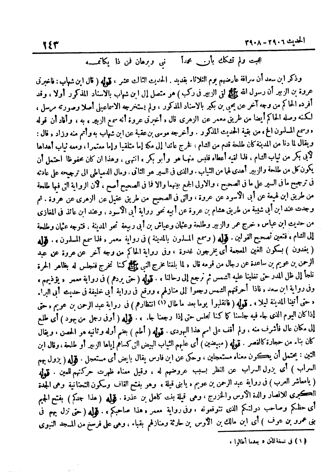 [] قَوْله قَالَ بن شِهَابٍ فَأَخْبَرَنِي عُرْوَةُ بْنُ الزُّبَيْرِ أَنَّ رَسُولَ اللَّهِ صَلَّى اللَّهُ عَلَيْهِ وَسَلَّمَ لَقِيَ الزُّبَيْرَ فِي ركب هُوَ مُتَّصِل إِلَى بن شِهَابٍ بِالْإِسْنَادِ الْمَذْكُورِ أَوَّلًا وَقَدْ أَفْرَدَهُ الْحَاكِمُ مِنْ وَجْهٍ آخَرَ عَنْ يَحْيَى بْنِ بُكَيْرٍ بِالْإِسْنَادِ الْمَذْكُورِ وَلَمْ يَسْتَخْرِجْهُ الْإِسْمَاعِيلِيُّ أَصْلًا وَصُورَتُهُ مُرْسَلٌ لَكِنَّهُ وَصَلَهُ الْحَاكِمُ أَيْضًا مِنْ طَرِيقِ مَعْمَرٍ عَنِ الزُّهْرِيِّ قَالَ أَخْبَرَنِي عُرْوَةُ أَنَّهُ سَمِعَ الزُّبَيْرَ بِهِ وَأَفَادَ أَنَّ قَوْلَهُ وَسَمِعَ الْمُسْلِمُونَ إِلَخْ مِنْ بَقِيَّةِ الْحَدِيثِ الْمَذْكُورِ وَأَخْرَجَهُ مُوسَى بن عقبَة عَن بن شِهَابٍ بِهِ وَأَتَمَّ مِنْهُ وَزَادَ قَالَ وَيُقَالُ لَمَّا دَنَا مِنَ الْمَدِينَةِ كَانَ طَلْحَةُ قَدِمَ مِنَ الشَّامِ فَخَرَجَ عَائِدًا إِلَى مَكَّةَ إِمَّا مُتَلَقِّيًا وَإِمَّا مُعْتَمِرًا وَمَعَهُ ثِيَابٌ أَهْدَاهَا لِأَبِي بَكْرٍ مِنْ ثِيَابِ الشَّامِ فَلَمَّا لَقِيَهُ أَعْطَاهُ فَلَبِسَ مِنْهَا هُوَ وَأَبُو بَكْرٍ انْتَهَى وَهَذَا إِنْ كَانَ مَحْفُوظًا احْتُمِلَ أَنْ يَكُونَ كُلٌّ مِنَ طَلْحَةَ وَالزُّبَيْرِ أَهْدَى لَهُمَا مِنَ الثِّيَابِ وَالَّذِي فِي السِّيَرِ هُوَ الثَّانِي وَمَالَ الدِّمْيَاطِيُّ إِلَى تَرْجِيحِهِ عَلَى عَادَتِهِ فِي تَرْجِيحِ مَا فِي السِّيَرِ عَلَى مَا فِي الصَّحِيحِ وَالْأَوْلَى الْجَمْعُ بَيْنَهُمَا وَإِلَّا فَمَا فِي الصَّحِيحِ أَصَحُّ لِأَنَّ الرِّوَايَةَ الَّتِي فِيهَا طَلْحَةُ مِنْ طَرِيقِ بن لَهِيعَةَ عَنْ أَبِي الْأَسْوَدِ عَنْ عُرْوَةَ وَالَّتِي فِي الصَّحِيحِ مِنْ طَرِيقِ عُقَيْلٍ عَنِ الزُّهْرِيِّ عَنْ عُرْوَةَ ثمَّ وجدت عِنْد بن أَبِي شَيْبَةَ مِنْ طَرِيقِ هِشَامِ بْنِ عُرْوَةَ عَنْ أَبِيهِ نَحْوَ رِوَايَةِ أَبِي الْأَسْوَدِ وَعِنْدَ بن عَائِذ فِي الْمَغَازِي من حَدِيث بن عَبَّاسٍ خَرَجَ عُمَرُ وَالزُّبَيْرُ وَطَلْحَةُ وَعُثْمَانُ وَعَيَّاشُ بن أبي رَبِيعَةَ نَحْوَ الْمَدِينَةِ فَتَوَجَّهَ عُثْمَانُ وَطَلْحَةُ إِلَى الشَّامِ فَتَعَيَّنَ تَصْحِيحُ الْقَوْلَيْنِ قَوْلُهُ وَسَمِعَ الْمُسْلِمُونَ بِالْمَدِينَةِ فِي رِوَايَةِ مَعْمَرٍ فَلَمَّا سَمِعَ الْمُسْلِمُونَ قَوْلُهُ يَغْدُونَ بِسُكُونِ الْغَيْنِ الْمُعْجَمَةِ أَيْ يَخْرُجُونَ غُدْوَةً وَفِي رِوَايَةِ الْحَاكِمِ مِنْ وَجْهٍ آخَرَ عَنْ عُرْوَةَ عَنْ عَبْدِ الرَّحْمَنِ بْنِ عُوَيْمِ بْنِ سَاعِدَةَ عَنْ رِجَالٍ مِنْ قَوْمِهِ قَالَ لَمَّا بَلَغَنَا مَخْرَجُ النَّبِيِّ صَلَّى اللَّهُ عَلَيْهِ وَسَلَّمَ كُنَّا نَخْرُجُ فَنَجْلِسُ لَهُ بِظَاهِرِ الْحَرَّةِ نَلْجَأُ إِلَى ظِلِّ الْمَدَرِ حَتَّى تَغْلِبَنَا عَلَيْهِ الشَّمْسُ ثُمَّ نَرْجِعُ إِلَى رِحَالِنَا قَوْلُهُ حَتَّى يَرُدَّهُمْ فِي رِوَايَةِ مَعْمَرٍ يُؤْذِيهِمْ وَفِي رِوَايَةِ بن سعد فَإِذا أحرقتهم الشَّمْس رَجَعُوا إِلَى مَنَازِلِهِمْ وَوَقَعَ فِي رِوَايَةِ أَبِي خَلِيفَةَ فِي حَدِيثِ أَبِي الْبَرَاءِ حَتَّى أَتَيْنَا الْمَدِينَة لَيْلًا قَوْله فانقلبوا يَوْمًا بعد مَا طَال انْتِظَارَهُمْ فِي رِوَايَةِ عَبْدِ الرَّحْمَنِ بْنِ عُوَيْمِ حَتَّى إِذَا كَانَ الْيَوْمُ الَّذِي جَاءَ فِيهِ جَلَسْنَا كَمَا كُنَّا نَجْلِسُ حَتَّى إِذَا رَجَعْنَا جَاءَ قَوْلُهُ أَوْفَى رَجُلٌ مِنْ يَهُودَ أَيْ طَلَعَ إِلَى مَكَانٍ عَالٍ فَأَشْرَفَ مِنْهُ وَلَمْ أَقِفْ عَلَى اسْمِ هَذَا الْيَهُودِيِّ قَوْلُهُ أُطُمٍ بِضَمِّ أَوَّلِهِ وَثَانِيهِ هُوَ الْحِصْنُ وَيُقَالُ كَانَ بِنَاءً مِنْ حِجَارَةٍ كَالْقَصْرِ قَوْلُهُ مُبَيَّضِينَ أَيْ عَلَيْهِمُ الثِّيَابُ الْبِيضُ الَّتِي ك