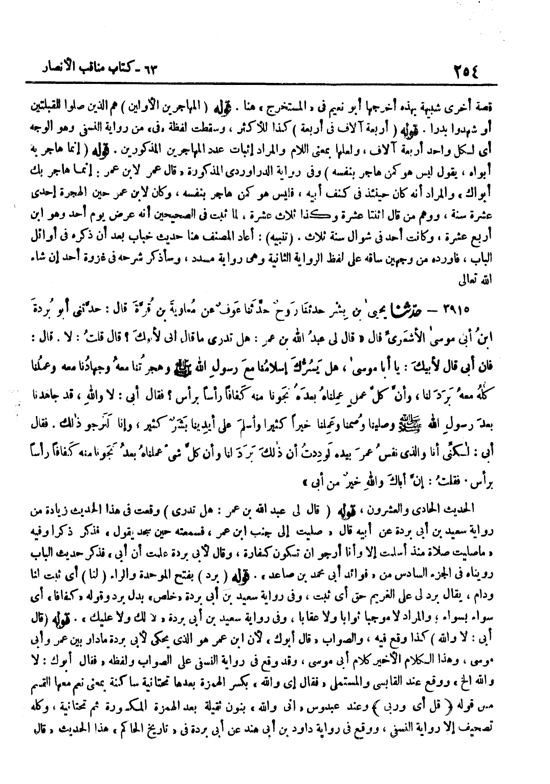 [3915] قَوْلُهُ قَالَ لِي عَبْدُ اللَّهِ بْنُ عُمَرَ هَلْ تَدْرِي وَقَعَتْ فِي هَذَا الْحَدِيثِ زِيَادَةٌ مِنْ رِوَايَةِ سَعِيدِ بْنِ أَبِي بُرْدَةَ عَنْ أَبِيه قَالَ صليت إِلَى جنب بن عُمَرَ فَسَمِعْتُهُ حِينَ سَجَدَ يَقُولُ فَذَكَرَ ذِكْرًا وَفِيهِ مَا صَلَّيْتُ صَلَاةً مُنْذُ أَسْلَمْتُ إِلَّا وَأَنَا أَرْجُو أَنْ تَكُونَ كَفَّارَةً وَقَالَ لِأَبِي بُرْدَةَ عَلِمْتُ أَنَّ أَبِي فَذَكَرَ حَدِيثَ الْبَابِ رُوِّينَاهُ فِي الْجُزْءِ السَّادِسِ مِنْ فَوَائِدِ أَبِي مُحَمَّدِ بْنِ صَاعِدٍ قَوْلُهُ بَرَدَ بِفَتْحِ الْمُوَحَّدَةِ وَالرَّاءِ لَنَا أَيْ ثَبَتَ لَنَا وَدَامَ يُقَالُ بَرَدَ لِي عَلَى الْغَرِيمِ حَقٌّ أَيْ ثَبَتَ وَفِي رِوَايَةِ سَعِيدِ بْنِ أَبِي بُرْدَةَ خَلَصَ بَدَلَ بَرَدَ وَقَوْلُهُ كَفَافًا أَيْ سَوَاءً بِسَوَاءٍ وَالْمُرَادُ لَا مُوجِبًا ثَوَابًا وَلَا عِقَابًا وَفِي رِوَايَةِ سَعِيدِ بْنِ أَبِي بُرْدَةَ لَا لَكَ وَلَا عَلَيْكَ قَوْلُهُ قَالَ أَبِي لَا وَاللَّهِ كَذَا وَقَعَ فِيهِ وَالصَّوَابُ قَالَ أَبُوكَ لِأَنَّ بن عُمَرَ هُوَ الَّذِي يَحْكِي لِأَبِي بُرْدَةَ مَا دَارَ بَيْنَ عُمَرَ وَأَبِي مُوسَى وَهَذَا الْكَلَامُ الْأَخِيرُ كَلَامُ أَبِي مُوسَى وَقَدْ وَقَعَ فِي رِوَايَةِ النَّسَفِيِّ عَلَى الصَّوَابِ وَلَفْظُهُ فَقَالَ أَبُوكَ لَا وَاللَّهِ إِلَخْ وَوَقَعَ عِنْدَ الْقَابِسِيِّ وَالْمُسْتَمْلِي فَقَالَ إِي وَاللَّهِ بِكَسْرِ الْهَمْزَةِ بَعْدَهَا تَحْتَانِيَّةٌ سَاكِنَةٌ بِمَعْنَى نَعَمْ مَعَهَا الْقَسَمُ مِثْلَ قَوْلِهِ قل أَي وربي وَعِنْدَ عَبْدُوسٍ إِنِّي وَاللَّهِ بِنُونٍ ثَقِيلَةٍ بَعْدَ الْهَمْزَةِ الْمَكْسُورَةِ ثُمَّ تَحْتَانِيَّةٍ وَكُلُّهُ تَصْحِيفٌ إِلَّا رِوَايَةَ النَّسَفِيِّ وَوَقَعَ فِي رِوَايَةِ دَاوُدَ بْنِ أَبِي هِنْدٍ عَنْ أَبِي بُرْدَةَ فِي تَارِيخِ الْحَاكِمِ هَذَا الْحَدِيثُ قَالَ