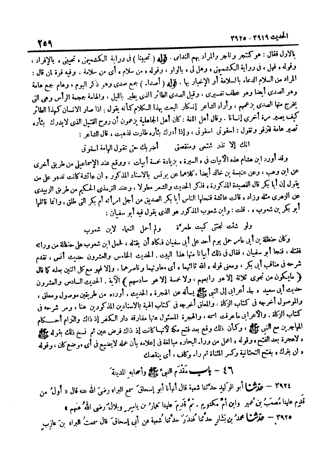 (إِنَّكَ إِلَّا تَذَرْ شَتْمِي وَمَنْقَصَتِي ... أَضْرِبْكَ حَتَّى تَقُولَ الْهَامَةُ اسْقُونِي) وَقد أورد بن هِشَامٍ هَذِهِ الْأَبْيَاتَ فِي السِّيرَةِ بِزِيَادَةِ خَمْسَةِ أَبْيَاتٍ وَوَقَعَ عِنْدَ الْإِسْمَاعِيلِيِّ مِنْ طَرِيقٍ أُخْرَى عَن بن وَهْبٍ وَعَنْ عَنْبَسَةَ بْنِ خَالِدٍ أَيْضًا كِلَاهُمَا عَنْ يُونُسَ بِالْإِسْنَادِ الْمَذْكُورِ أَنَّ عَائِشَةَ كَانَتْ تَدْعُو عَلَى مَنْ يَقُولُ إِنَّ أَبَا بَكْرٍ قَالَ الْقَصِيدَةَ الْمَذْكُورَةَ فَذَكَرَ الْحَدِيثَ وَالشِّعْرَ مُطَوَّلًا وَعِنْدَ التِّرْمِذِيِّ الْحَكِيمِ مِنْ طَرِيقِ الزُّبَيْدِيِّ عَنِ الزُّهْرِيِّ مِثْلُهُ وَزَادَ قَالَتْ عَائِشَةُ فَنَحَلَهَا النَّاسُ أَبَا بَكْرٍ الصِّدِّيقَ مِنْ أَجْلِ امْرَأَتِهِ أُمِّ بَكْرٍ الَّتِي طَلَّقَ وَإِنَّمَا قَائِلُهَا أَبُو بَكْرِ بن شعوب قلت وبن شَعُوبٍ الْمَذْكُورُ هُوَ الَّذِي يَقُولُ فِيهِ أَبُو سُفْيَانَ وَلَوْ شِئْتُ نَجَّتْنِي كُمَيْتٌ طِمِرَّةٌ وَلَمْ أَحْمِلِ النَّعْمَاءَ لِابْنِ شَعُوبِ وَكَانَ حَنْظَلَةُ بْنُ أَبِي عَامِرٍ حَمَلَ يَوْمَ أُحُدٍ عَلَى أَبِي سُفْيَان فكاد أَن يقْتله فَحمل بن شَعُوبٍ عَلَى حَنْظَلَةَ مِنْ وَرَائِهِ فَقَتَلَهُ فَنَجَا أَبُو سُفْيَانَ فَقَالَ فِي ذَلِكَ أَبْيَاتًا مِنْهَا هَذَا الْبَيْتُ الْحَدِيثُ الْخَامِسُ وَالْعِشْرُونَ حَدِيثُ أَنَسٍ تَقَدَّمَ شَرْحُهُ فِي مَنَاقِبِ أَبِي بَكْرٍ وَمَعْنَى