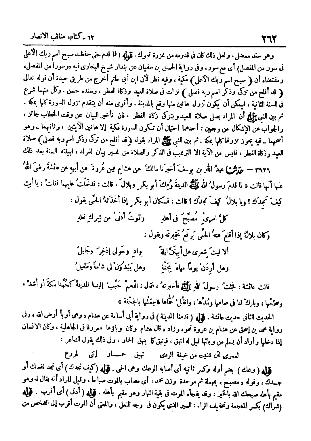 [3926] قَوْلُهُ قَدِمْنَا الْمَدِينَةَ فِي رِوَايَةِ أَبِي أُسَامَةَ عَنْ هِشَامٍ وَهِيَ أَوْبَأُ أَرْضِ اللَّهِ وَفِي رِوَايَةِ مُحَمَّدِ بْنِ إِسْحَاقَ عَنْ هِشَامِ بْنِ عُرْوَةَ نَحْوَهُ وَزَادَ قَالَ هِشَامٌ وَكَانَ وَبَاؤُهَا مَعْرُوفًا فِي الْجَاهِلِيَّةِ وَكَانَ الْإِنْسَانُ إِذَا دَخَلَهَا وَأَرَادَ أَنْ يَسْلَمَ مِنْ وَبَائِهَا قِيلَ لَهُ انْهَقْ فَيَنْهَقُ كَمَا يَنْهَقُ الْحِمَارُ وَفِي ذَلِكَ يَقُولُ الشَّاعِرُ لَعَمْرِي لَئِنْ غَنَّيْتَ مِنْ خِيفَةِ الرَّدَى نَهِيقَ حِمَارٍ إِنَّنِي لَمُرَوَّعُ قَوْلُهُ وُعِكَ بِضَمِّ أَوَّلِهِ وَكَسْرِ ثَانِيهِ أَيْ أَصَابَهُ الْوَعْكُ وَهِيَ الْحُمَّى قَوْلُهُ كَيْفَ تَجِدُكَ أَيْ تَجِدُ نَفْسَكَ أَوْ جَسَدَكَ وَقَوْلُهُ مُصَبَّحٌ بِمُهْمَلَةٍ ثُمَّ مُوَحَّدَةٍ وَزْنَ مُحَمَّدٍ أَيْ مُصَابٌ بِالْمَوْتِ صَبَاحًا وَقِيلَ الْمُرَادُ أَنَّهُ يُقَالُ لَهُ وَهُوَ مُقِيمٌ بِأَهْلِهِ صَبَّحَكَ اللَّهُ بِالْخَيْرِ وَقد يفجأه الْمَوْتُ فِي بَقِيَّةِ النَّهَارِ وَهُوَ مُقِيمٌ بِأَهْلِهِ قَوْلُهُ أَدْنَى أَيْ أَقْرَبُ قَوْلُهُ شِرَاكِ بِكَسْرِ الْمُعْجَمَةِ وَتَخْفِيفِ الرَّاءِ السَّيْرُ الَّذِي يَكُونُ فِي وَجْهِ النَّعْلِ وَالْمَعْنَى أَنَّ الْمَوْتَ أَقْرَبُ إِلَى الشَّخْص من