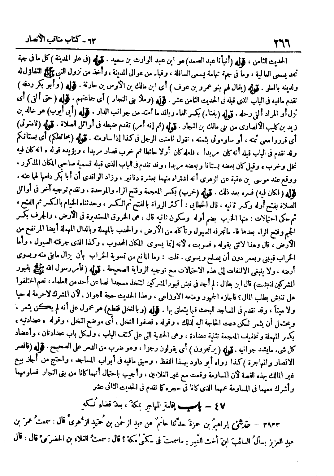 [3932] قَوْلُهُ أَنْبَأَنَا عَبْدُ الصَّمَدِ هُوَ بن عَبْدِ الْوَارِثِ بْنِ سَعِيدٍ قَوْلُهُ فِي عُلْوِ الْمَدِينَةِ كُلُّ مَا فِي جِهَةِ نَجْدٍ يُسَمَّى الْعَالِيَةَ وَمَا فِي جِهَةِ تِهَامَةَ يُسَمَّى السَّافِلَةَ وَقُبَاءُ مِنْ عَوَالِي الْمَدِينَةِ وَأَخَذَ مِنْ نُزُولِ النَّبِيِّ صَلَّى اللَّهُ عَلَيْهِ وَسَلَّمَ التَّفَاؤُلَ لَهُ وَلِدِينِهِ بِالْعُلْوِ قَوْلُهُ يُقَالُ لَهُمْ بَنُو عَمْرِو بن عَوْف أَي بن مَالك بن الْأَوْس بْنِ حَارِثَةَ قَوْلُهُ وَأَبُو بَكْرٍ رِدْفُهُ تَقَدَّمَ مَا فِيهِ فِي الْبَابِ الَّذِي قَبْلَهُ فِي الْحَدِيثِ الثَّامِنِ عَشَرَ قَوْلُهُ وَمَلَأُ بَنِي النَّجَّارِ أَيْ جَمَاعَتَهُمْ قَوْلُهُ حَتَّى أَلْقَى أَيْ نَزَلَ أَوِ الْمُرَادُ أَلْقَى رَحْلَهُ قَوْلُهُ بِفِنَاءِ بِكَسْرِ الْفَاءِ وَبِالْمَدِّ مَا امْتَدَّ مِنْ جَوَانِبِ الدَّارِ قَوْلُهُ أَبِي أَيُّوبَ هُوَ خَالِدُ بْنُ زَيْدِ بْنِ كُلَيْبٍ الْأَنْصَارِيُّ مِنْ بَنِي مَالِكِ بْنِ النَّجَّارِ قَوْلُهُ ثُمَّ إِنَّهُ أَمَرَ تَقَدَّمَ ضَبْطُهُ فِي أَوَائِلِ الصَّلَاةِ قَوْلُهُ ثَامِنُونِي أَيْ قَرِّرُوا مَعِي ثَمَنَهُ أَوْ سَاوِمُونِي بِثَمَنِهِ تَقُولُ ثَامَنْتُ الرَّجُلَ فِي كَذَا إِذَا سَاوَمْتَهُ قَوْلُهُ بِحَائِطِكُمْ أَيْ بُسْتَانِكُمْ وَقَدْ تَقَدَّمَ فِي الْبَابِ قَبْلَهُ أَنَّهُ كَانَ مِرْبَدًا فَلَعَلَّهُ كَانَ أَوَّلًا حَائِطًا ثُمَّ خَرِبَ فَصَارَ مِرْبَدًا وَيُؤَيِّدُهُ قَوْلُهُ إِنَّهُ كَانَ فِيهِ نَخْلٌ وَخَرِبَ وَقِيلَ كَانَ بَعْضُهُ بُسْتَانًا وَبَعْضُهُ مِرْبَدًا وَقَدْ تَقَدَّمَ فِي الْبَابِ الَّذِي قَبْلَهُ تَسْمِيَةُ صَاحِبَيِ الْمَكَانِ الْمَذْكُورِ وَوَقَعَ عِنْدَ مُوسَى بْنِ عُقْبَةَ عَنِ الزُّهْرِيِّ أَنَّهُ اشْتَرَاهُ مِنْهُمَا بِعَشَرَةِ دَنَانِيرَ وَزَادَ الْوَاقِدِيُّ أَنَّ أَبَا بَكْرٍ دَفَعَهَا لَهُمَا عَنْهُ قَوْلُهُ فَكَانَ فِيهِ فَسَّرَهُ بَعْدَ ذَلِكَ قَوْلُهُ خِرَبَ بِكَسْرِ الْمُعْجَمَةِ وَفَتْحِ الرَّاءِ وَالْمُوَحَّدَةِ وَتَقَدَّمَ تَوْجِيهٌ آخَرُ فِي أَوَائِلِ الصَّلَاةِ بِفَتْحِ أَوَّلِهِ وَكَسْرِ ثَانِيهِ قَالَ الْخَطَّابِيُّ أَكْثَرُ الرُّوَاةِ بِالْفَتْحِ ثُمَّ الْكَسْرِ وَحَدَّثَنَاهُ الْخَيَّامُ بِالْكَسْرِ ثُمَّ الْفَتْحِ ثُمَّ حَكَى احْتِمَالَاتٍ مِنْهَا الْخُرْبُ بِضَمِّ أَوَّلِهِ وَسُكُونِ ثَانِيهِ قَالَ هِيَ الْخُرُوقُ الْمُسْتَدِيرَةُ فِي الْأَرْضِ وَالْجِرَفُ بِكَسْرِ الْجِيمِ وَفَتْحِ الرَّاءِ بَعْدَهَا فَاءٌ مَا تَجْرُفُهُ السُّيُولُ وَتَأْكُلُهُ مِنَ الْأَرْضِ وَالْحَدَبُ بِالْمُهْمَلَةِ وَبِالدَّالِ الْمُهْمَلَةِ أَيْضًا الْمُرْتَفِعُ مِنَ الْأَرْضِ قَالَ وَهَذَا لَائِقٌ بِقَوْلِهِ فَسُوِّيَتْ لِأَنَّهُ إِنَّمَا يُسَوَّى الْمَكَان المحدوب وَكَذَا الَّذِي جَرَفَتْهُ السُّيُولُ وَأَمَّا الْخَرَابُ فَيُبْنَى وَيُعْمَرُ دُونَ أَنْ يُصْلَحَ وَيُسَوَّى قُلْتُ وَمَا الْمَانِعُ مِنْ تَسْوِيَةِ الْخَرَابِ بِأَنْ يُزَالَ مَا بَقِيَ مِنْهُ وَيُسَوَّى أَرْضُهُ وَلَا يَنْبَغِي الِالْتِفَاتُ إِلَى هَذِهِ الِاحْتِمَالَاتِ مَعَ تَوْجِيهِ الرِّوَايَةِ الصَّحِيحَةِ قَوْلُهُ فَأَمَرَ رَسُولُ اللَّهِ صَلَّى اللَّهُ عَلَيْهِ وَسَلَّمَ بِقُبُورِ الْمُشْركين فنبشت قَالَ بن بَطَّالٍ لَمْ أَجِدْ فِي نَبْشِ قُبُورِ الْمُشْرِكِينَ لِتُتَّخَذَ مَسْجِدًا نَصًّا عَنْ أَحَدٍ مِنَ الْعُلَمَاءِ نَعَمُ اخْتَلَفُوا هَلْ تُنْبَشُ بِطَلَبِ الْمَالِ فَأَجَازَهُ الْجُمْهُورُ وَمَنَعَهُ الْأَوْزَاعِيُّ وَهَذَا الْحَدِيثُ حُجَّةٌ لِلْجَوَازِ لِأَنَّ الْمُشْرِكَ لَا حُرْمَةَ لَهُ حَيًّا وَلَا مَيِّتًا وَقَدْ تَقَدَّمَ فِي الْمَسَاجِ
