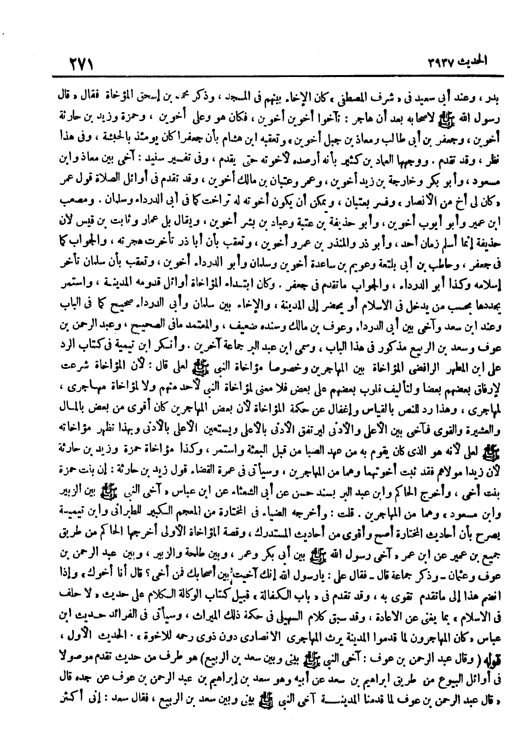 بَدْرٍ وَعِنْدَ أَبِي سَعِيدٍ فِي شَرَفِ الْمُصْطَفَى كَانَ الْإِخَاءُ بَيْنَهُمْ فِي الْمَسْجِدِ وَذَكَرَ مُحَمَّدُ بْنُ إِسْحَاقَ الْمُؤَاخَاةَ فَقَالَ قَالَ رَسُولُ اللَّهِ صَلَّى اللَّهُ عَلَيْهِ وَسَلَّمَ لِأَصْحَابِهِ بَعْدَ أَنْ هَاجَرَ تَآخَوْا أَخَوَيْنِ أَخَوَيْنِ فَكَانَ هُوَ وَعَلِيٌّ أَخَوَيْنِ وَحَمْزَةُ وَزَيْدُ بْنُ حَارِثَةَ أَخَوَيْنِ وَجَعْفَرُ بْنُ أَبِي طَالِبٍ وَمُعَاذُ بْنُ جَبَلٍ أَخَوَيْنِ وَتعقبه بن هِشَامٍ بِأَنَّ جَعْفَرًا كَانَ يَوْمَئِذٍ بِالْحَبَشَةِ وَفِي هَذَا نظر وَقد تقدم ووجهها الْعِمَاد بن كَثِيرٍ بِأَنَّهُ أَرْصَدَهُ لِأُخُوَّتِهِ حَتَّى يَقْدَمَ وَفِي تَفْسِير سنيد آخى بَين معَاذ وبن مَسْعُودٍ وَأَبُو بَكْرٍ وَخَارِجَةُ بْنُ زَيْدٍ أَخَوَيْنِ وَعُمَرُ وَعِتْبَانُ بْنُ مَالِكٍ أَخَوَيْنِ وَقَدْ تَقَدَّمَ فِي أَوَائِلِ الصَّلَاةِ قَوْلُ عُمَرَ كَانَ لِي أَخٌ مِنَ الْأَنْصَارِ وَفُسِّرَ بِعِتْبَانَ وَيُمْكِنُ أَنْ يَكُونَ أُخُوَّتُهُ لَهُ تَرَاخَتْ كَمَا فِي أَبِي الدَّرْدَاءِ وَسَلْمَانَ وَمُصْعَبِ بْنِ عُمَيْرٍ وَأَبُو أَيُّوبُ أَخَوَيْنِ وَأَبُو حُذَيْفَةَ بْنُ عُتْبَةَ وَعَبَّادُ بْنُ بِشْرٍ أَخَوَيْنِ وَيُقَالُ بَلْ عَمَّارٌ وَثَابِتُ بْنُ قَيْسٍ لِأَنَّ حُذَيْفَةَ إِنَّمَا أَسْلَمَ زَمَانَ أُحُدٍ وَأَبُو ذَرٍّ وَالْمُنْذِرُ بْنُ عَمْرٍو أَخَوَيْنِ وَتُعُقِّبَ بِأَنَّ أَبَا ذَرٍّ تَأَخَّرَتْ هِجْرَتُهُ وَالْجَوَابُ كَمَا فِي جَعْفَرٍ وَحَاطِبُ بْنُ أَبِي بَلْتَعَةَ وَعُوَيْمُ بْنُ سَاعِدَةَ أَخَوَيْنِ وَسَلْمَانُ وَأَبُو الدَّرْدَاءِ أَخَوَيْنِ وَتُعُقِّبَ بِأَنَّ سَلْمَانَ تَأَخَّرَ إِسْلَامُهُ وَكَذَا أَبُو الدَّرْدَاءِ وَالْجَوَابُ مَا تَقَدَّمَ فِي جَعْفَرٍ وَكَانَ ابْتِدَاءُ الْمُؤَاخَاةِ أَوَائِلَ قُدُومِهِ الْمَدِينَةَ وَاسْتَمَرَّ يُجَدِّدُهَا بِحَسَبِ مَنْ يَدْخُلُ فِي الْإِسْلَامِ أَوْ يَحْضُرُ إِلَى الْمَدِينَةِ وَالْإِخَاءُ بَيْنَ سَلْمَانَ وَأَبِي الدَّرْدَاءِ صَحِيح كَمَا فِي الْبَاب وَعند بن سَعْدٍ وَآخَى بَيْنَ أَبِي الدَّرْدَاءِ وَعَوْفِ بْنِ مَالِكٍ وَسَنَدُهُ ضَعِيفٌ وَالْمُعْتَمَدُ مَا فِي الصَّحِيحِ وَعَبْدُ الرَّحْمَنِ بْنُ عَوْفٍ وَسَعْدُ بْنُ الرَّبِيعِ مَذْكُور فِي هَذَا الْبَاب وسمى بن عبد الْبر جمَاعَة آخَرين وَأنكر بن تَيْمِية فِي كتاب الرَّد على بن الْمُطَهَّرِ الرَّافِضِيِّ الْمُؤَاخَاةَ بَيْنَ الْمُهَاجِرِينَ وَخُصُوصًا مُؤَاخَاةَ النَّبِيِّ صَلَّى اللَّهُ عَلَيْهِ وَسَلَّمَ لِعَلِيٍّ قَالَ لِأَن المؤاخاة شرعت لإرفاق بَعضهم بَعْضًا ولتأليف قُلُوب بَعضهم على بعض فَلَا معنى لمؤاخاة النَّبِي لِأَحَدٍ مِنْهُمْ وَلَا لِمُؤَاخَاةِ مُهَاجِرِيٍّ لِمُهَاجِرِيٍّ وَهَذَا رَدٌّ لِلنَّصِّ بِالْقِيَاسِ وَإِغْفَالٌ عَنْ حِكْمَةِ الْمُؤَاخَاةِ لِأَنَّ بَعْضَ الْمُهَاجِرِينَ كَانَ أَقْوَى مِنْ بَعْضٍ بِالْمَالِ وَالْعَشِيرَةِ وَالْقُوَى فَآخَى بَيْنَ الْأَعْلَى وَالْأَدْنَى لِيَرْتَفِقَ الْأَدْنَى بِالْأَعْلَى وَيَسْتَعِينُ الْأَعْلَى بِالْأَدْنَى وَبِهَذَا تَظْهَرُ مُؤَاخَاتُهُ صَلَّى اللَّهُ عَلَيْهِ وَسَلَّمَ لِعَلِيٍّ لِأَنَّهُ هُوَ الَّذِي كَانَ يَقُومُ بِهِ مِنْ عَهْدِ الصِّبَا مِنْ قَبْلِ الْبَعْثَةِ وَاسْتَمَرَّ وَكَذَا مُؤَاخَاةُ حَمْزَةَ وَزَيْدِ بْنِ حَارِثَةَ لِأَنَّ زَيْدًا مَوْلَاهُمْ فَقَدْ ثَبَتَ أُخُوَّتُهُمَا وَهُمَا مِنَ الْمُهَاجِرِينَ وَسَيَأْتِي فِي عُمْرَةِ الْقَضَاءِ قَوْلُ زَيْدِ بْنِ حَارِثَةَ إِنَّ بِنْتَ حَمْزَةَ بِنْتُ أَخِي وَأَخْرَجَ الْحَاكِم وبن عَبْدِ الْبَرِّ بِسَنَدٍ حَسَنٍ عَنْ أَبِي الشَّعْثَاءِ عَن بن عَبَّاسٍ آخَى النَّبِيُّ صَلَّى اللَّ