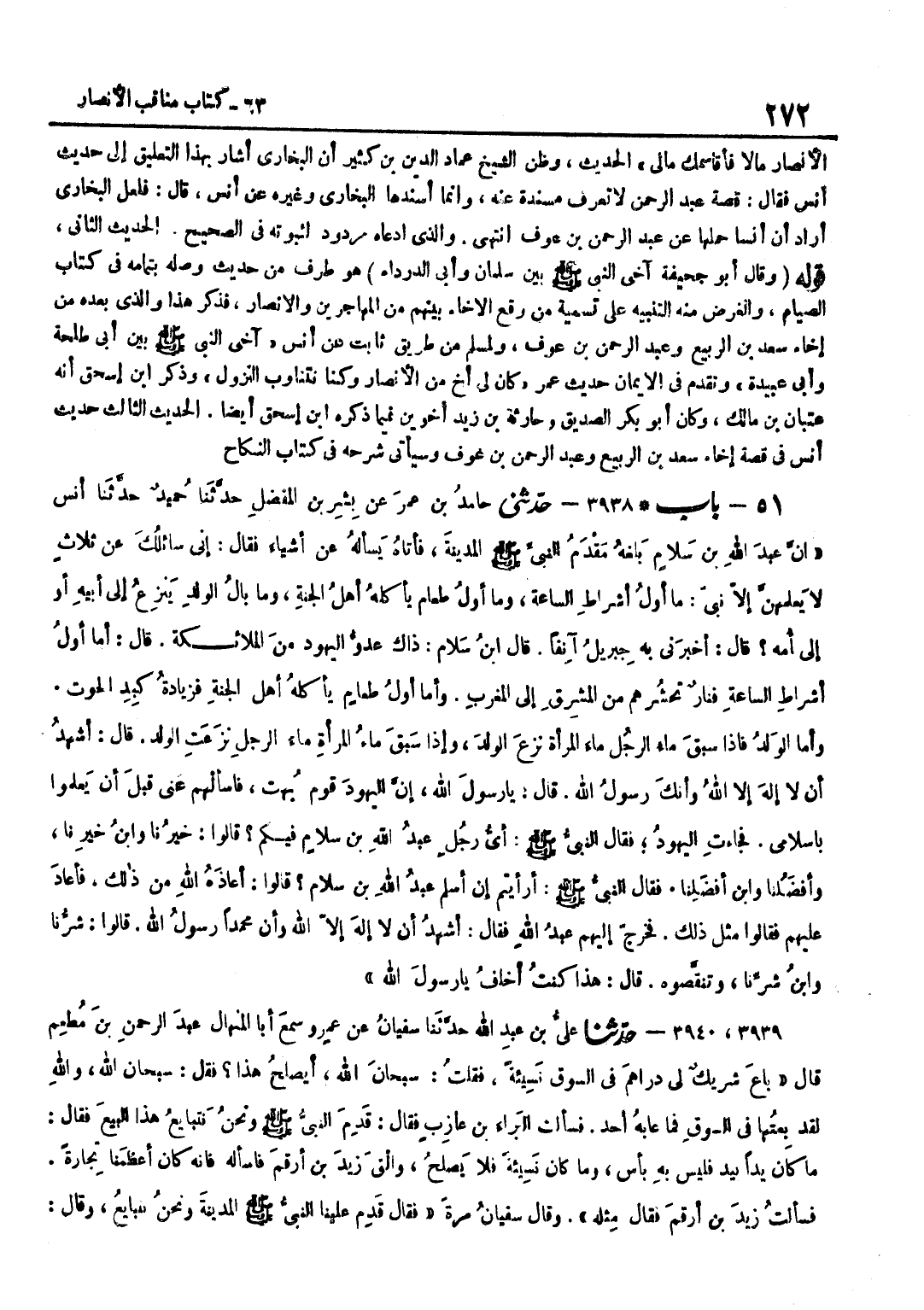 الْأَنْصَارِ مَالًا فَأُقَاسِمُكَ مَالِي الْحَدِيثَ وَظَنَّ الشَّيْخُ عماد الدّين بن كَثِيرٍ أَنَّ الْبُخَارِيَّ أَشَارَ بِهَذَا التَّعْلِيقِ إِلَى حَدِيثِ أَنَسٍ فَقَالَ قِصَّةُ عَبْدِ الرَّحْمَنِ لَا تُعْرَفُ مُسْنَدَةً عَنْهُ وَإِنَّمَا أَسْنَدَهَا الْبُخَارِيُّ وَغَيْرُهُ عَنْ أَنَسٍ قَالَ فَلَعَلَّ الْبُخَارِيَّ أَرَادَ أَنَّ أَنَسًا حَمَلَهَا عَنْ عَبْدِ الرَّحْمَنِ بْنِ عَوْفٍ انْتَهَى وَالَّذِي ادَّعَاهُ مَرْدُودٌ لِثُبُوتِهِ فِي الصَّحِيحِ الْحَدِيثُ الثَّانِي قَوْلُهُ وَقَالَ أَبُو جُحَيْفَةَ آخَى النَّبِيُّ صَلَّى اللَّهُ عَلَيْهِ وَسَلَّمَ بَيْنَ سَلْمَانَ وَأَبِي الدَّرْدَاءِ هُوَ طَرَفٌ مِنْ حَدِيثٍ وَصَلَهُ بِتَمَامِهِ فِي كِتَابِ الصِّيَامِ وَالْغَرَضُ مِنْهُ التَّنْبِيهُ عَلَى تَسْمِيَةِ مَنْ وَقَعَ الْإِخَاءُ بَيْنَهُمْ مِنَ الْمُهَاجِرِينَ وَالْأَنْصَارِ فَذَكَرَ هَذَا وَالَّذِي بَعْدَهُ مِنْ إِخَاءِ سَعْدِ بْنِ الرَّبِيعِ وَعَبْدِ الرَّحْمَنِ بْنِ عَوْفٍ وَلِمُسْلِمٍ مِنْ طَرِيقٍ ثَابِتٍ عَنْ أَنَسٍ آخَى النَّبِيُّ صَلَّى اللَّهُ عَلَيْهِ وَسَلَّمَ بَيْنَ أَبِي طَلْحَةَ وَأَبِي عُبَيْدَةَ وَتَقَدَّمَ فِي الْإِيمَانِ حَدِيثُ عُمَرَ كَانَ لِي أَخٌ مِنَ الْأَنْصَارِ وَكُنَّا نتناوب النُّزُول وَذكر بن إِسْحَاقَ أَنَّهُ عِتْبَانُ بْنُ مَالِكٍ وَكَانَ أَبُو بَكْرٍ الصِّدِّيقُ وَحَارِثَةُ بْنُ زَيْدٍ أَخَوَيْنِ فِيمَا ذكره بن إِسْحَاقَ أَيْضًا الْحَدِيثُ الثَّالِثُ حَدِيثُ أَنَسٍ فِي قِصَّةِ إِخَاءِ سَعْدِ بْنِ الرَّبِيعِ وَعَبْدِ الرَّحْمَنِ بْنِ عَوْفٍ وَسَيَأْتِي شَرْحُهُ فِي كِتَابِ النِّكَاحِ