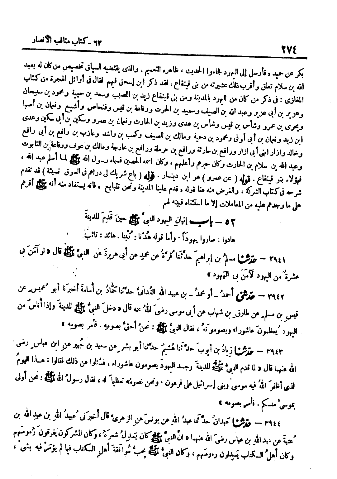 بكر عَن حميد فَأرْسل إِلَى الْيَهُود فجاؤوا الْحَدِيثَ ظَاهِرُهُ التَّعْمِيمُ وَالَّذِي يَقْتَضِيهِ السِّيَاقُ تَخْصِيصَ مَنْ كَانَ لَهُ بِعَبْدِ اللَّهِ بْنِ سَلَامٍ تَعَلُّقٌ وَأَقْرَبُ ذَلِكَ عَشِيرَتُهُ مِنْ بَنِي قَيْنُقَاعَ فقد ذكر بن إِسْحَاقَ فِيهِمْ فَقَالَ فِي أَوَائِلِ الْهِجْرَةِ مِنْ كِتَابِ الْمَغَازِي فِي ذِكْرِ مَنْ كَانَ مِنَ الْيَهُود بِالْمَدِينَةِ وَمِنْ بَنِي قَيْنُقَاعَ زَيْدُ بْنُ اللَّصِيبِ وَسَعْدُ بن حيية ومحمود بن سبيحان وعزير بن أبي عُزَيْر وَعبد الله بن الصَّيف وَسَعِيد بن الحرت وَرِفَاعَةُ بْنُ قَيْسٍ وَفِنْحَاصُ وَأَشْيَعُ وَنُعْمَانُ بْنُ أَصْبَا وَيَحْرِي بْنُ عَمْرٍو وَشَأْسُ بْنُ قَيْسٍ وَشَأْسُ بْنُ عَدِيٍّ وَزَيْدُ بْنُ الْحَارِثِ وَنُعْمَانُ بن عَمْرو وَسُكَيْنُ بْنُ أَبِي سُكَيْنٍ وَعَدِيُّ بْنُ زَيْدٍ وَنُعْمَانُ بْنُ أَبِي أَوْفَى وَمَحْمُودُ بْنُ دِحْيَةَ وَمَالِكُ بْنُ الصَّيْفِ وَكَعْبُ بْنُ رَاشِدٍ وَعَازِبُ بْنُ رَافِعِ بْنِ أَبِي رَافِعٍ وَخَالِدٌ وَأَزَارُ ابْنَيْ أَبِي أَزَارَ وَرَافِعُ بْنُ حَارِثَةَ وَرَافِعُ بْنُ حَرْمَلَةَ وَرَافِعُ بْنُ خَارِجَةَ وَمَالِكُ بْنُ عَوْفٍ وَرِفَاعَةُ بْنُ التَّابُوتِ وَعَبْدُ اللَّهِ بْنُ سَلَامِ بْنِ الْحَارِثِ وَكَانَ حَبْرَهُمْ وَأَعْلَمَهُمْ وَكَانَ اسْمُهُ الْحُصَيْنَ فَسَمَّاهُ رَسُولُ اللَّهِ صَلَّى اللَّهُ عَلَيْهِ وَسَلَّمَ لَمَّا أَسْلَمَ عَبْدَ اللَّهِ فَهَؤُلَاءِ بَنو قينقاع