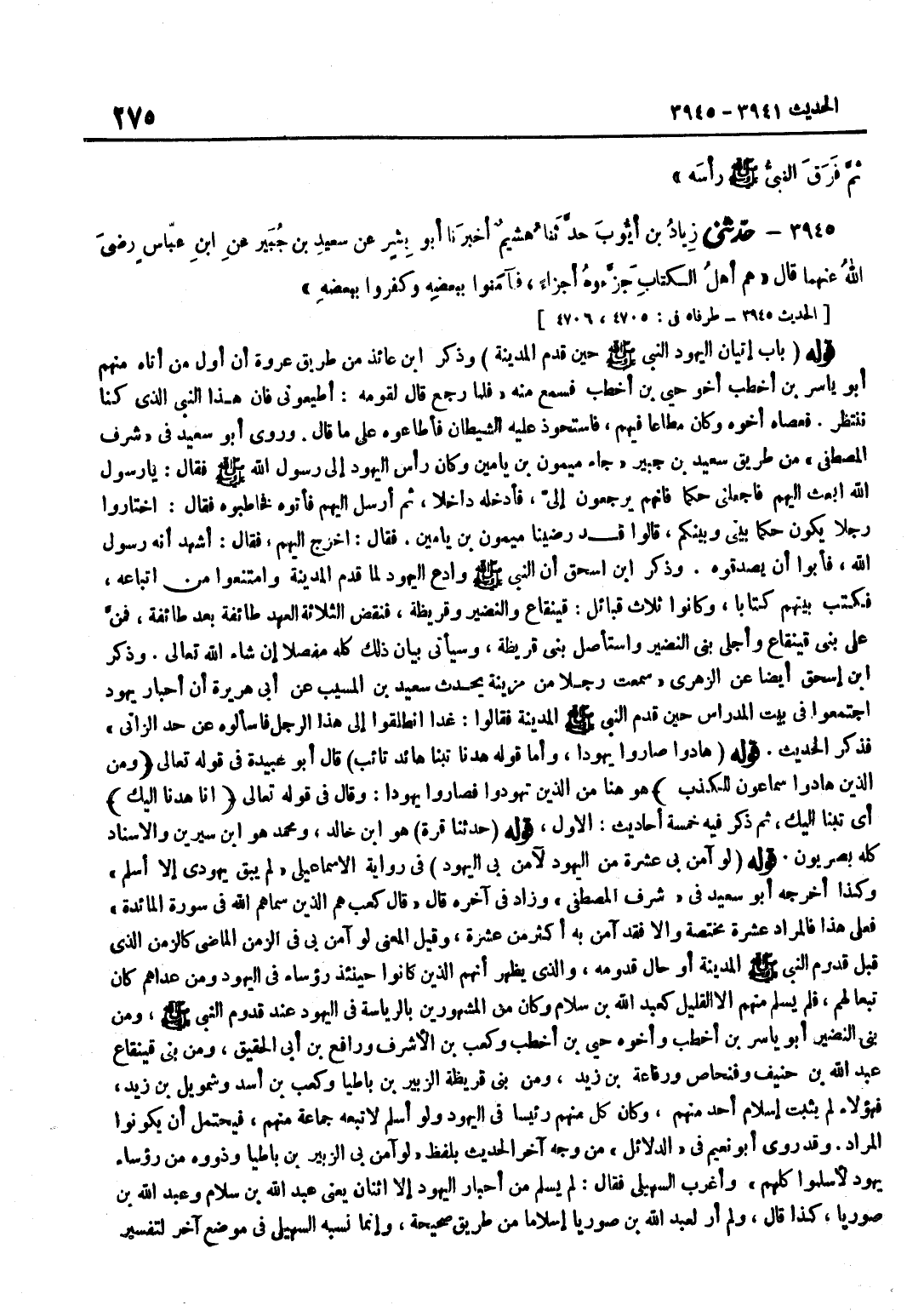 [3941] قَوْله حَدثنَا قُرَّة هُوَ بن خَالِد وَمُحَمّد هُوَ بن سِيرِينَ وَالْإِسْنَادُ كُلُّهُ بَصْرِيُّونَ قَوْلُهُ لَوْ آمَنَ بِي عَشَرَةٌ مِنَ الْيَهُودِ لَآمَنَ بِيَ الْيَهُودُ فِي رِوَايَةِ الْإِسْمَاعِيلِيِّ لَمْ يَبْقَ يَهُودِيٌّ إِلَّا أَسْلَمَ وَكَذَا أَخْرَجَهُ أَبُو سَعِيدٍ فِي شَرَفِ الْمُصْطَفَى وَزَادَ فِي آخِرِهِ قَالَ قَالَ كَعْبٌ هُمُ الَّذِينَ سَمَّاهُمُ اللَّهُ فِي سُورَةِ الْمَائِدَةِ فَعَلَى هَذَا فَالْمُرَادُ عَشَرَةٌ مُخْتَصَّةٌ وَإِلَّا فَقَدْ آمَنَ بِهِ أَكْثَرُ مِنْ عَشَرَةٍ وَقِيلَ الْمَعْنَى لَوْ آمَنَ بِي فِي الزَّمَنِ الْمَاضِي كَالزَّمَنِ الَّذِي قَبْلَ قُدُومِ النَّبِيِّ صَلَّى اللَّهُ عَلَيْهِ وَسَلَّمَ الْمَدِينَةَ أَوْ حَالَ قُدُومِهِ وَالَّذِي يَظْهَرُ أَنَّهُمُ الَّذِينَ كَانُوا حِينَئِذٍ رُؤَسَاءَ فِي الْيَهُودِ وَمَنْ عَدَاهُمْ كَانَ تَبَعًا لَهُمْ فَلَمْ يُسْلِمْ مِنْهُمْ إِلَّا الْقَلِيلُ كَعَبْدِ اللَّهِ بْنِ سَلَامٍ وَكَانَ مِنَ الْمَشْهُورِينَ بِالرِّيَاسَةِ فِي الْيَهُودِ عِنْدَ قُدُومِ النَّبِيِّ صَلَّى اللَّهُ عَلَيْهِ وَسَلَّمَ وَمِنْ بَنِي النَّضِيرِ أَبُو يَاسِرِ بْنِ أَخْطَبَ وَأَخُوهُ حُيَيُّ بْنُ أَخْطَبَ وَكَعْبُ بْنُ الْأَشْرَفِ وَرَافِعُ بْنُ أَبِي الْحَقِيقِ وَمِنْ بَنِي قَيْنُقَاعَ عَبْدُ اللَّهِ بْنُ حَنِيفٍ وَفِنْحَاصُ وَرِفَاعَةُ بْنُ زَيْدٍ وَمِنْ بَنِي قُرَيْظَةَ الزُّبَيْرُ بْنُ بَاطَيَا وَكَعْبُ بْنُ أَسَدٍ وَشَمْوِيلُ بْنُ زَيْدٍ فَهَؤُلَاءِ لَمْ يَثْبُتْ إِسْلَامُ أَحَدٍ مِنْهُمْ وَكَانَ كُلٌّ مِنْهُمْ رَئِيسًا فِي الْيَهُودِ وَلَوْ أَسْلَمَ لَاتَّبَعَهُ جَمَاعَةٌ مِنْهُمْ فَيَحْتَمِلُ أَنْ يَكُونُوا الْمُرَادَ وَقَدْ رَوَى أَبُو نُعَيْمٍ فِي الدَّلَائِلِ مِنْ وَجْهٍ آخَرَ الْحَدِيثَ بِلَفْظِ لَوْ آمَنَ بِي الزُّبَيْرُ بْنُ بَاطَيَا وَذَوُوهُ مِنْ رُؤَسَاءِ يَهُودٍ لَأَسْلَمُوا كُلُّهُمْ وَأَغْرَبَ السُّهَيْلِيُّ فَقَالَ لَمْ يُسْلِمْ مِنْ أَحْبَارِ الْيَهُودِ إِلَّا اثْنَانِ يَعْنِي عَبْدَ اللَّهِ بْنَ سَلَامٍ وَعَبْدَ اللَّهِ بْنَ صُورِيَّا كَذَا قَالَ وَلَمْ أَرَ لِعَبْدِ اللَّهِ بْنِ صُورِيَّا إِسْلَامًا مِنْ طَرِيقٍ صَحِيحَةٍ وَإِنَّمَا نَسَبَهُ السُّهَيْلِيُّ فِي مَوْضِعٍ آخَرَ لِتَفْسِيرِ