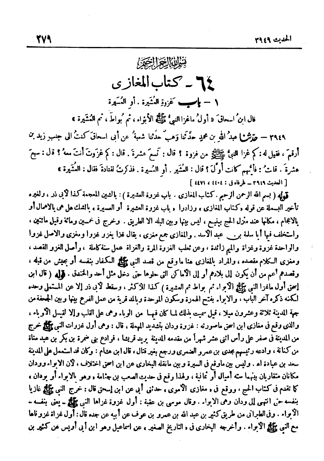 بِالشِّينِ الْمُعْجَمَةِ كَذَا لِأَبِي ذَرٍّ وَلِغَيْرِهِ تَأْخِيرُ الْبَسْمَلَةِ عَنْ قَوْلِهِ كِتَابُ الْمَغَازِي وَزَادُوا بَابُ غَزْوَةِ الْعَشِيرَةِ أَوِ الْعَسِيرَةِ بِالشَّكِّ هَلْ هِيَ بِالْإِهْمَالِ أَوْ بِالْإِعْجَامِ مَكَانُهَا عِنْد منزل الْحَج بينبع لَيْسَ بَيْنَهَا وَبَيْنَ الْبَلَدِ إِلَّا الطَّرِيقُ وَخَرَجَ فِي خَمْسِينَ وَمِائَةٍ وَقِيلَ مِائَتَيْنِ وَاسْتَخْلَفَ فِيهَا أَبَا سَلَمَةَ بْنَ عَبْدِ الْأَسَدِ وَالْمَغَازِي جَمْعُ مَغْزًى يُقَالُ غَزَا يَغْزُو غَزْوًا وَمَغْزًى وَالْأَصْلُ غَزْوًا والواحدة غَزْوَة وغزاة وَالْمِيمُ زَائِدَةٌ وَعَنْ ثَعْلَبٍ الْغَزْوَةُ الْمَرَّةُ وَالْغَزَاةُ عَمَلُ سَنَةٍ كَامِلَةٍ وَأَصْلُ الْغَزْوِ الْقَصْدُ وَمَغْزَى الْكَلَامِ مَقْصِدُهُ وَالْمُرَادُ بِالْمَغَازِي هُنَا مَا وَقَعَ مِنْ قَصْدِ النَّبِيِّ صَلَّى اللَّهُ عَلَيْهِ وَسَلَّمَ الْكُفَّارَ بِنَفْسِهِ أَوْ بِجَيْشٍ مِنْ قِبَلِهِ وَقَصْدُهُمْ أَعَمُّ مِنْ أَنْ يَكُونَ إِلَى بِلَادِهِمْ أَوْ إِلَى الْأَمَاكِنِ الَّتِي حَلُّوهَا حَتَّى دَخَلَ مِثْلُ أحد وَالْخَنْدَق قَوْله قَالَ بن إِسْحَاقَ أَوَّلُ مَا غَزَا النَّبِيُّ صَلَّى اللَّهُ عَلَيْهِ وَسَلَّمَ الْأَبْوَاءُ ثُمَّ بَوَاطُ ثُمَّ الْعَشِيرَةُ كَذَا لِلْأَكْثَرِ وَسَقَطَ لِأَبِي ذَرٍّ إِلَّا عَنِ الْمُسْتَمْلِي وَحْدَهُ لَكِنَّهُ ذَكَرَهُ آخَرَ الْبَابِ وَالْأَبْوَاءُ بِفَتْحِ الْهَمْزَةِ وَسُكُونِ الْمُوَحَّدَةِ وَبِالْمَدِّ قَرْيَةٌ مِنْ عَمَلِ الْفَرْعِ بَيْنَهَا وَبَيْنَ الْجُحْفَةِ مِنْ جِهَةِ الْمَدِينَةِ ثَلَاثَةٌ وَعِشْرُونَ مِيلًا قِيلَ سُمِّيَتْ بِذَلِكَ لِمَا كَانَ فِيهَا مِنَ الْوَبَاءِ وَهِيَ عَلَى الْقَلْبِ وَإِلَّا لَقِيلَ الْأَوْبَاءُ وَالَّذِي وَقَعَ فِي مغازي بن إِسْحَاقَ مَا صُورَتُهُ غَزْوَةُ وَدَّانَ بِتَشْدِيدِ الْمُهْمَلَةِ قَالَ وَهِيَ أَوَّلُ غَزَوَاتِ النَّبِيِّ صَلَّى اللَّهُ عَلَيْهِ وَسَلَّمَ خَرَجَ مِنْ الْمَدِينَةِ فِي صَفَرٍ عَلَى رَأْسِ اثْنَيْ عَشَرَ شَهْرًا مِنْ مَقْدَمِهِ الْمَدِينَةَ يُرِيدُ قُرَيْشًا فَوَادَعَ بَنِي ضَمْرَةَ بْنِ بَكْرِ بْنِ عَبْدِ مَنَاةَ مِنْ كِنَانَةَ وَادَعَهُ رَئِيسُهُمْ مَجْدِي بْنُ عَمْرٍو الضُّمَرِيُّ وَرَجَعَ بِغَيْرِ قتال قَالَ بن هِشَامٍ وَكَانَ قَدِ اسْتَعْمَلَ عَلَى الْمَدِينَةِ سَعْدَ بْنَ عُبَادَةَ اه وَلَيْسَ بَيْنَ مَا وَقَعَ فِي السِّيرَةِ وَبَيْنَ مَا نَقَلَهُ الْبُخَارِيُّ عَنِ بن إِسْحَاقَ اخْتِلَافٌ لِأَنَّ الْأَبْوَاءَ وَوَدَّانَ مَكَانَانِ مُتَقَارِبَانِ بَيْنَهُمَا سِتَّةُ أَمْيَالٍ أَوْ ثَمَانِيَةٌ وَلِهَذَا وَقَعَ فِي حَدِيثِ الصَّعْبِ بْنِ جَثَّامَةَ وَهُوَ بِالْأَبْوَاءِ أَوْ بِوَدَّانَ كَمَا تَقَدَّمَ فِي كِتَابِ الْحَجِّ وَوَقَعَ فِي مَغَازِي الْأُمَوِيِّ حَدَّثَنِي أَبِي عَنِ بن إِسْحَاقَ قَالَ خَرَجَ النَّبِيُّ صَلَّى اللَّهُ عَلَيْهِ وَسَلَّمَ غَازِيًا بِنَفْسِهِ حَتَّى انْتَهَى إِلَى وَدَّانَ وَهِيَ الْأَبْوَاءُ وَقَالَ مُوسَى بْنُ عُقْبَةَ أَوَّلُ غَزْوَةٍ غَزَاهَا النَّبِيُّ صَلَّى اللَّهُ عَلَيْهِ وَسَلَّمَ يَعْنِي بِنَفْسِهِ الْأَبْوَاءُ وَفِي الطَّبَرَانِيِّ مِنْ طَرِيقِ كَثِيرِ بْنِ عَبْدِ اللَّهِ بْنِ عَمْرِو بْنِ عَوْفٍ عَنْ أَبِيهِ عَنْ جَدِّهِ قَالَ أَوَّلُ غزَاة غزوناها مَعَ النَّبِي صلى الله عَلَيْهِ وَسلم الْأَبْوَاءُ وَأَخْرَجَهُ الْبُخَارِيُّ فِي التَّارِيخِ الصَّغِيرِ عَنْ إِسْمَاعِيل وَهُوَ بن أَبِي أُوَيْسٍ عَنْ كَثِيرِ بْنِ