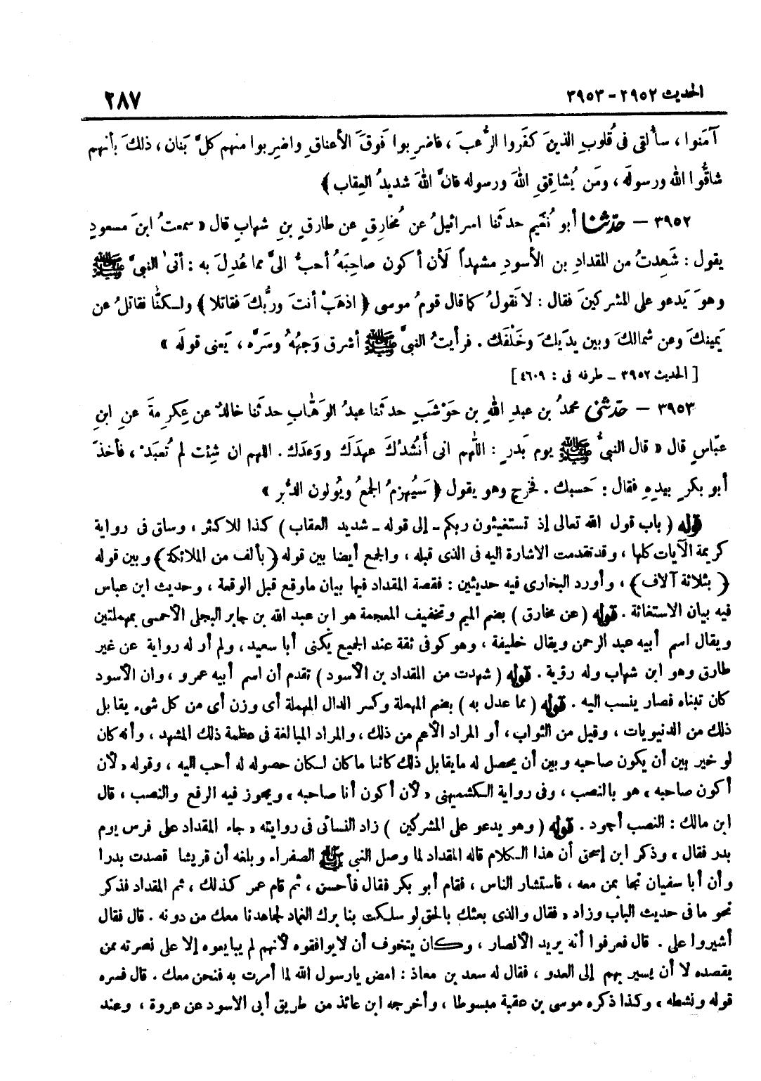 [3952] قَوْلُهُ عَنْ مُخَارِقٍ بِضَم الْمِيم وَتَخْفِيف الْمُعْجَمَة هُوَ بن عَبْدِ اللَّهِ بْنِ جَابِرٍ الْبَجَلِيُّ الْأَحْمَسِيُّ بِمُهْمَلَتَيْنِ وَيُقَالُ اسْمُ أَبِيهِ عَبْدُ الرَّحْمَنِ وَيُقَالُ خَلِيفَةٌ وَهُوَ كُوفِيٌّ ثِقَةٌ عِنْدَ الْجَمِيعِ يُكَنَّى أَبَا سَعِيدٍ وَلَمْ أَرَ لَهُ رِوَايَةً عَنْ غَيْرِ طَارق وَهُوَ بن شِهَابٍ وَلَهُ رُؤْيَةٌ قَوْلُهُ شَهِدْتُ مِنَ الْمِقْدَادِ بْنِ الْأَسْوَدِ تَقَدَّمَ أَنَّ اسْمَ أَبِيهِ عَمْرٌو وَأَنَّ الْأَسْوَدَ كَانَ تَبَنَّاهُ فَصَارَ يُنْسَبُ إِلَيْهِ قَوْلُهُ مِمَّا عُدِلَ بِهِ بِضَمِّ الْمُهْمَلَةِ وَكَسْرِ الدَّالِ الْمُهْمَلَةِ أَيْ وُزِنَ أَيْ مِنْ كُلِّ شَيْءٍ يُقَابِلُ ذَلِكَ مِنَ الدُّنْيَوِيَّاتِ وَقِيلَ مِنَ الثَّوَابِ أَوِ الْمُرَادُ الْأَعَمُّ مِنْ ذَلِكَ وَالْمُرَادُ الْمُبَالَغَةُ فِي عَظَمَةِ ذَلِكَ الْمَشْهَدِ وَأَنَّهُ كَانَ لَوْ خُيِّرَ بَيْنَ أَنْ يَكُونَ صَاحِبَهُ وَبَيْنَ أَنْ يَحْصُلَ لَهُ مَا يُقَابِلُ ذَلِكَ كَائِنًا مَا كَانَ لَكَانَ حُصُولُهُ لَهُ أَحَبَّ إِلَيْهِ وَقَوْلُهُ لَأَنْ أَكُونَ صَاحِبَهُ هُوَ بِالنَّصْبِ وَفِي رِوَايَةِ الْكُشْمِيهَنِيِّ لَأَنْ أَكُونَ أَنَا صَاحِبَهُ وَيَجُوزُ فِيهِ الرّفْع وَالنّصب قَالَ بن مَالِكٍ النَّصْبُ أَجْوَدُ قَوْلُهُ وَهُوَ يَدْعُو عَلَى الْمُشْرِكِينَ زَادَ النَّسَائِيُّ فِي رِوَايَتِهِ جَاءَ الْمِقْدَادُ على فرس يَوْم بدر فَقَالَ وَذكر بن إِسْحَاقَ أَنَّ هَذَا الْكَلَامَ قَالَهُ الْمِقْدَادُ لَمَّا وَصَلَ النَّبِيُّ صَلَّى اللَّهُ عَلَيْهِ وَسَلَّمَ الصَّفْرَاءَ وَبَلَغَهُ أَنَّ قُرَيْشًا قَصَدَتْ بَدْرًا وَأَنَّ أَبَا سُفْيَانَ نَجَا بِمَنْ مَعَهُ فَاسْتَشَارَ النَّاسَ فَقَامَ أَبُو بَكْرٍ فَقَالَ فَأَحْسَنَ ثُمَّ قَامَ عُمَرُ كَذَلِكَ ثُمَّ الْمِقْدَادُ فَذَكَرَ نَحْوَ مَا فِي حَدِيثِ الْبَابِ وَزَادَ فَقَالَ وَالَّذِي بَعَثَكَ بِالْحَقِّ لَوْ سَلَكْتَ بِنَا بَرْكَ الْغِمَادِ لَجَاهَدْنَا مَعَكَ مِنْ دُونِهِ قَالَ فَقَالَ أَشِيرُوا عَلَيَّ قَالَ فَعَرَفُوا أَنَّهُ يُرِيدُ الْأَنْصَارَ وَكَانَ يَتَخَوَّفُ أَنْ لَا يُوَافِقُوهُ لِأَنَّهُمْ لَمْ يُبَايِعُوهُ إِلَّا عَلَى نُصْرَتِهِ مِمَّنْ يَقْصِدُهُ لَا أَنْ يَسِيرَ بِهِمْ إِلَى الْعَدُوِّ فَقَالَ لَهُ سَعْدُ بْنُ مُعَاذٍ امْضِ يَا رَسُولَ اللَّهِ لِمَا أُمِرْتَ بِهِ فَنَحْنُ مَعَكَ قَالَ فَسَّرَهُ قَوْلُهُ وَنَشَّطَهُ وَكَذَا ذكره مُوسَى بن عقبَة مَبْسُوطا وَأخرجه بن عَائِذٍ مِنْ طَرِيقِ أَبِي الْأَسْوَدِ عَنْ عُرْوَةَ وَعند